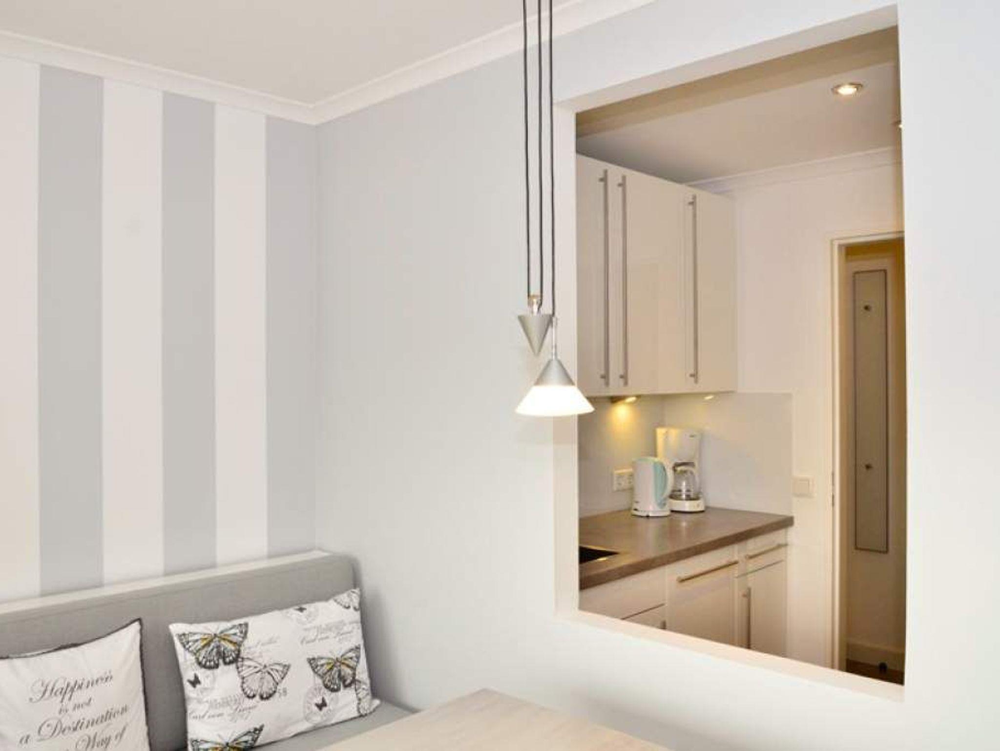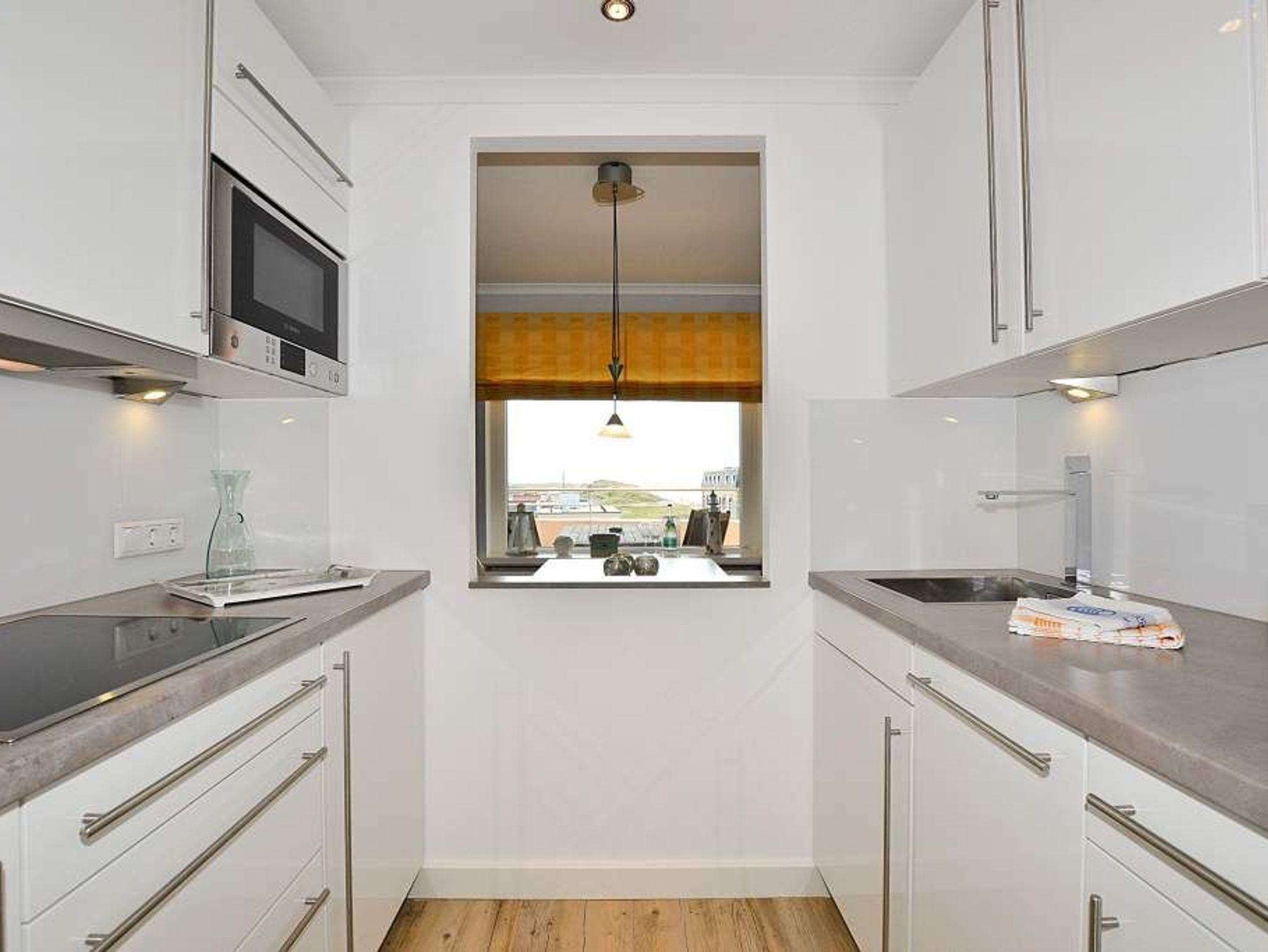 Die Küche ist zum Wohnzimmer hin halb geöffnet, so das Sie auch von der Küche und vom Flur aus, das Meer sehen können.