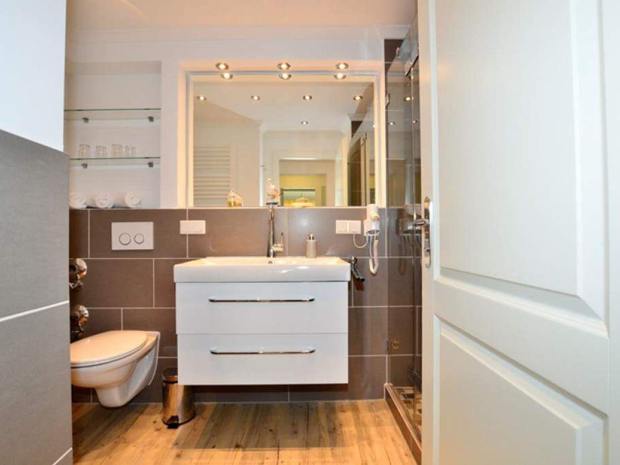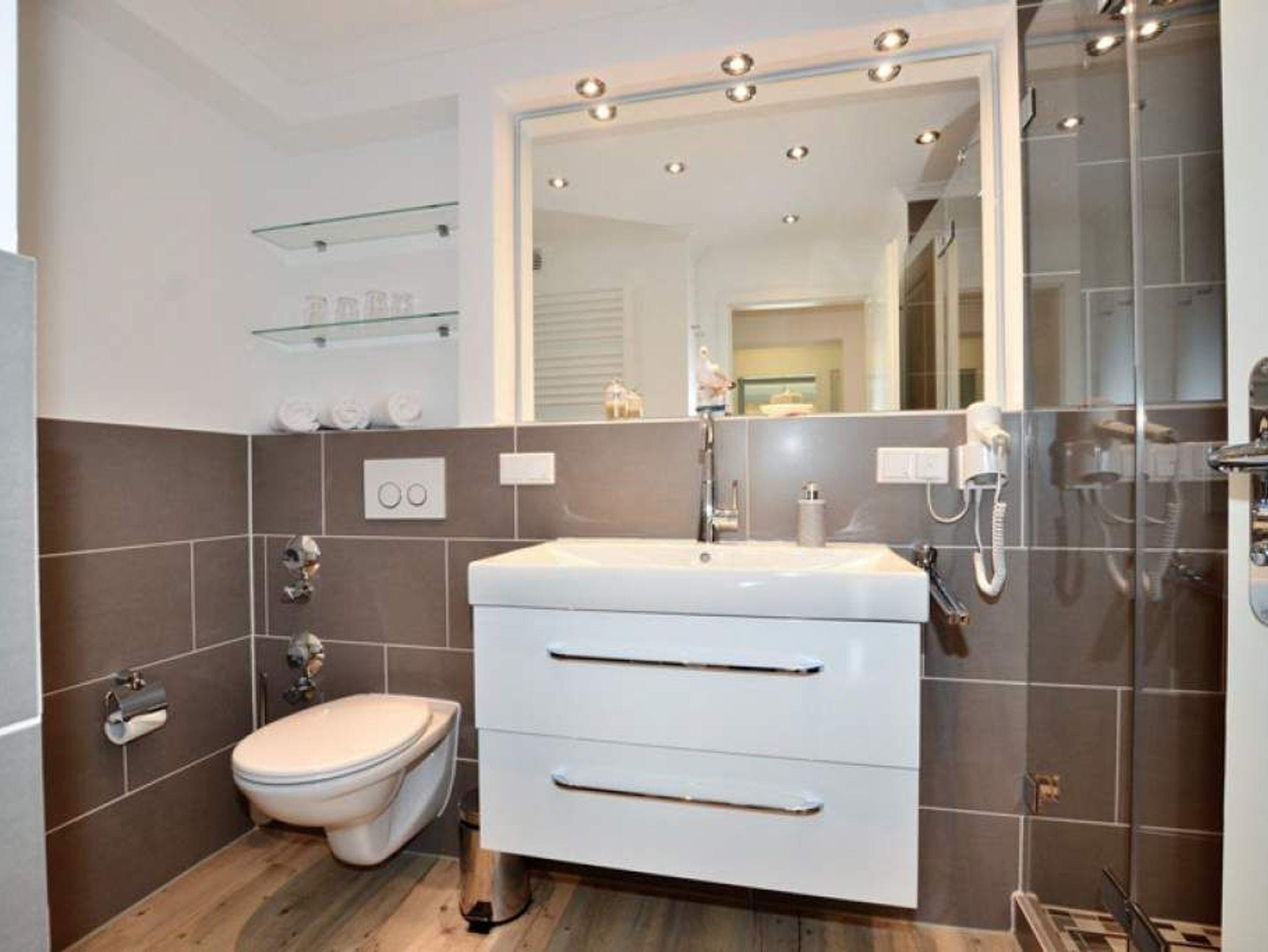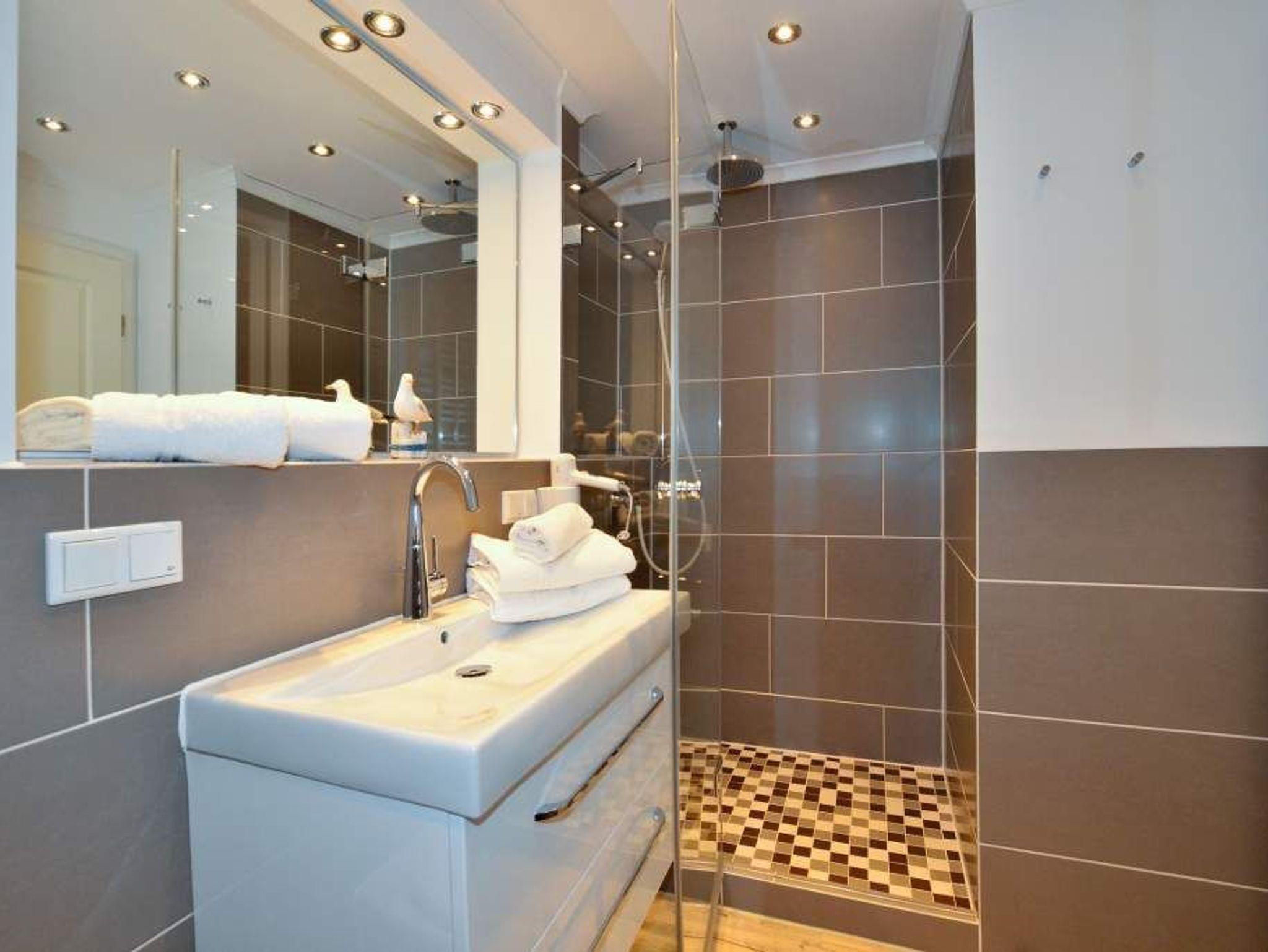 Das[nbsp] Duschbad/WC mit Fußbodenheizung hat einen Waschtisch, Handtuchtrockner, Fön, Kosmetikspiegel und WC.