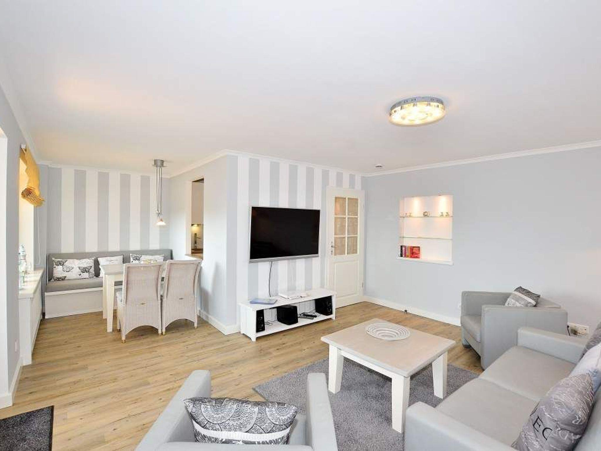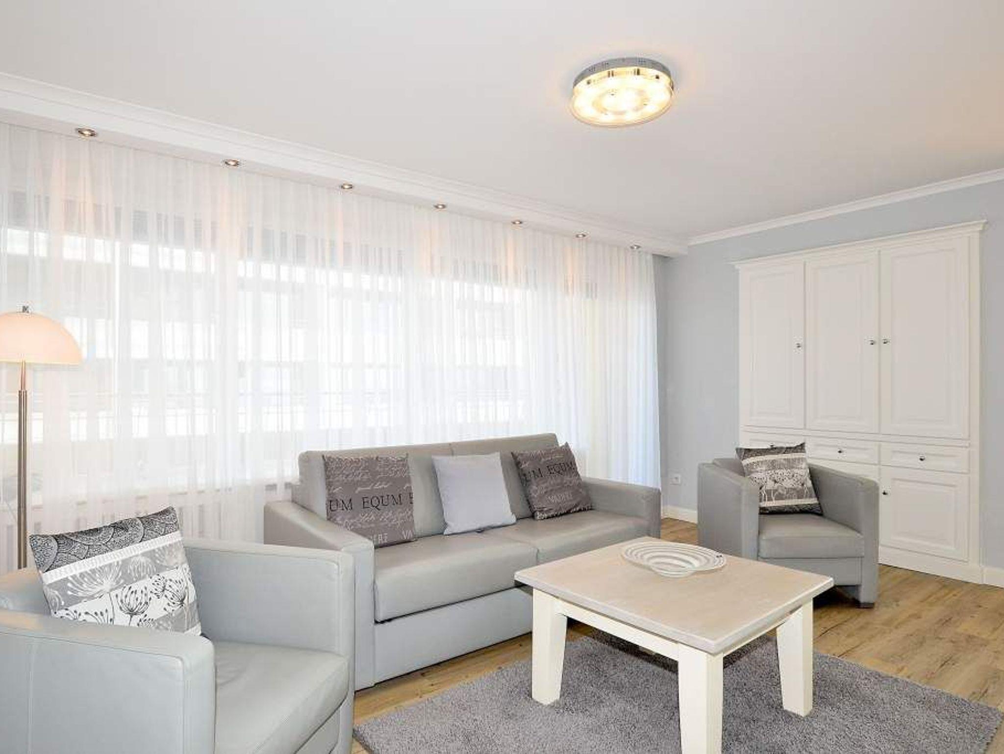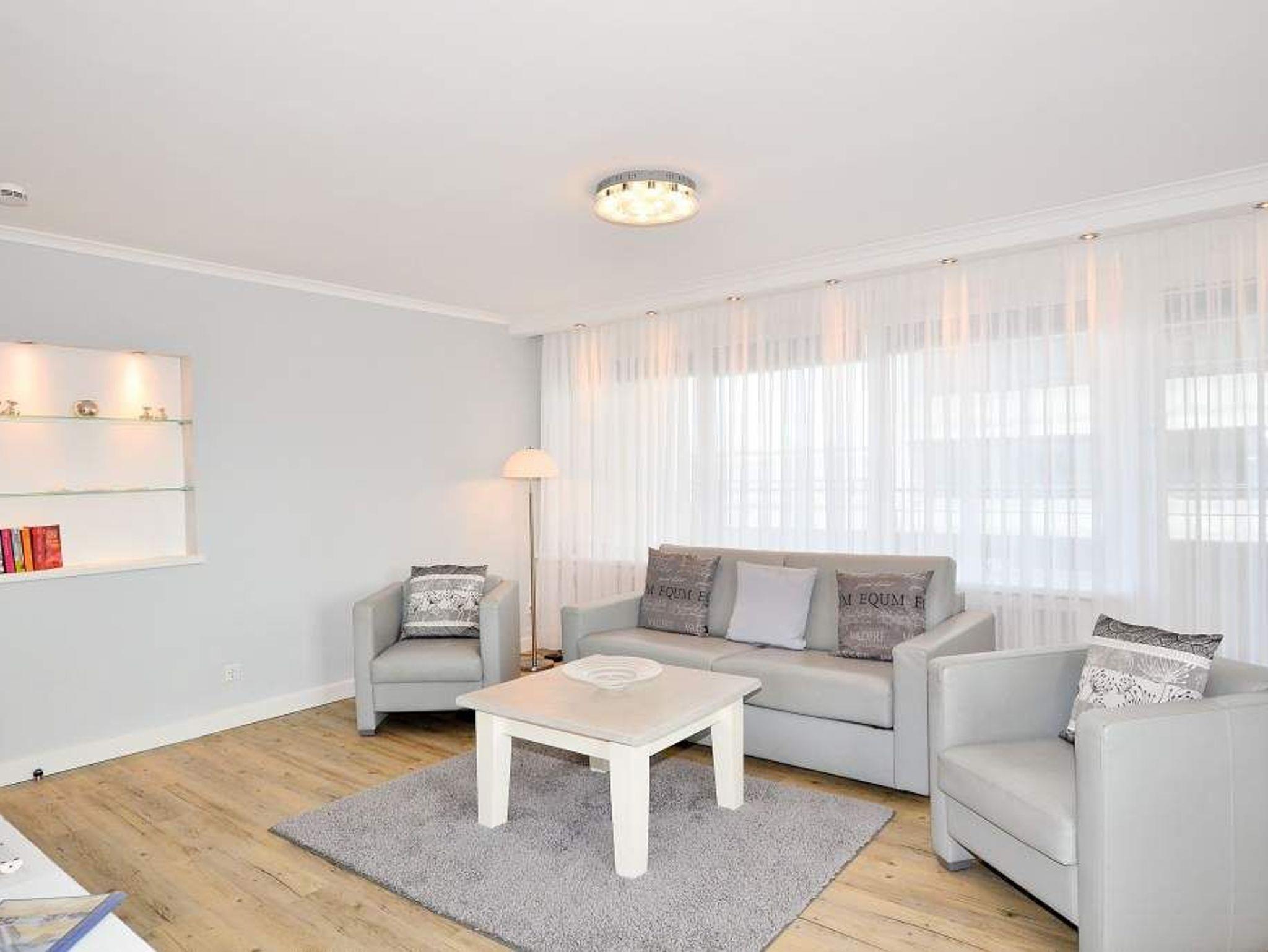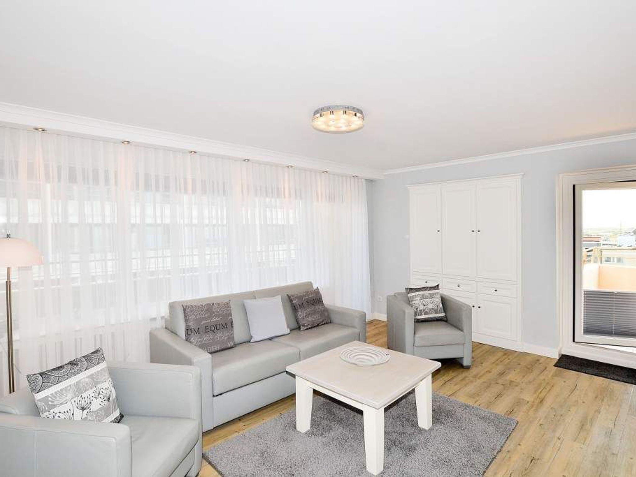 Der lichtdurchflutete Wohnraum bietet Zugang zum großzügigen, geschützten Südwestbalkon (mit Balkonmöbeln und Auflagen) und zur Ostloggia. Er ist mit einer hochwertigen Couchgarnitur von Bielefelder Werkstätten (1 Doppelschlafsofa [&] 2 Sessel), gemütlichem Essplatz, XXL-Kabel-Flachbild-TV mit einer Bildschirmdiagonale von 139 cm, DVD-Player, Radio-CD-Player.