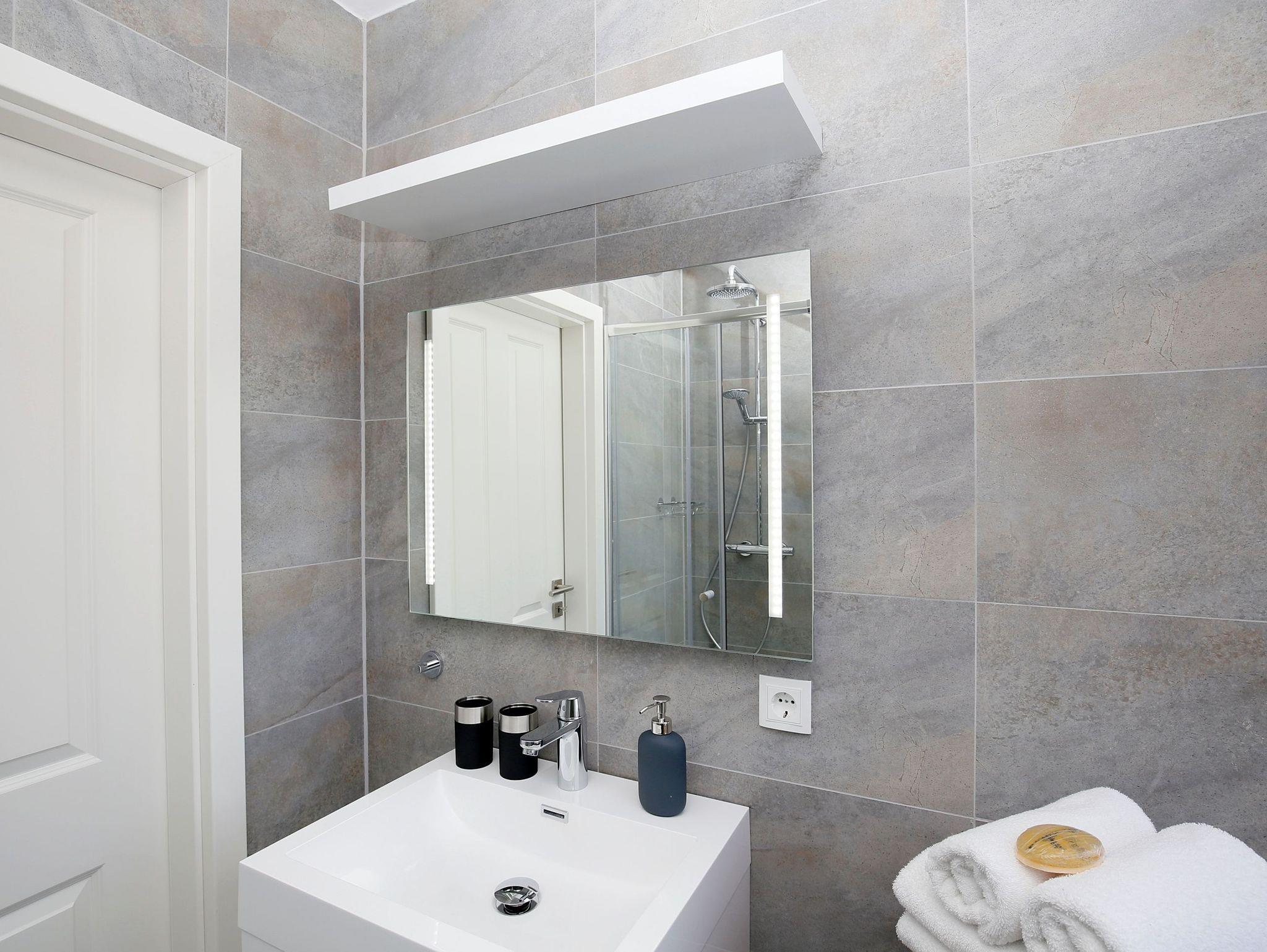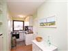 Die offene Küche bietet einen Geschirrspüler, ein 4-Platten-Ceranfeld, einen Backofen sowie einen Kühlschrank mit 3-Sterne-Gefrierfach. Zur Grundausstattung gehören außerdem Kaffeemaschine, Wasserkocher und Toaster.