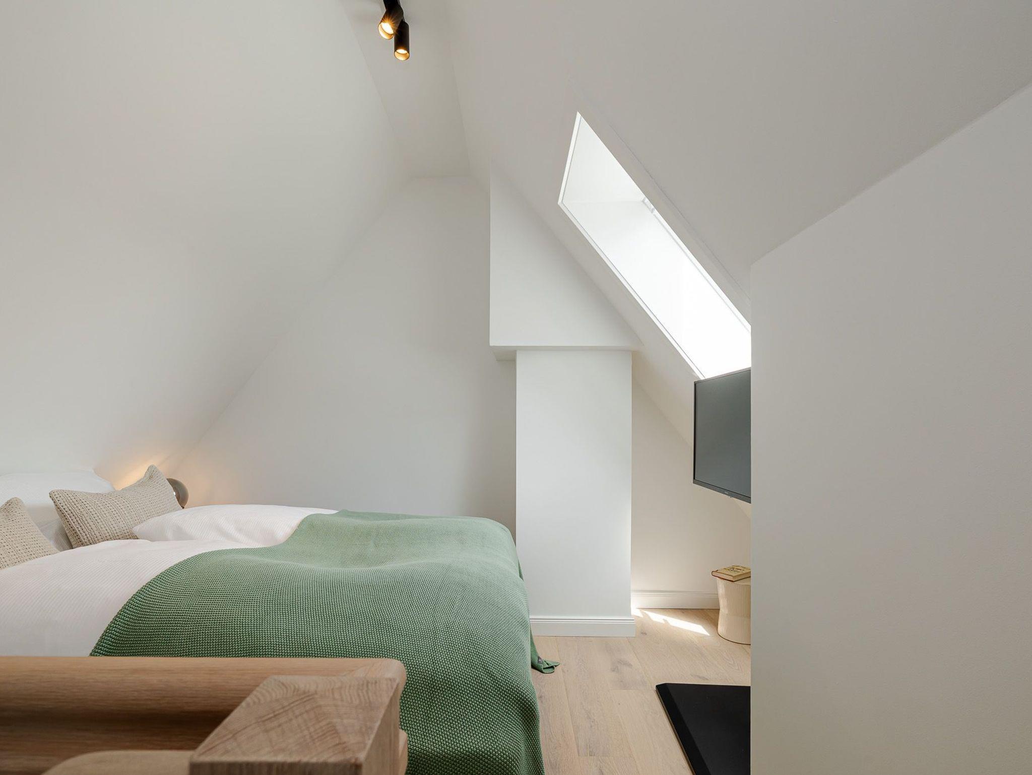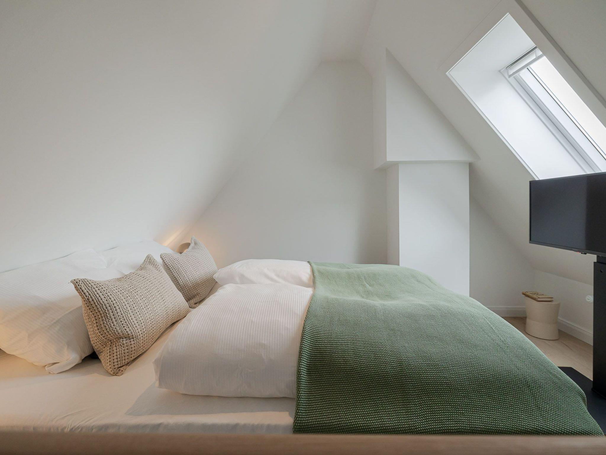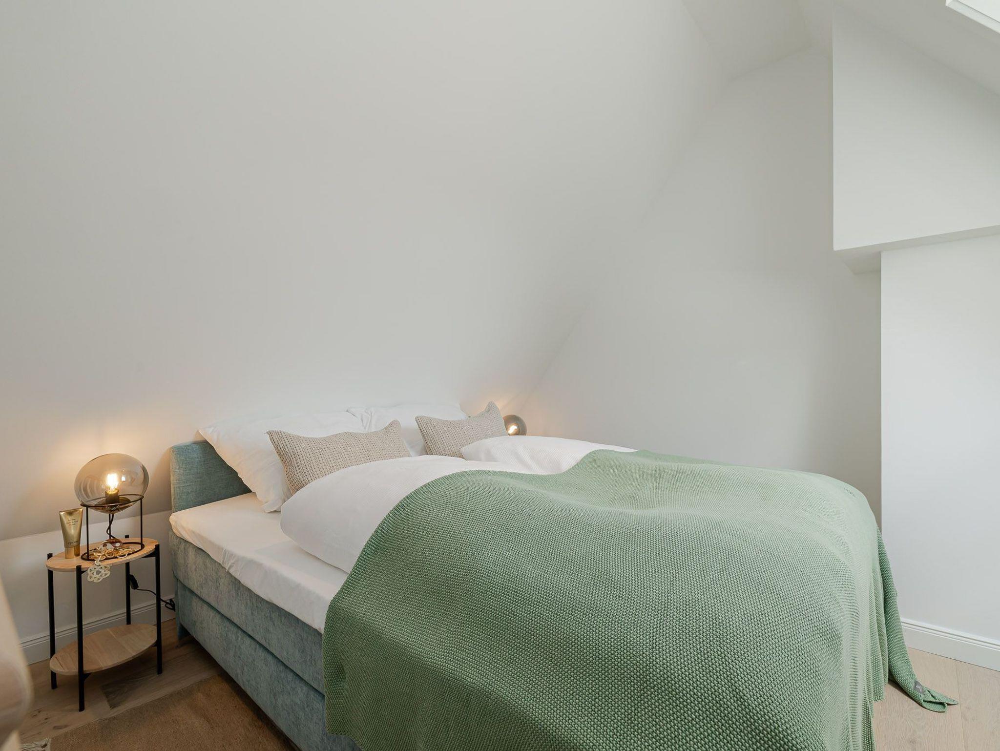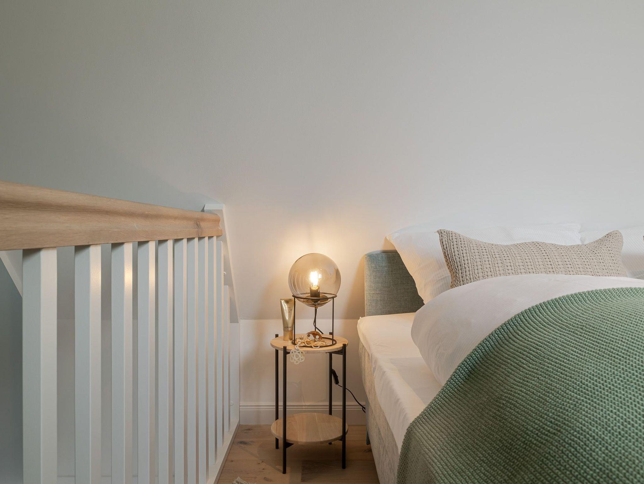 Weiter geht es - über die Treppe gelangen Sie nun auf das kuschelige Oberdeck, wo Sie in einem bequemen Schramm-Boxspringbett vom nächsten Tag träumen können.