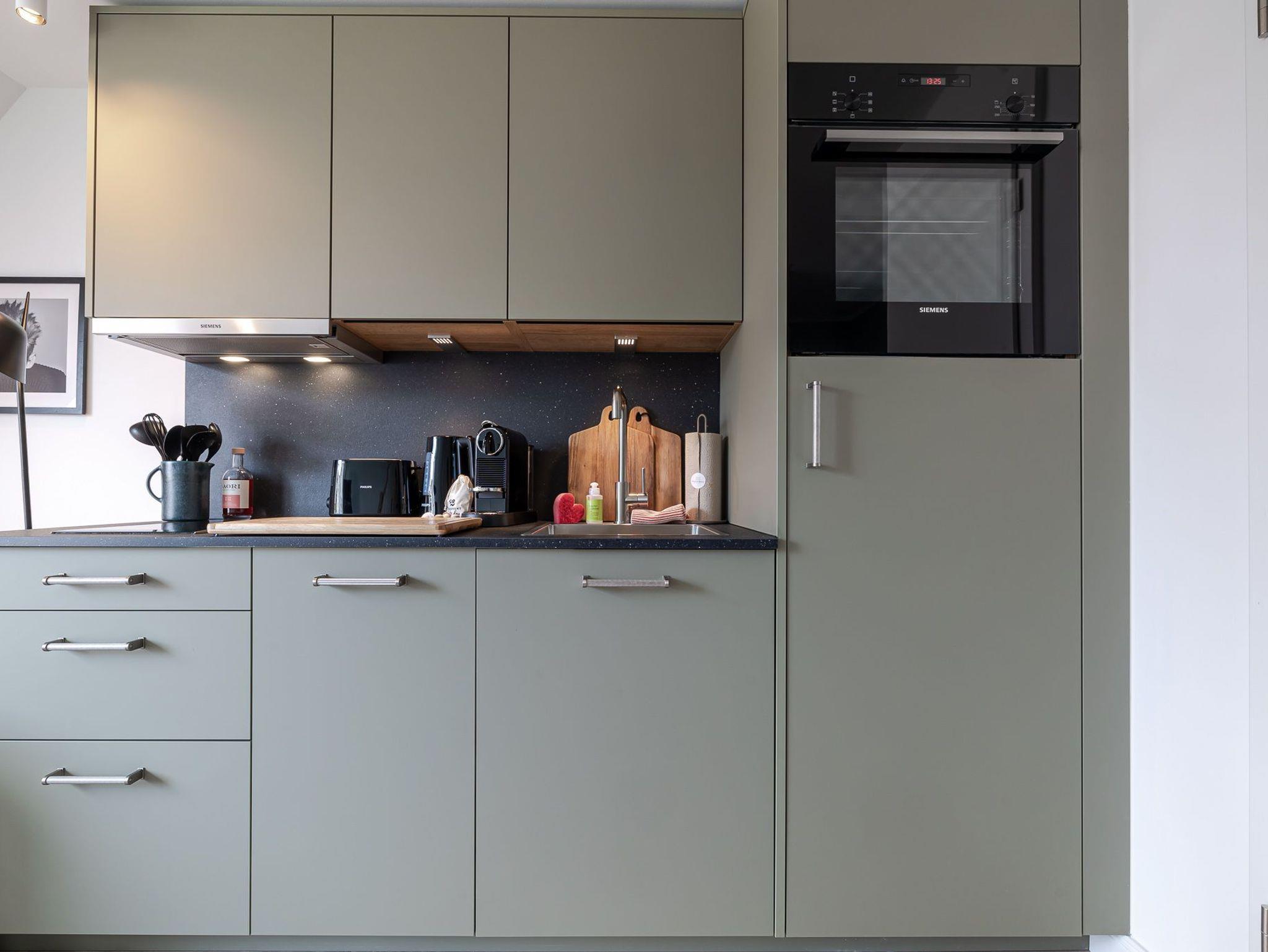 Rechter Hand befindet sich ein kleines, aber feines, Kochparadies in der Sie ihren Künsten freien Lauf lassen können. Es ist ausgestattet mit Markengeräten, z.B.von Miele und allerlei wichtigen Utensilien, die man für die Zubereitung eines perfekten Frühstücks oder Dinners benötigt.