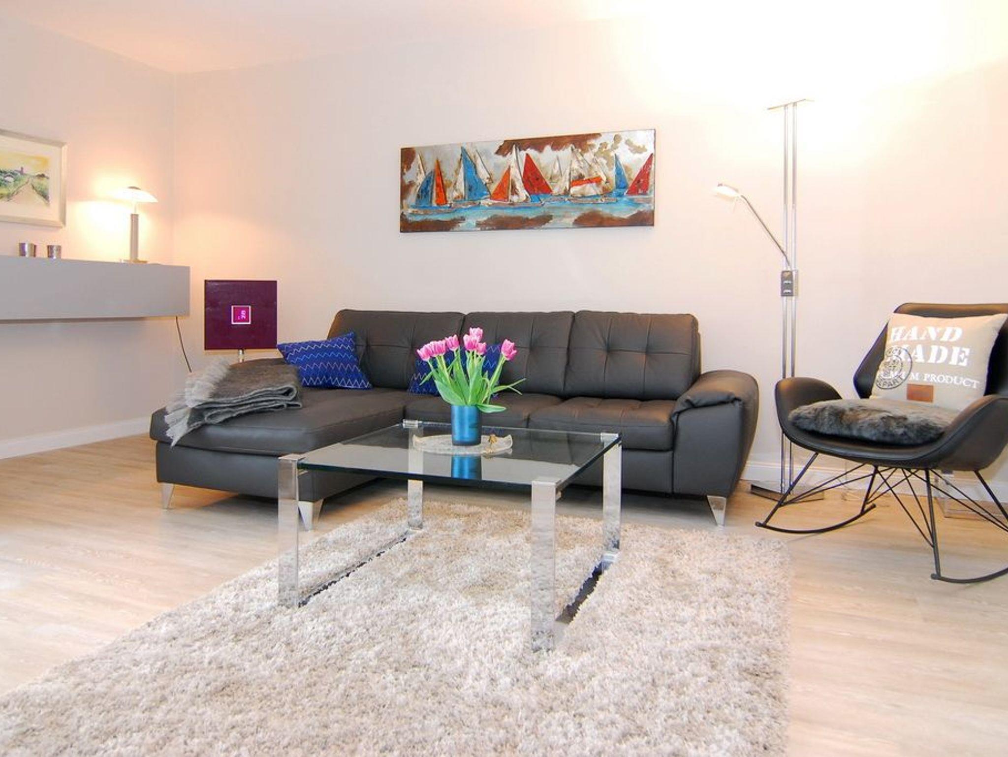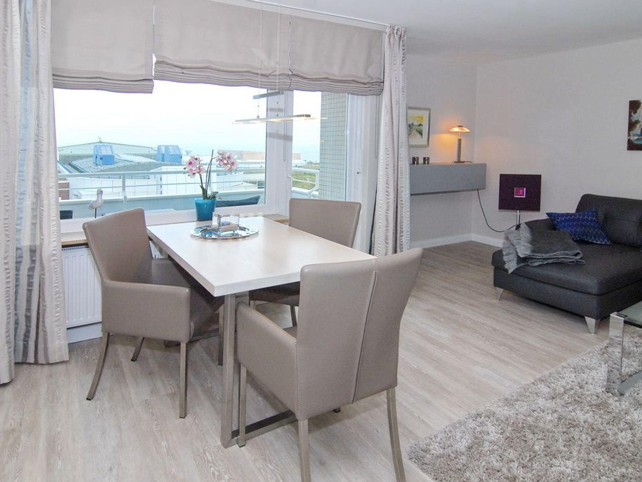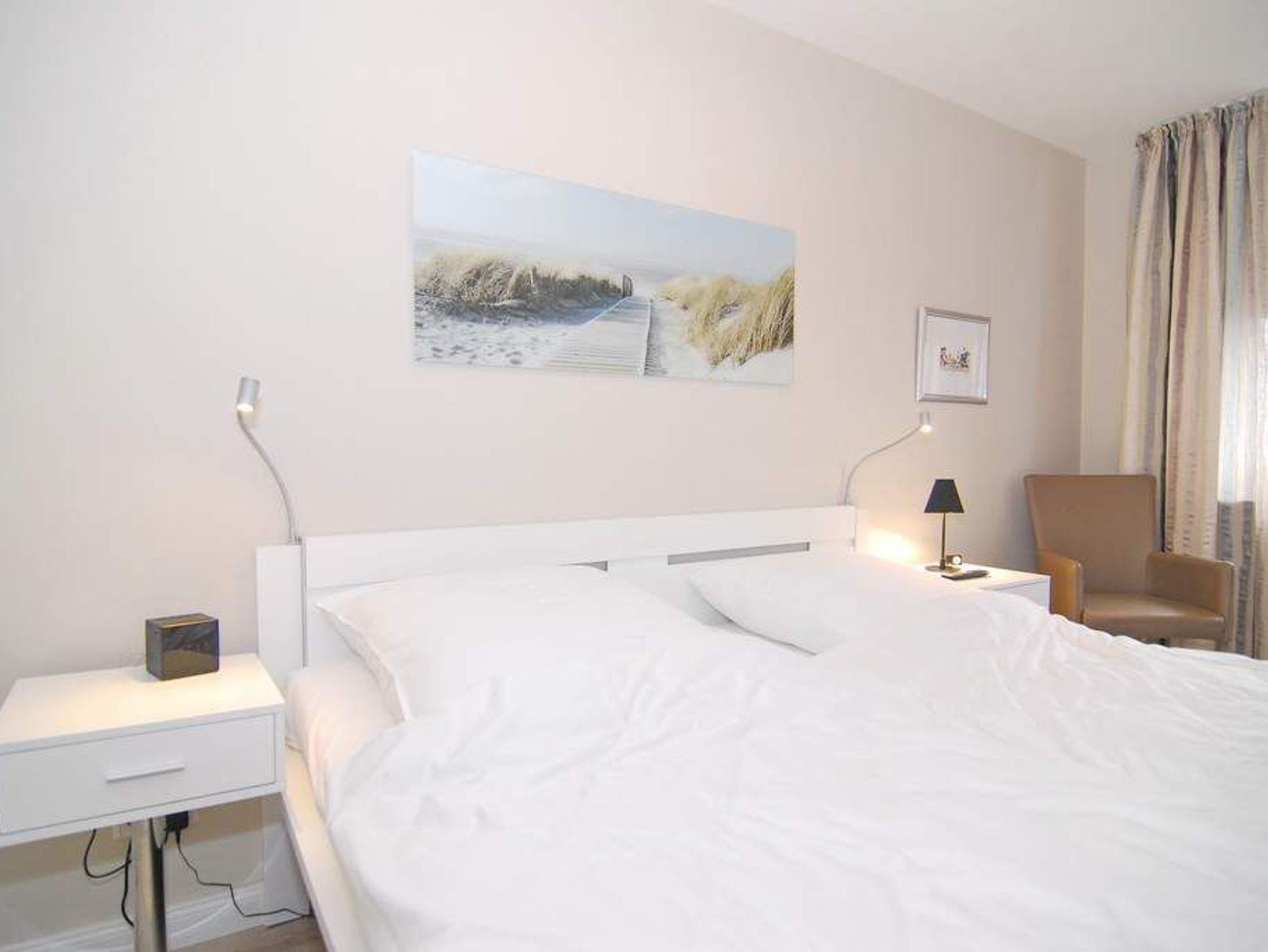 Exklusives 2-Zimmer-Apartment zur Seeseite im Haus Atlantik, ca. 55 m², 4. OG, für max. 2 Personen und 1 Kind,[nbsp][nbsp]Nichtraucher. Wohnzimmer mit Couchecke und Sessel, Essplatz am Fenster mit Blick auf das Meer, Flat-TV, DVD, Stereoanlage mit Ipodstation, W-LAN (ohne Gewähr), Westbalkon mit Balkonmöbel, Schlafzimmer mit Doppelbett (180x200 ), Einbauschrank und Flat-TV, kleine Küche mit Geschirrspüler, Mikrowelle sowie einem Ceranfeld mit zwei Kochfeldern, Duschbad/WC. Das Appartement ist mit Design-Fußboden ausgelegt. Tierhaltung ist nicht gestattet. Bettwäsche und Handtücher sind zur Anreise aufgezogen. PKW-Stellplatz kann kostenpflichtig bestellt werden.