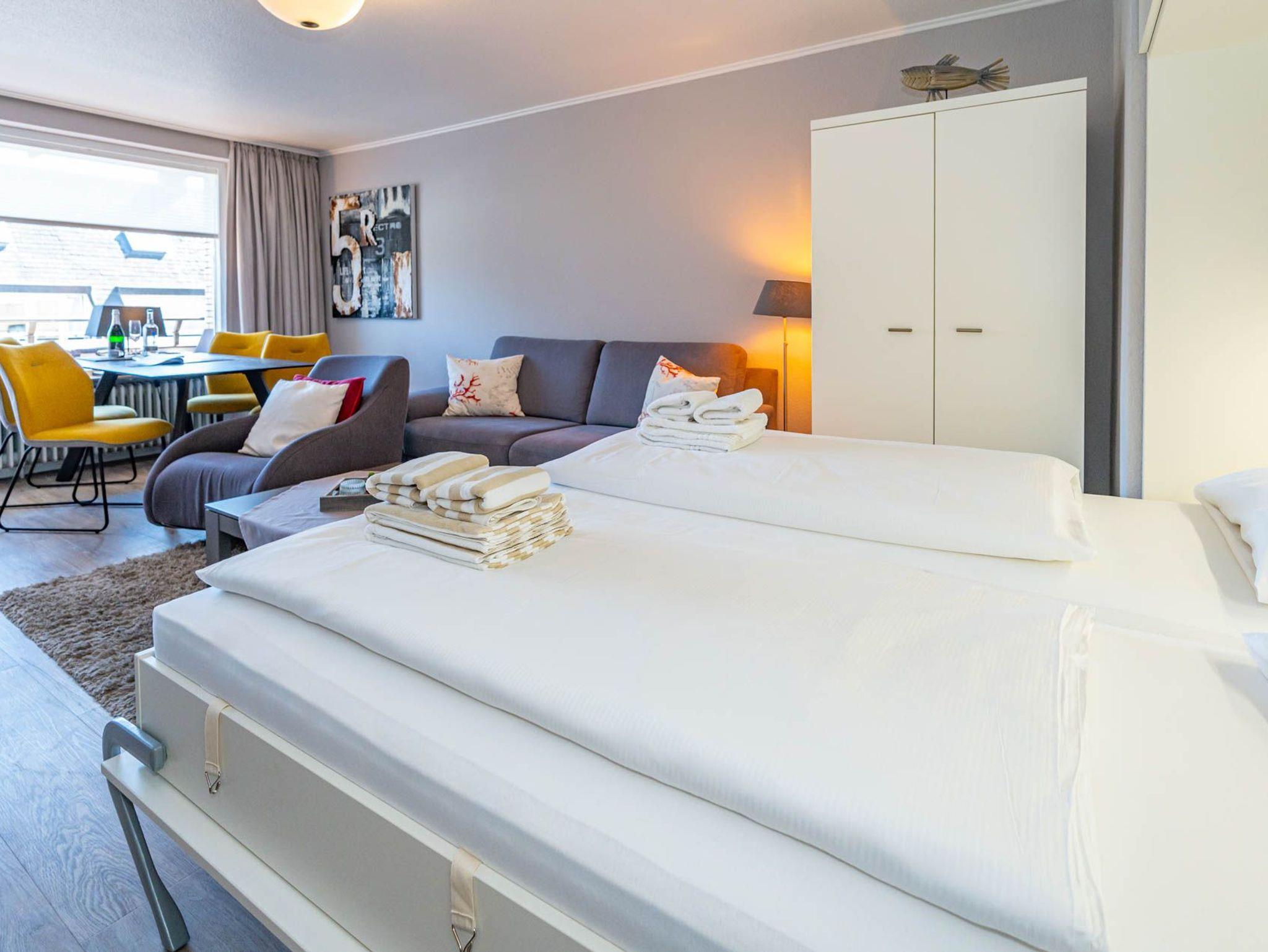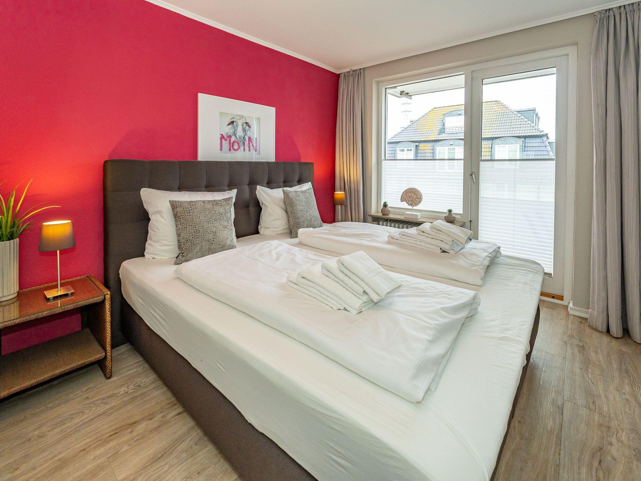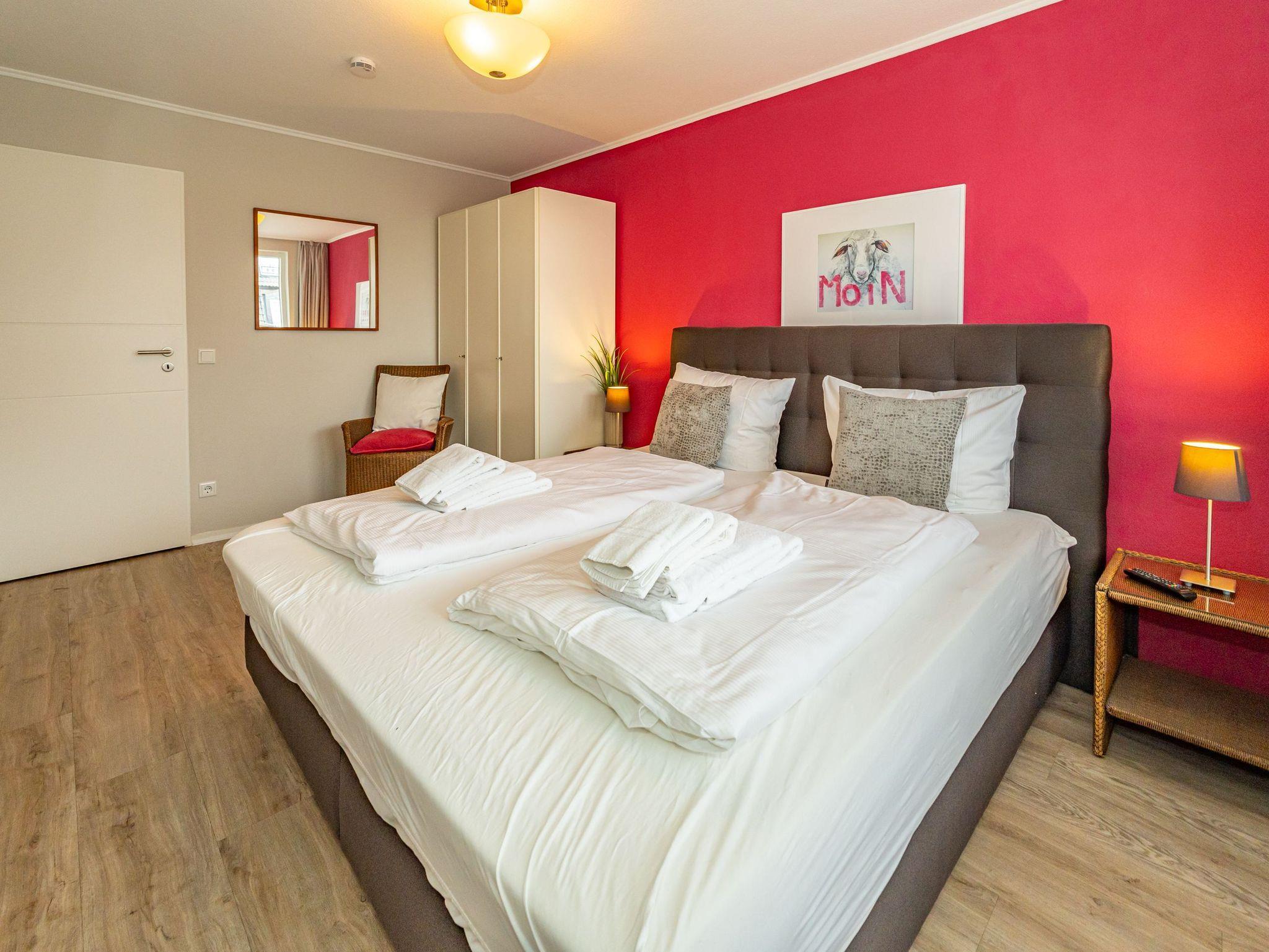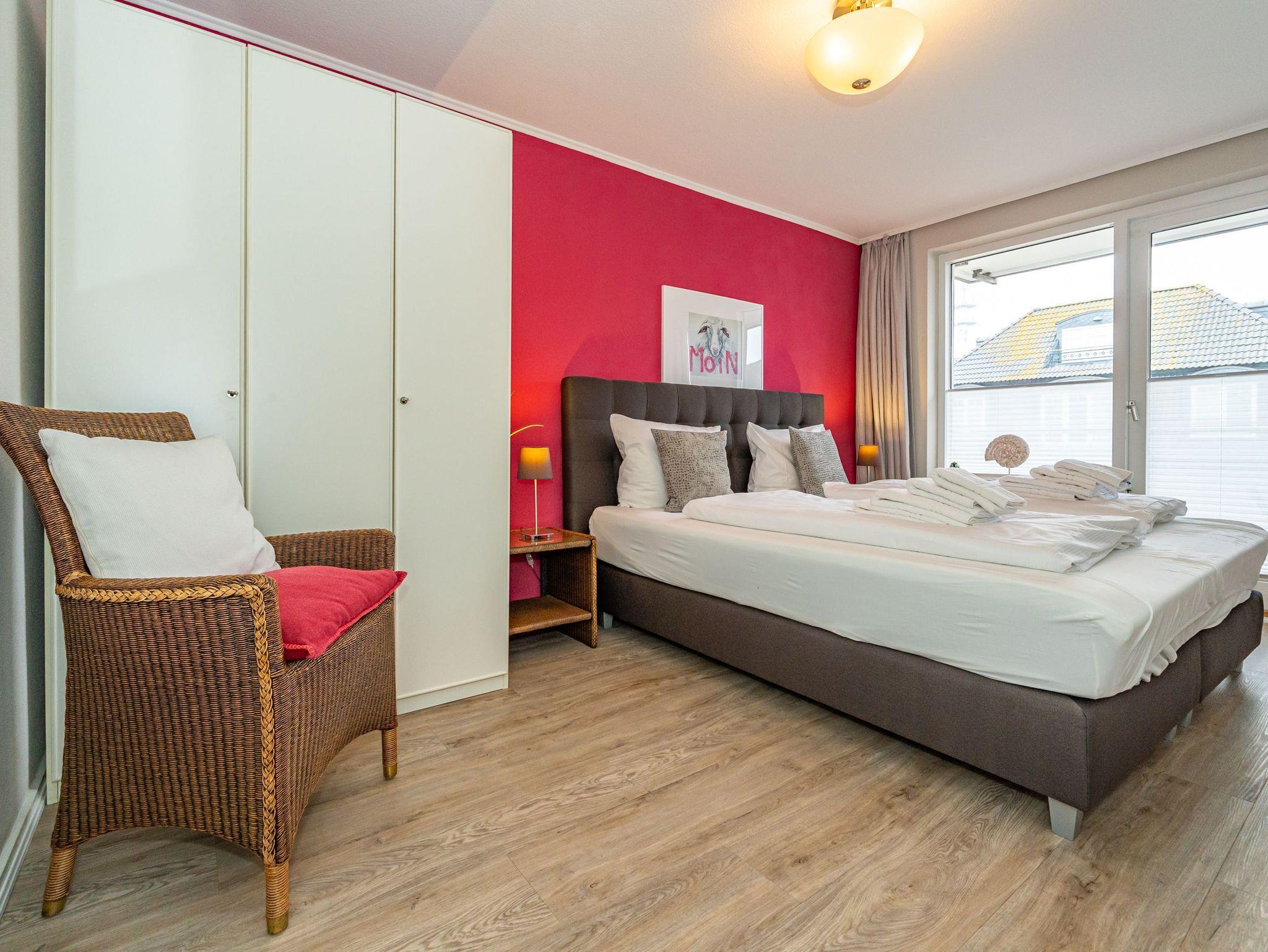 Diese moderne 2-Zimmer-Nichtraucher-Ferienwohnung (ca. 58 qm) in der 2. Etage bietet komfortablen Wohnraum für bis zu 4 Personen. Im Schlafzimmer erwartet Sie ein gemütliches Doppelbett, bestehend aus zwei Einzelmatratzen (je 0,90 x 2,00 m), ergänzt durch stilvolle Nachttische und einen eleganten Sessel in Loom-Ausführung. Das Wohnzimmer überzeugt mit Doppelschrankbetten (je mit Einzelmatratzen von 1,70 x 0,90 m), einem Sat-Flachbild-TV, Telefon und WLAN ? ideal für flexible Schlafmöglichkeiten und entspannte Abende. Die offene Küche, die ohne trennende Tür direkt in den Wohnbereich integriert ist und über ein Fenster verfügt, lässt keine Wünsche offen: Ausgestattet mit Backofen, Cerankochfeld, Kühlschrank mit Eisfach, Geschirrspüler, Kaffeemaschine, Wasserkocher und Toaster, bietet sie alles, was Sie für die Zubereitung Ihrer Lieblingsgerichte benötigen. Das moderne Duschbad/WC rundet das Raumkonzept ab.