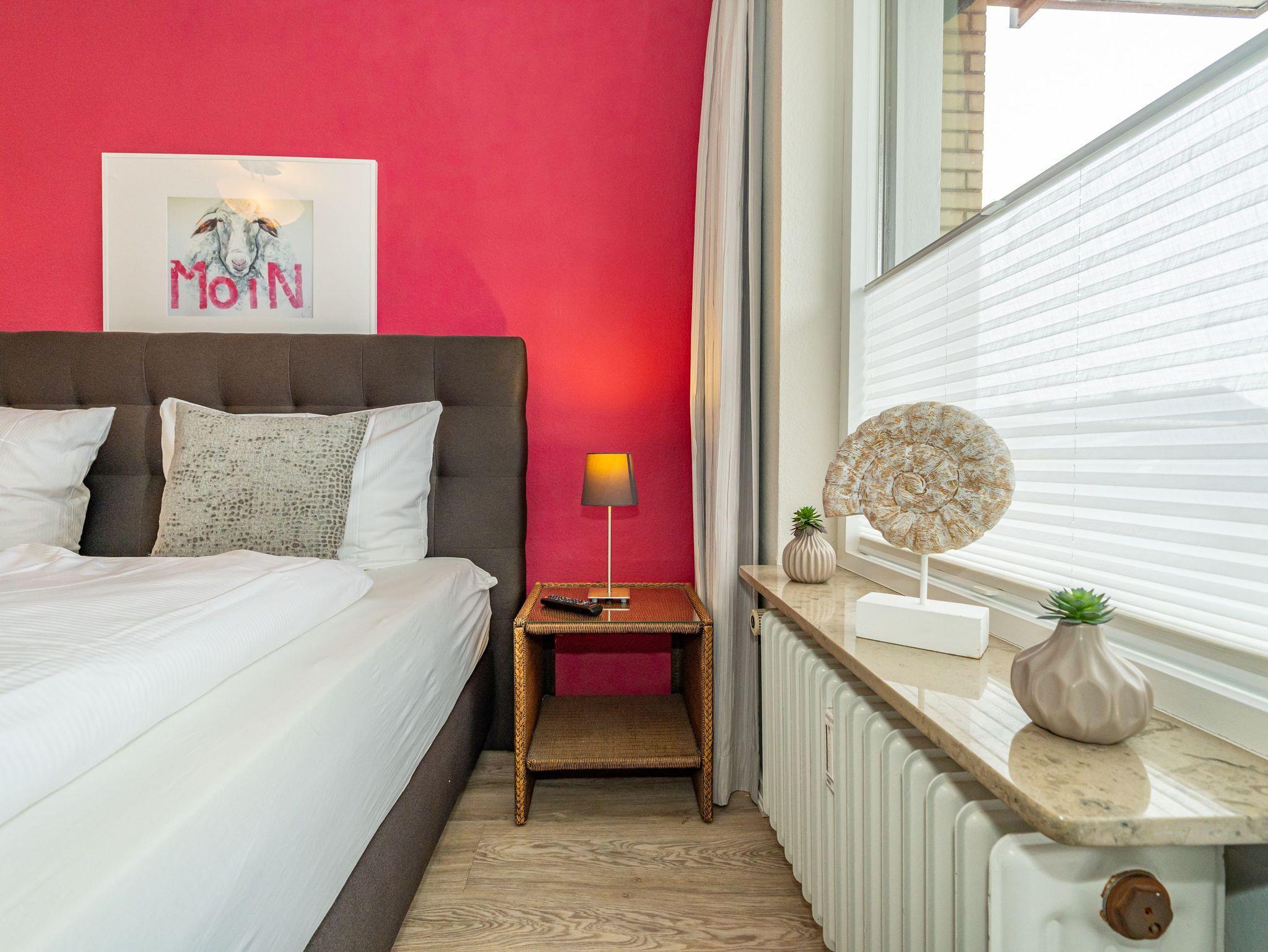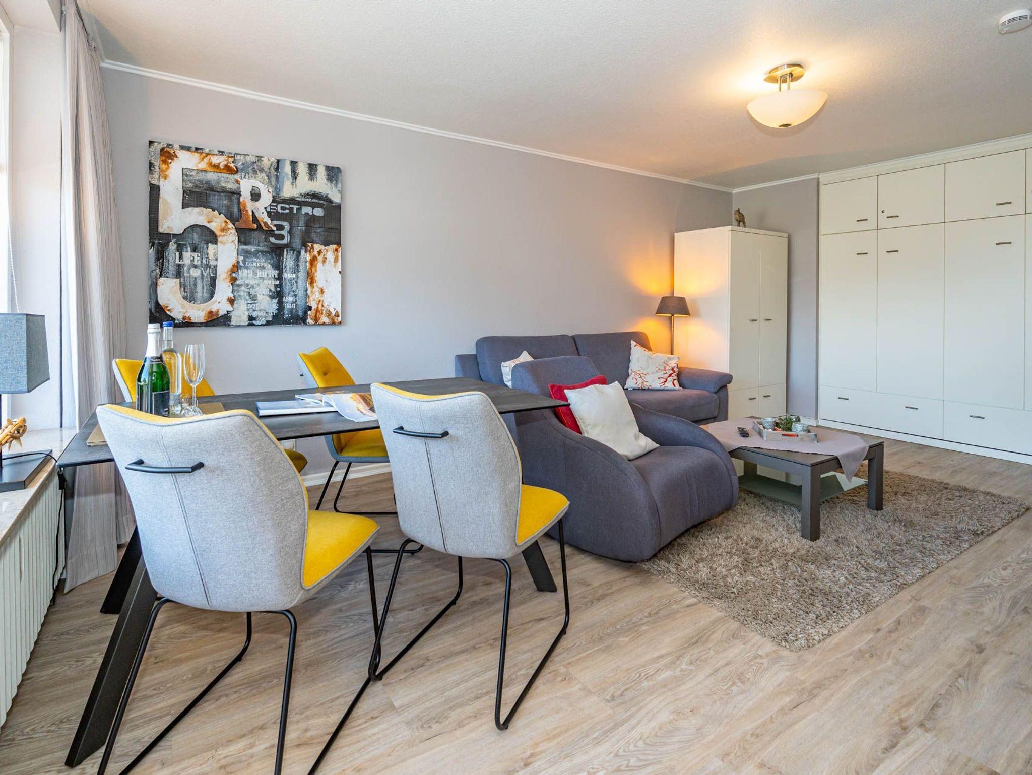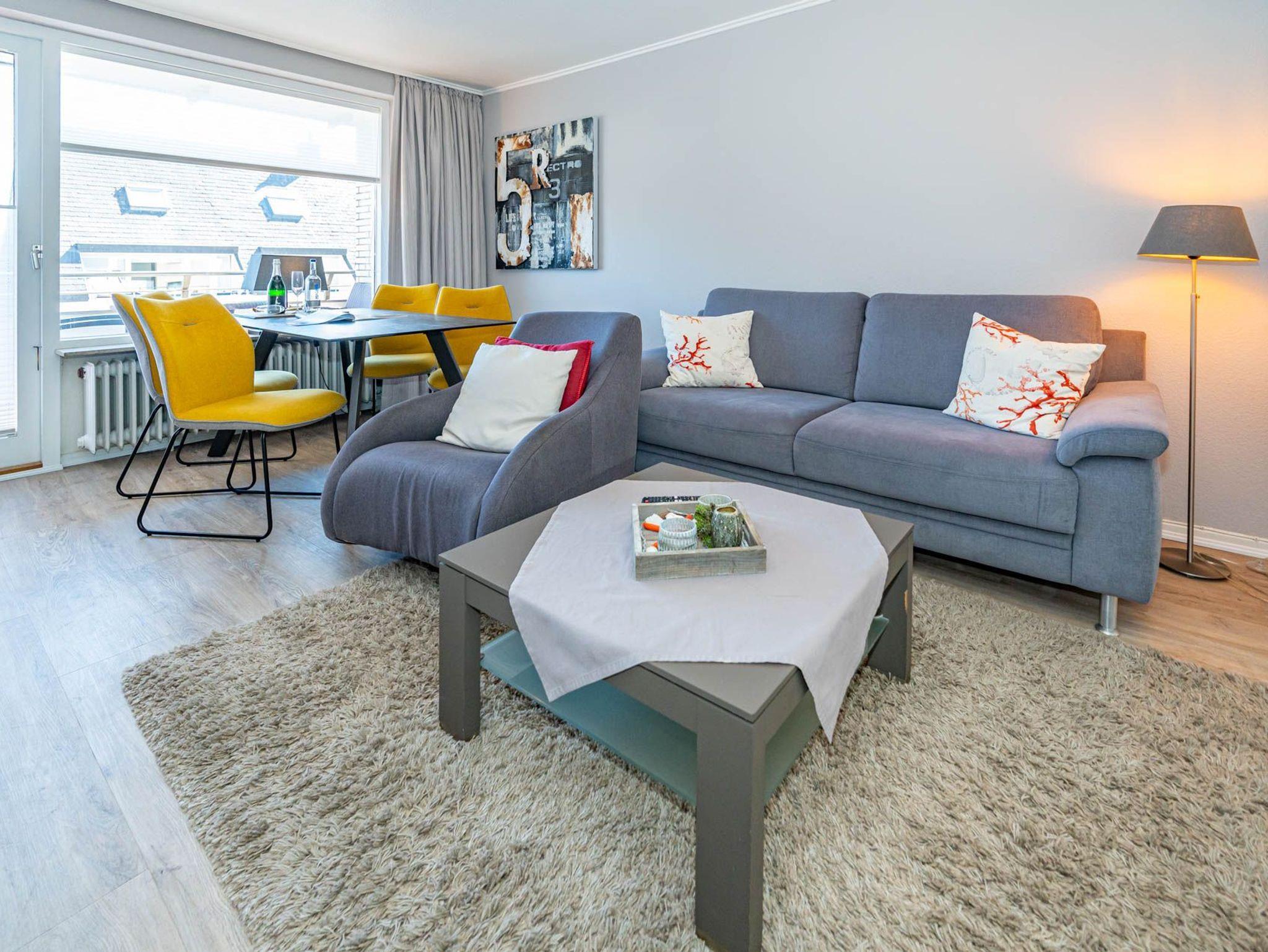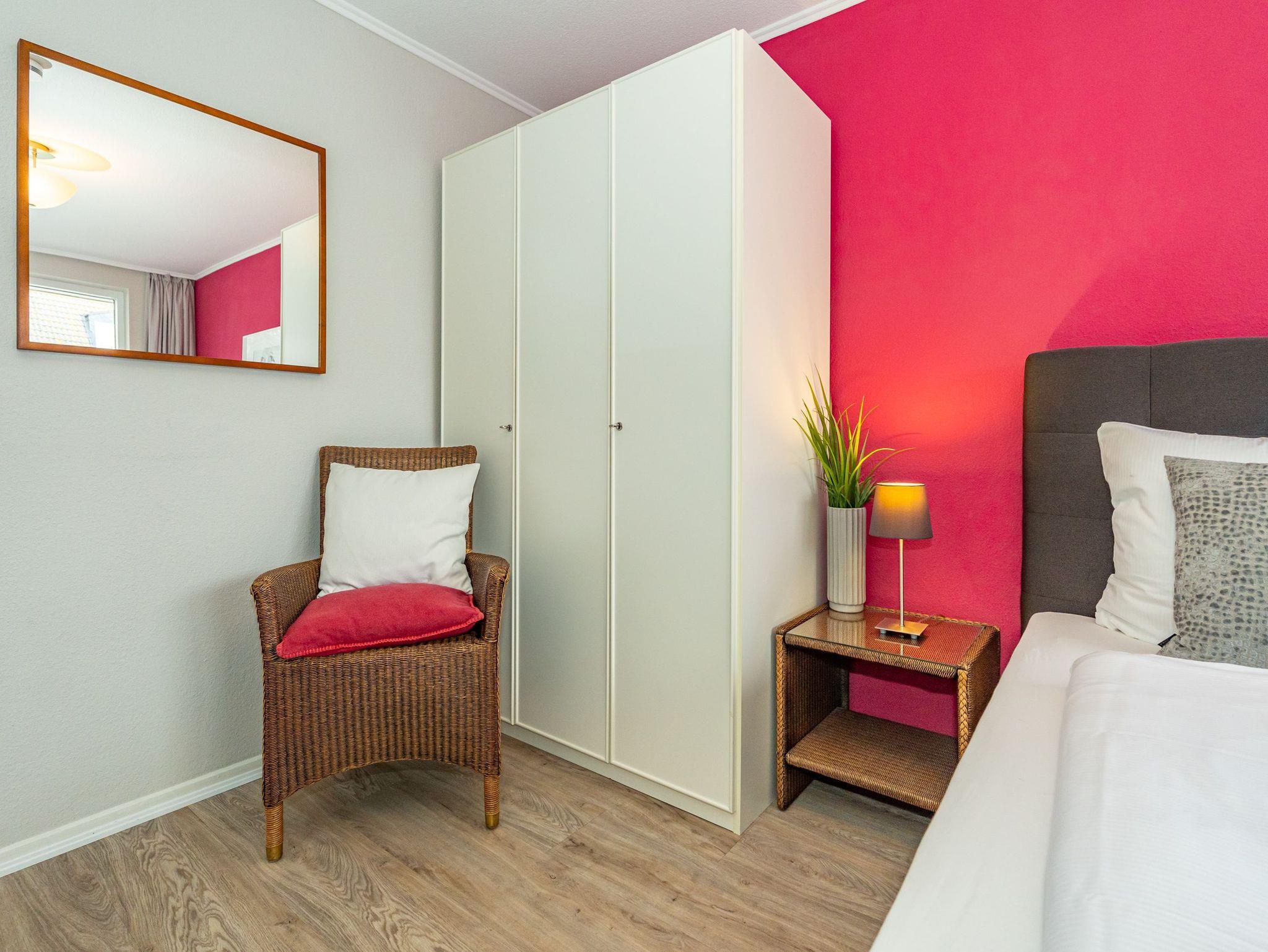 Diese moderne 2-Zimmer-Nichtraucher-Ferienwohnung (ca. 58 qm) in der 2. Etage bietet komfortablen Wohnraum für bis zu 4 Personen. Im Schlafzimmer erwartet Sie ein gemütliches Doppelbett, bestehend aus zwei Einzelmatratzen (je 0,90 x 2,00 m), ergänzt durch stilvolle Nachttische und einen eleganten Sessel in Loom-Ausführung. Das Wohnzimmer überzeugt mit Doppelschrankbetten (je mit Einzelmatratzen von 1,70 x 0,90 m), einem Sat-Flachbild-TV, Telefon und WLAN ? ideal für flexible Schlafmöglichkeiten und entspannte Abende. Die offene Küche, die ohne trennende Tür direkt in den Wohnbereich integriert ist und über ein Fenster verfügt, lässt keine Wünsche offen: Ausgestattet mit Backofen, Cerankochfeld, Kühlschrank mit Eisfach, Geschirrspüler, Kaffeemaschine, Wasserkocher und Toaster, bietet sie alles, was Sie für die Zubereitung Ihrer Lieblingsgerichte benötigen. Das moderne Duschbad/WC rundet das Raumkonzept ab.