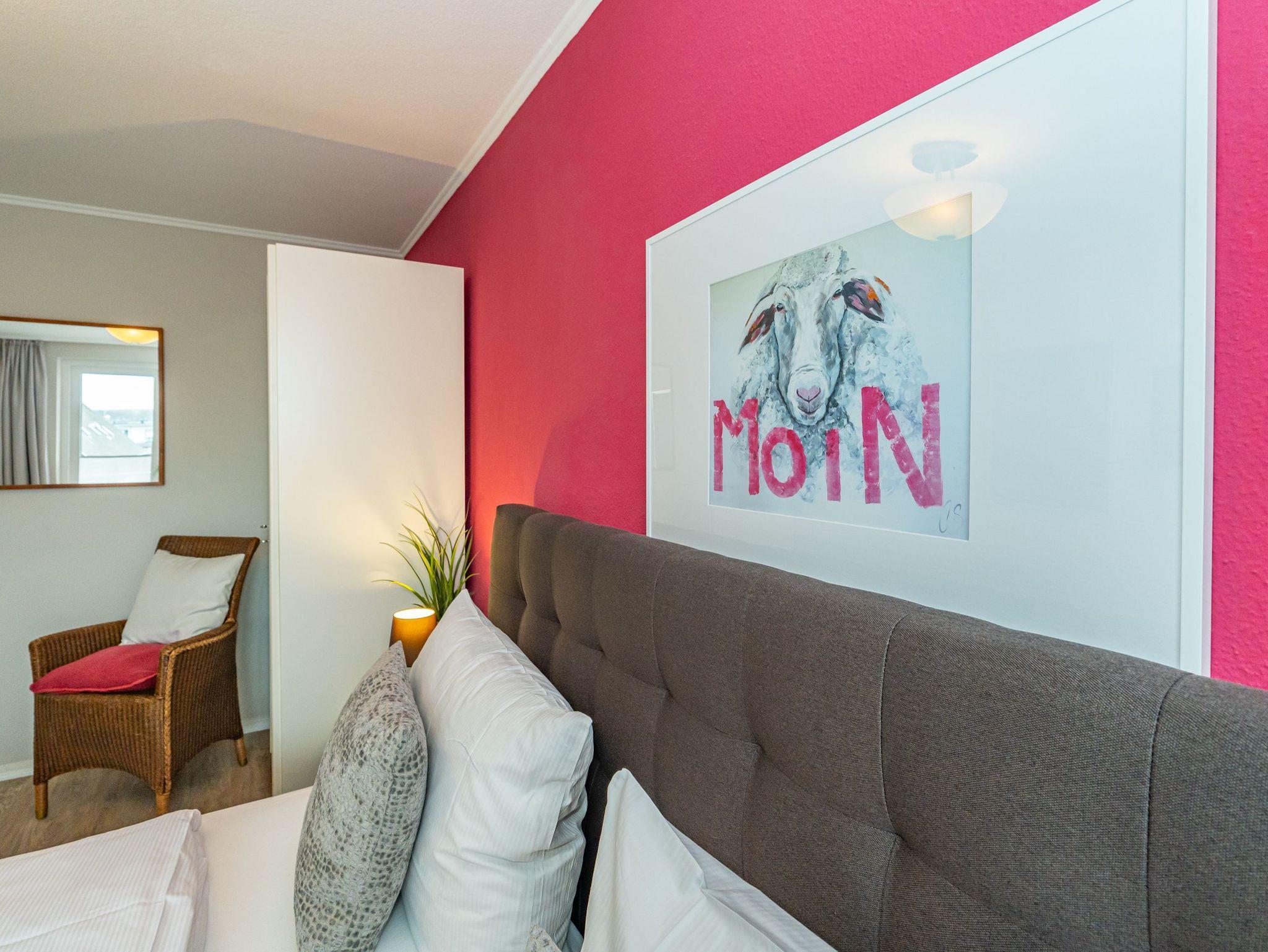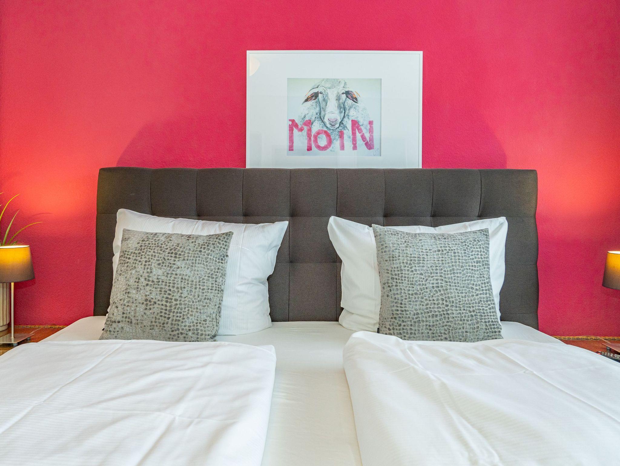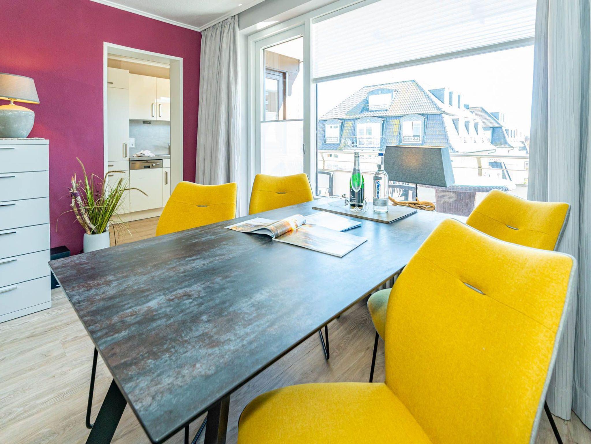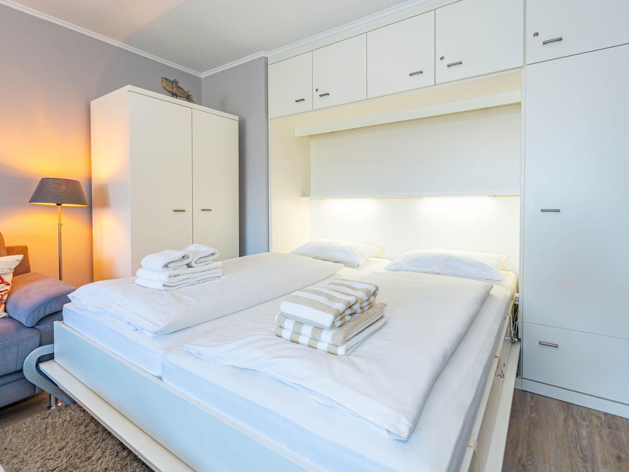 Diese moderne 2-Zimmer-Nichtraucher-Ferienwohnung (ca. 58 qm) in der 2. Etage bietet komfortablen Wohnraum für bis zu 4 Personen. Im Schlafzimmer erwartet Sie ein gemütliches Doppelbett, bestehend aus zwei Einzelmatratzen (je 0,90 x 2,00 m), ergänzt durch stilvolle Nachttische und einen eleganten Sessel in Loom-Ausführung. Das Wohnzimmer überzeugt mit Doppelschrankbetten (je mit Einzelmatratzen von 1,70 x 0,90 m), einem Sat-Flachbild-TV, Telefon und WLAN ? ideal für flexible Schlafmöglichkeiten und entspannte Abende. Die offene Küche, die ohne trennende Tür direkt in den Wohnbereich integriert ist und über ein Fenster verfügt, lässt keine Wünsche offen: Ausgestattet mit Backofen, Cerankochfeld, Kühlschrank mit Eisfach, Geschirrspüler, Kaffeemaschine, Wasserkocher und Toaster, bietet sie alles, was Sie für die Zubereitung Ihrer Lieblingsgerichte benötigen. Das moderne Duschbad/WC rundet das Raumkonzept ab.