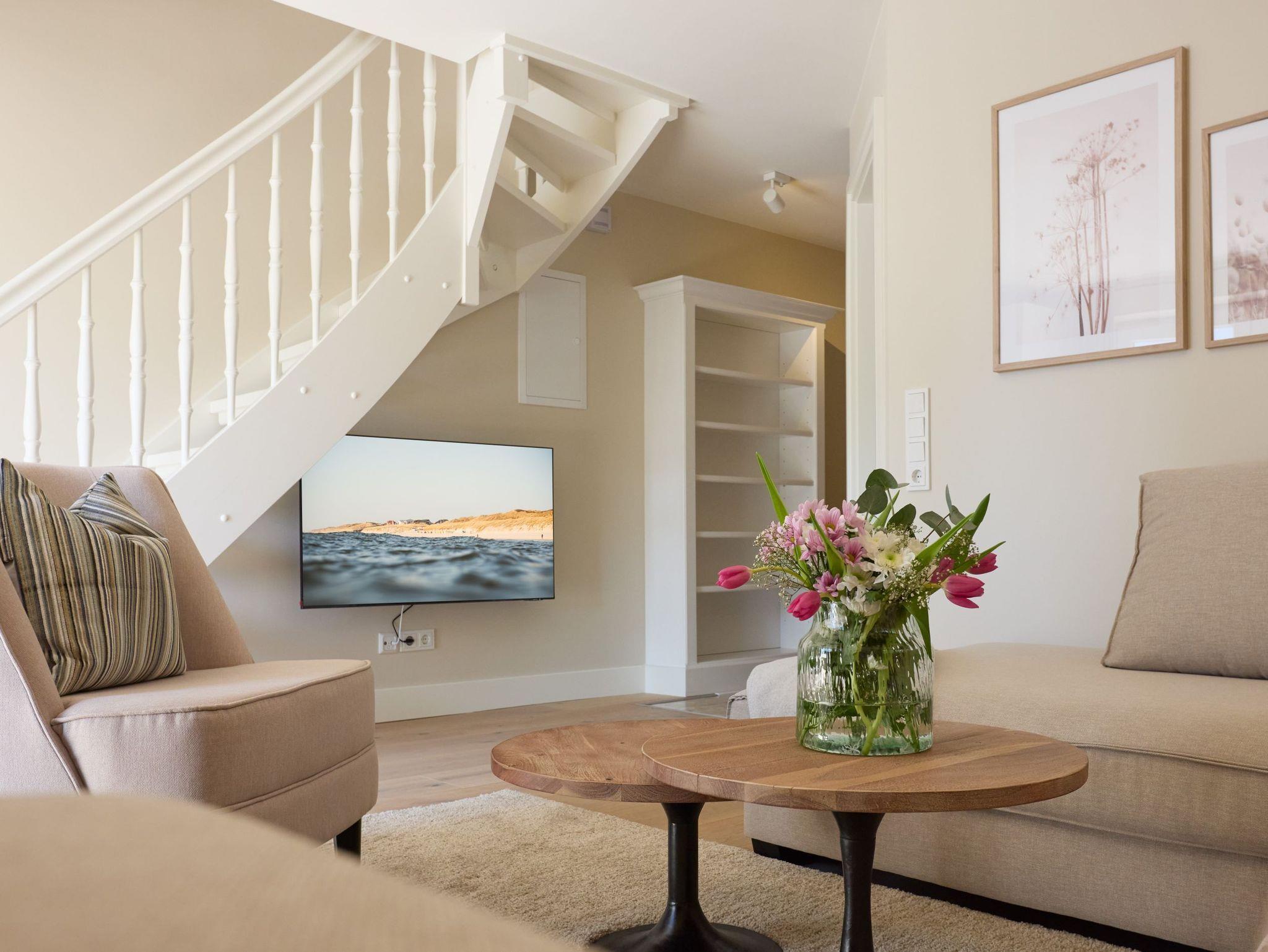 Über Ihren privaten Eingang betreten Sie Ihr helles Feriendomizil. Zu Ihrer rechten finden Sie eine kleine Abstellfläche. Folgen Sie dem Flur und nehmen Sie die Treppe nach Oben ins 1. OG.