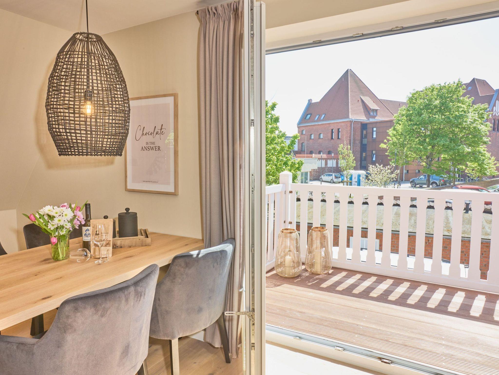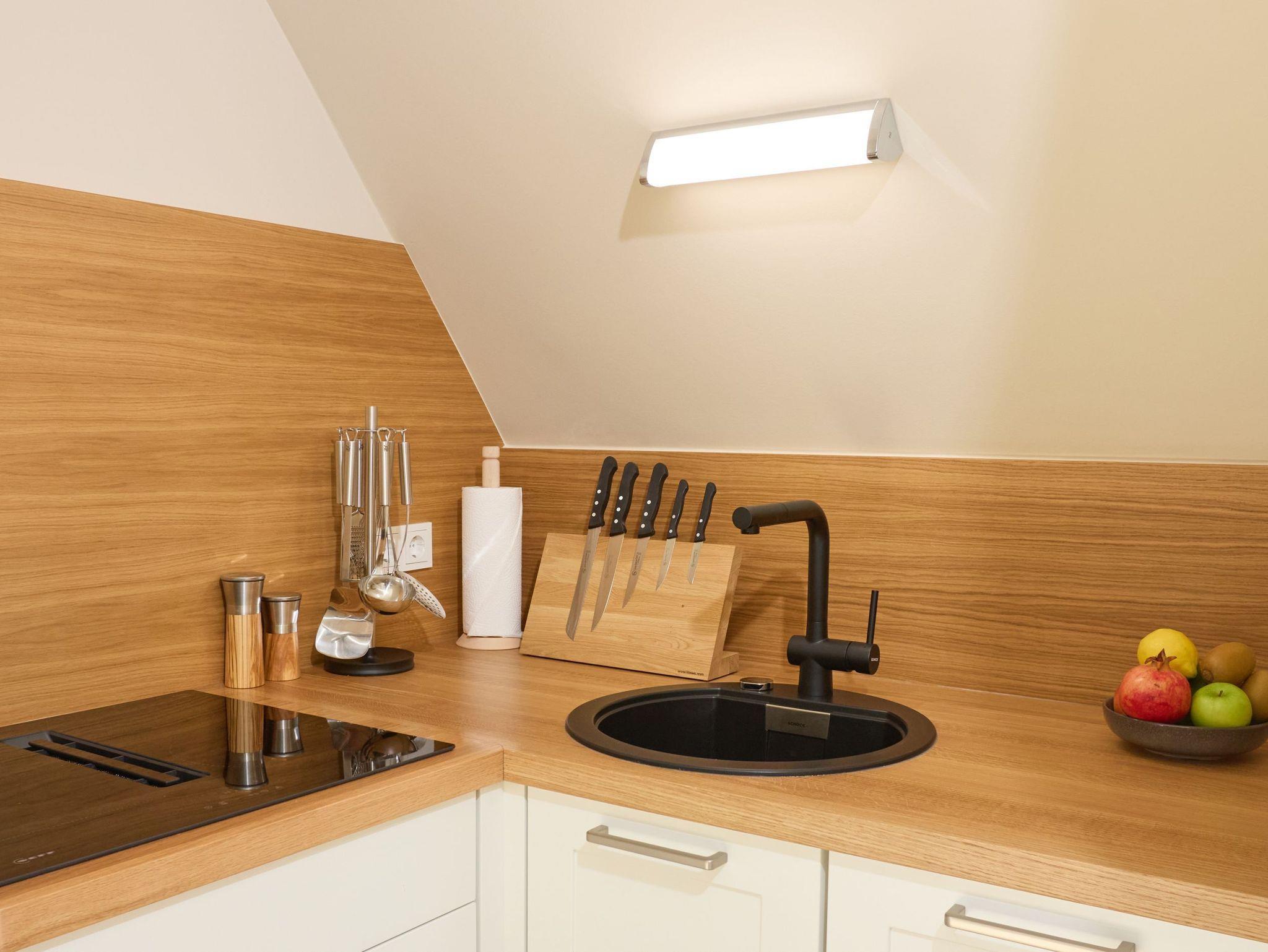 Sie kommen so in der luxuriös ausgestatteten Wohnküche an. Die Küchenzeile lässt mit ihren modernen Elektrogeräten keine Wünsche offen. Bei der Ausstattung wurde viel Wert auf Ästhetik gesetzt. Abgerundet wird diese einladende Wohnküche durch ein großes Ecksofa und einen Esstisch mit 4 Stühlen. Ein TV ist selbstverständlich auch vorhanden. Sie gelangen von hier aus sowohl auf den sonnigen Balkon als auch ins Schlafzimmer, welches mit komfortablen Doppelbett und Einbauschränken keine Wünsche offen lässt. Angrenzend an das Schlafzimmer befindet sich das Duschbad, welches durch moderne Ausstattung und hellen Farben zu überzeugen weiß.