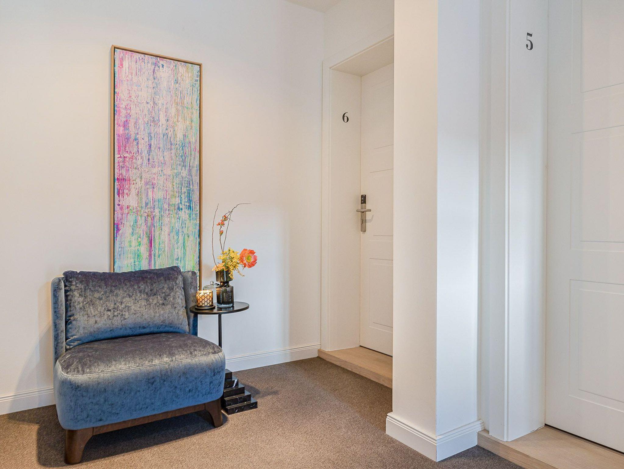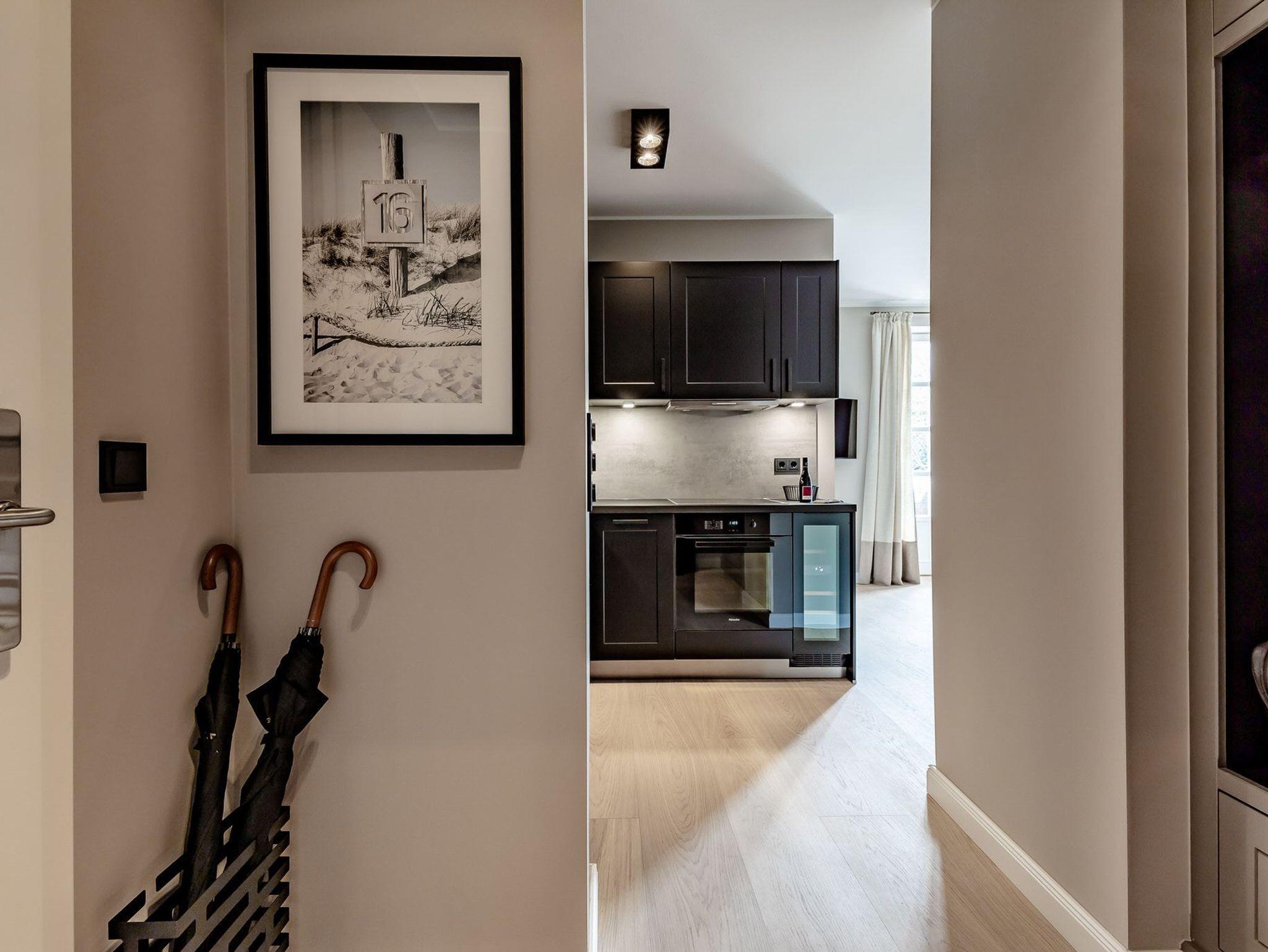 Beim Betreten des Apartments gelangen Sie durch den Flur in die hochwertig ausgestattete Küche mit Geräten von Top-Markenherstellern wie Miele und Gaggenau. Hier befindet sich auch der großzügigen Wohn- und Essbereich inklusive Schlafsofa. Genießen Sie das Wohlfühlambiente auf Sylt: hohe Decken und lichtdurchflutete Räume treffen auf modernes Design. Vom Wohnbereich haben Sie auch Zugang zum Ostbalkon, von wo Sie morgens den Sonnenaufgang über Westerland beobachten können. Im Schlafzimmer erwartet Sie ein hochwertiges Boxspringbett für erholsame Nächte. Das Highlight im Badezimmer ist sicherlich die Regendusche sowie die moderne Ausstattung. Zudem erhalten Sie bei Ihrer Anreise ein Starterpaket und eine Erstausstattung für Badezimmer und Küche. Die komplette Ferienwohnung ist mit Fußbodenheizung ausgestattet. So bleibt es ganzjährig kuschelig warm. Für Ihren Hund können Sie gerne ein kleines Dog-Paket inklusive Hundekissen und Co. hinzubuchen.