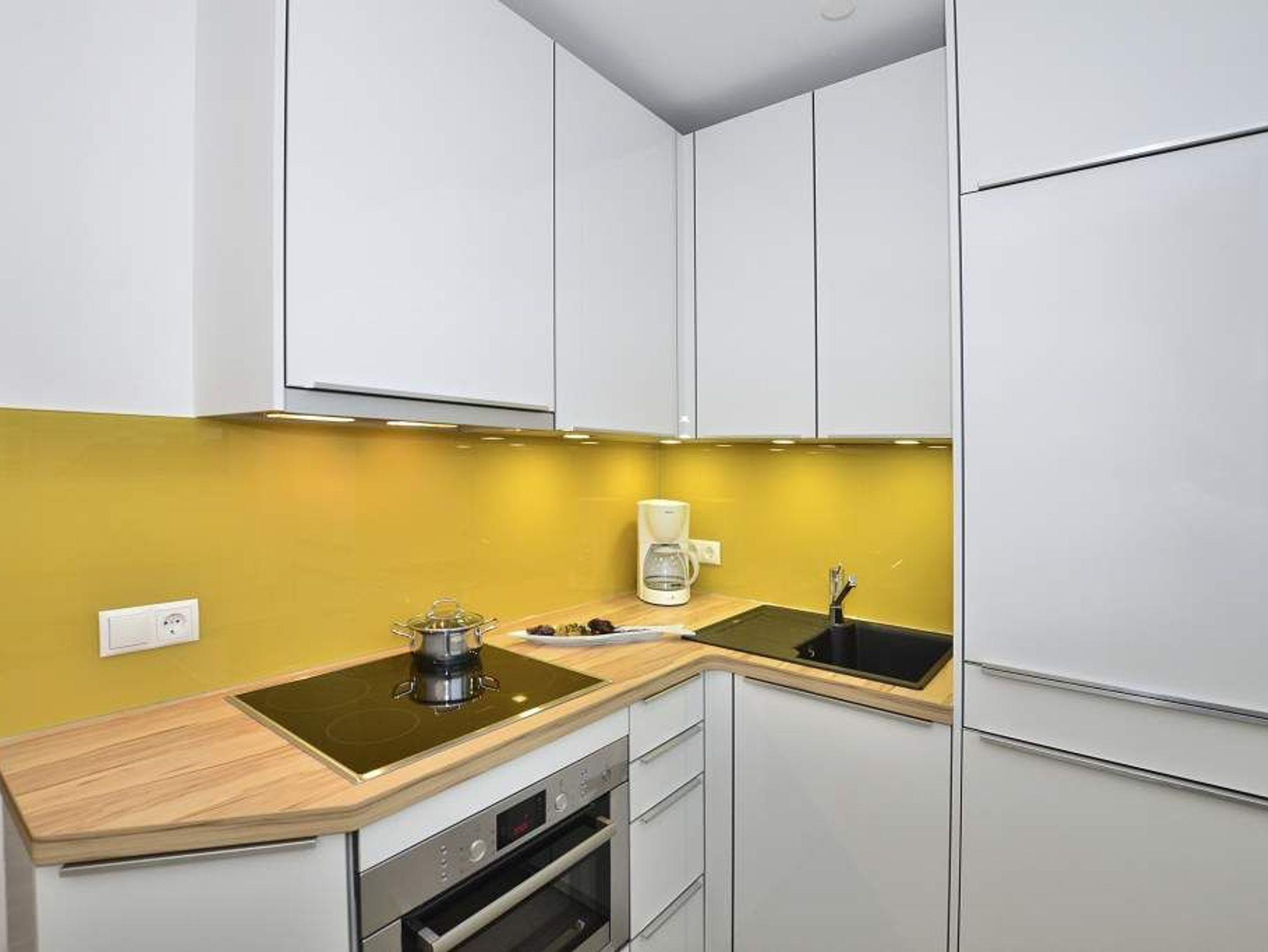 Die neue moderne Küche mit Fenster hat einen Geschirrspüler, einen Induktionsherd mit Backofen und Ceranfeld, eine Mikrowelle und einen Kühlschrank mit 3-Sterne-Gefrierfach. Kaffeemaschine, Wasserkocher und Toaster gehören zur Grundausstattung.