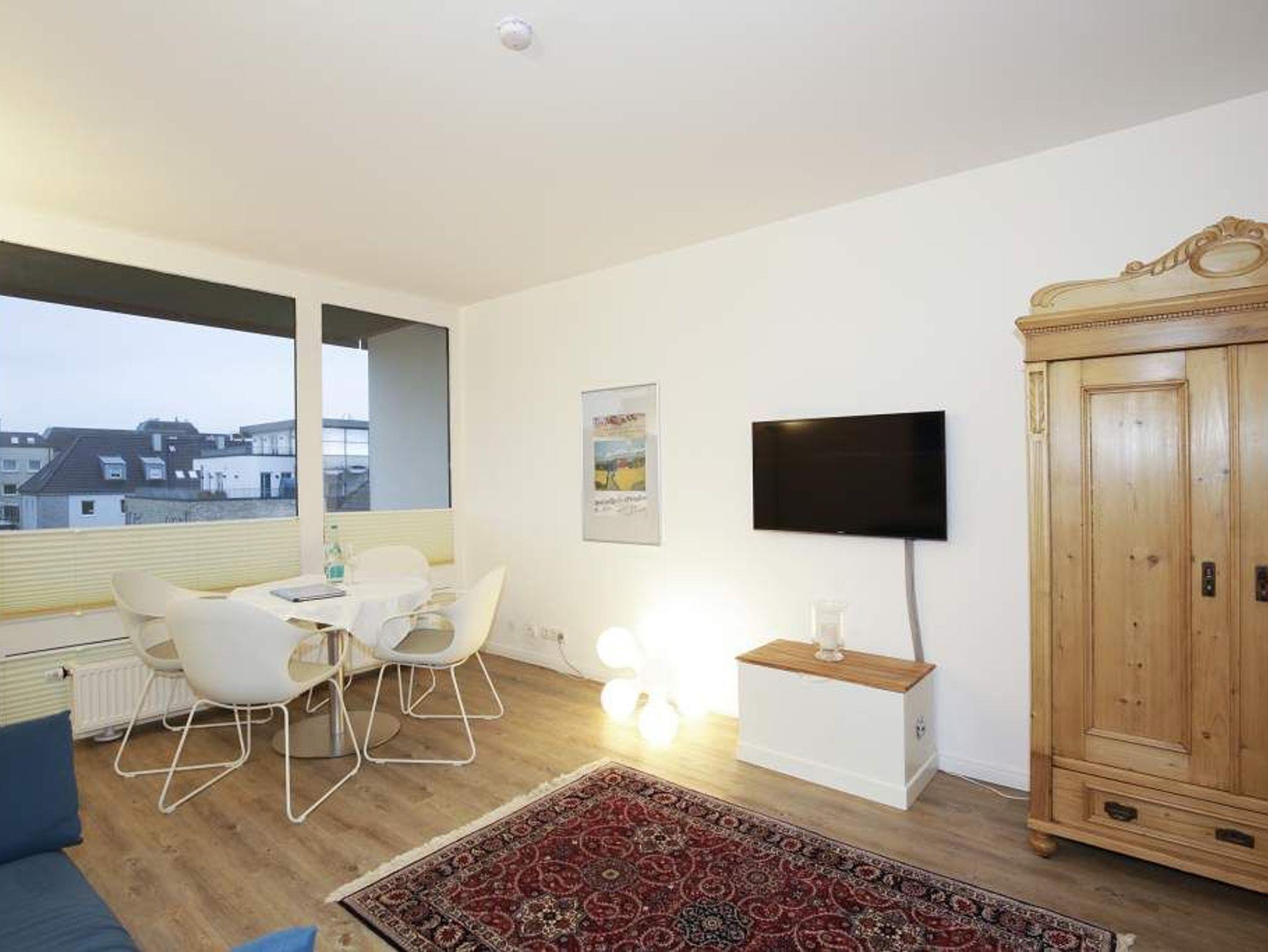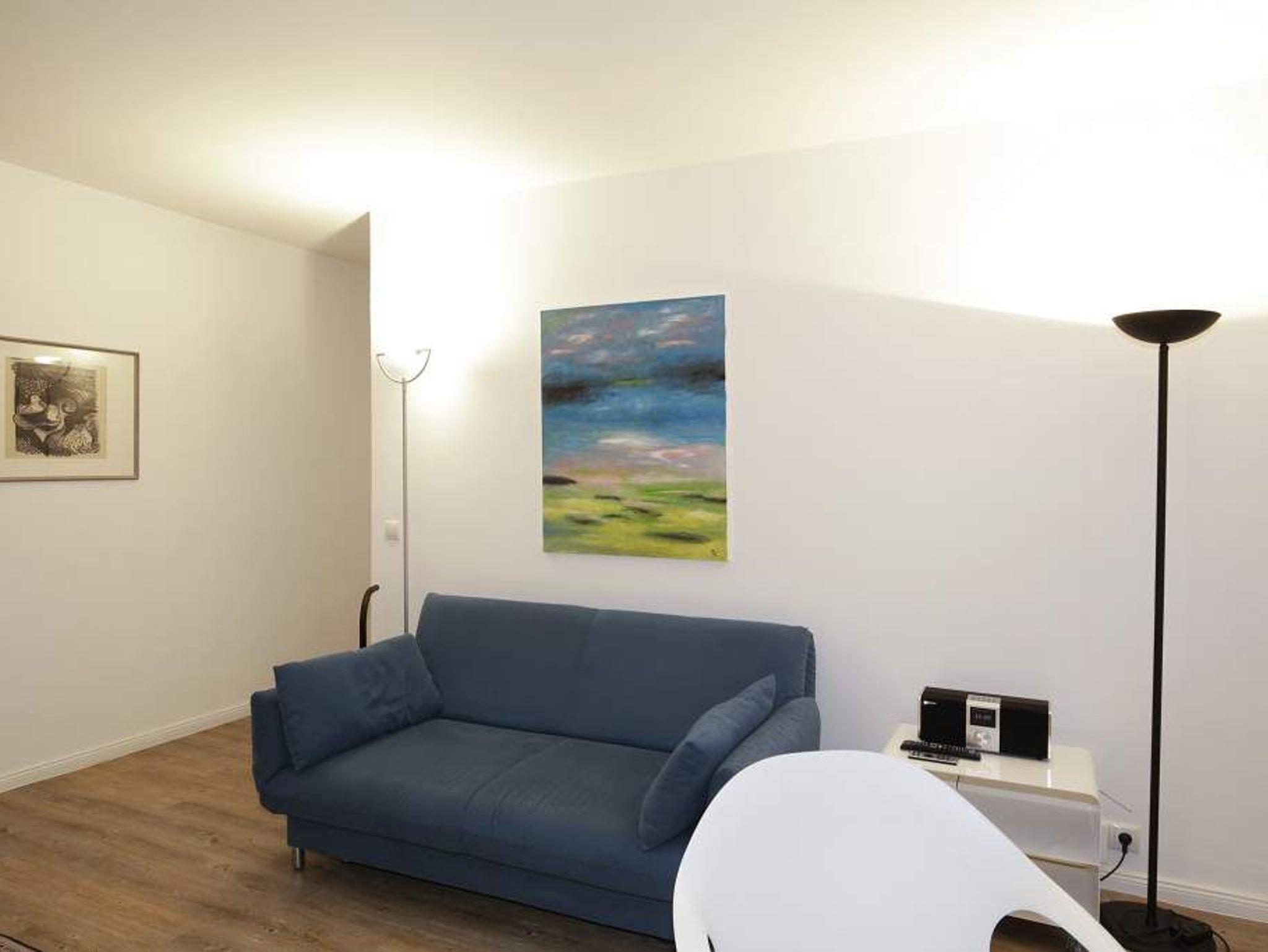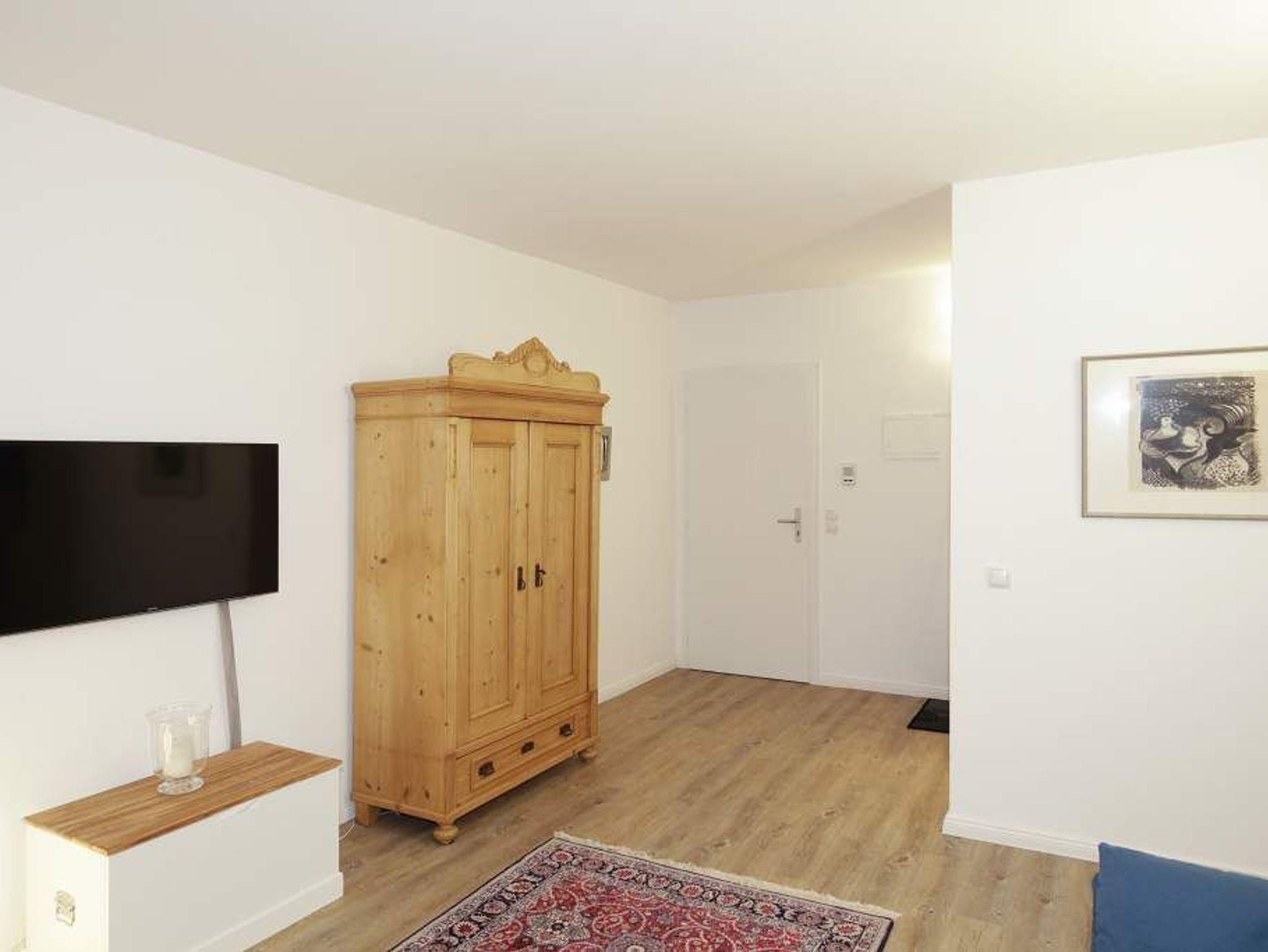 Die moderne Ferienwohnung besteht aus einem großzügigen Wohnraum mit einer Sitzgarnitur (Zweisitzer-Couch mit Schlaffunktion), einem Essplatz, Kabel-Flachbild-TV.