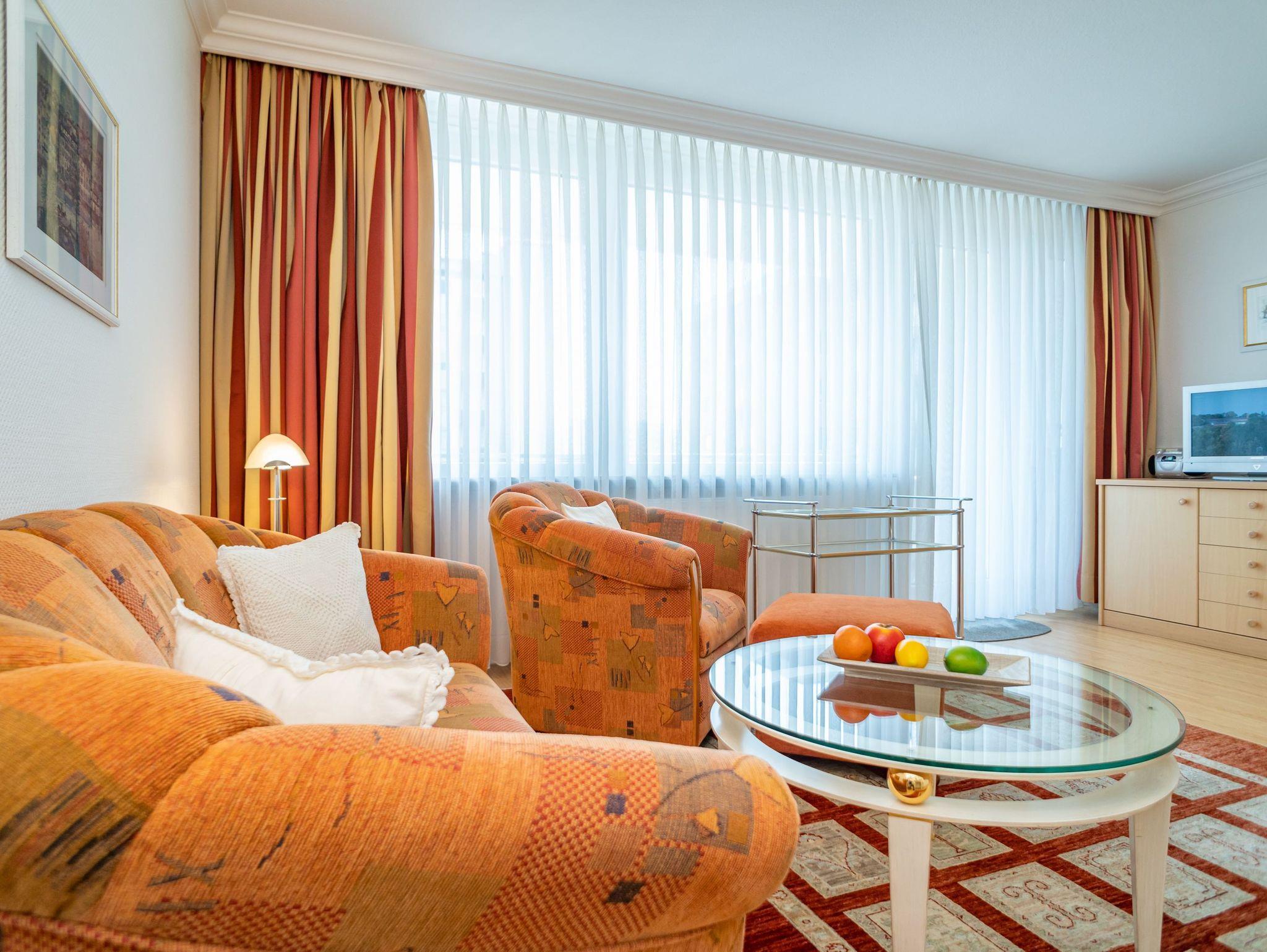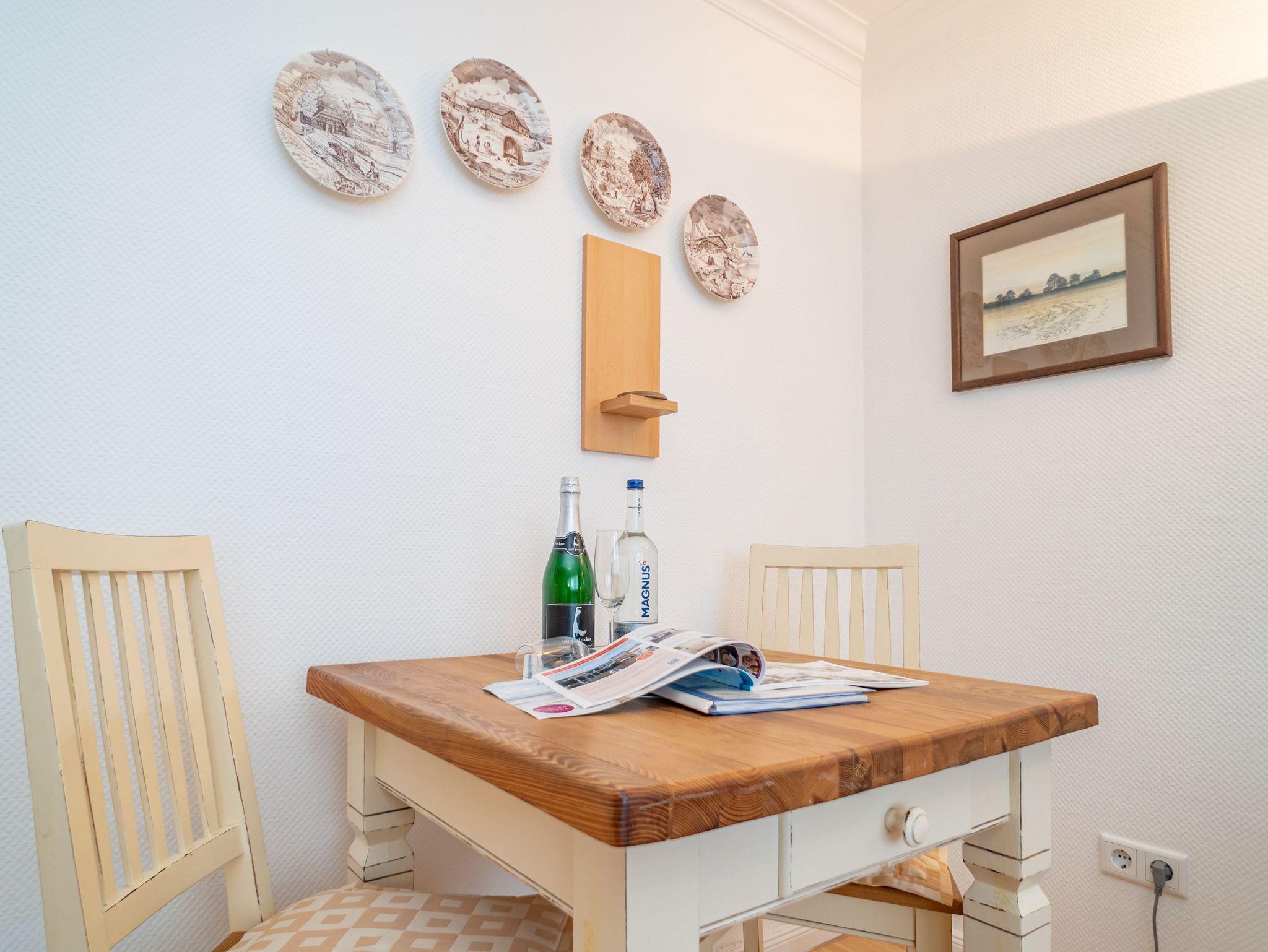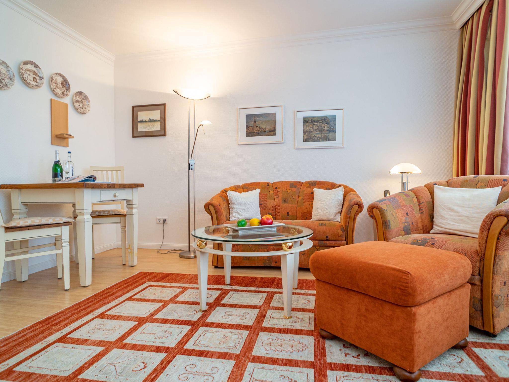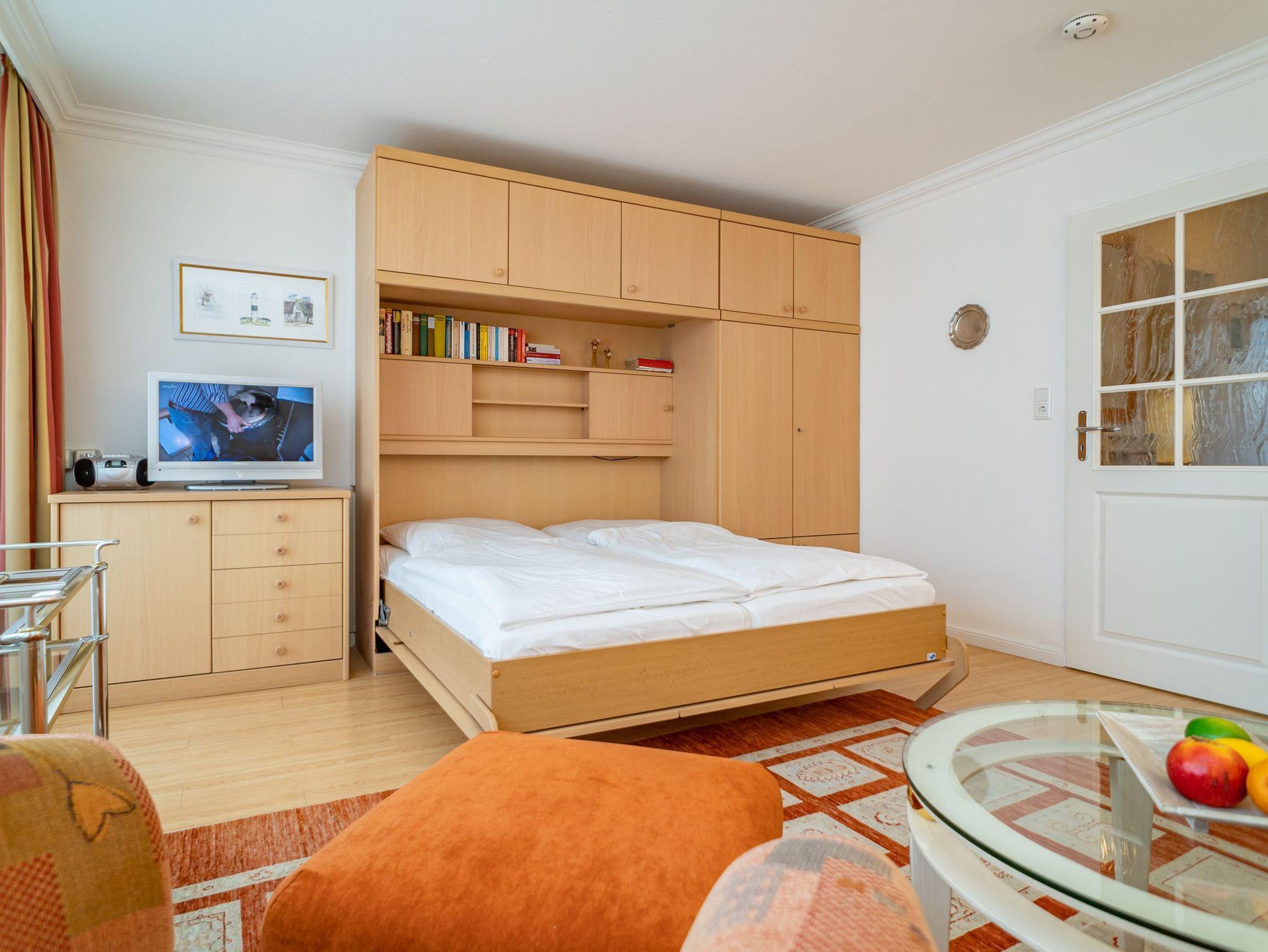 Der Wohn-/Schlafraum besteht aus einer gemütlichen Sitzgarnitur (Zweisitzer und Sessel), einem Essplatz, einem neuen Doppelschrankbetten (zusammen ausklappbar, 0,80 x 1,97 m), Kabel-Flachbild-TV mit digitalem Empfang, Radio, kostenlose Internetnutzung per W-Lan.