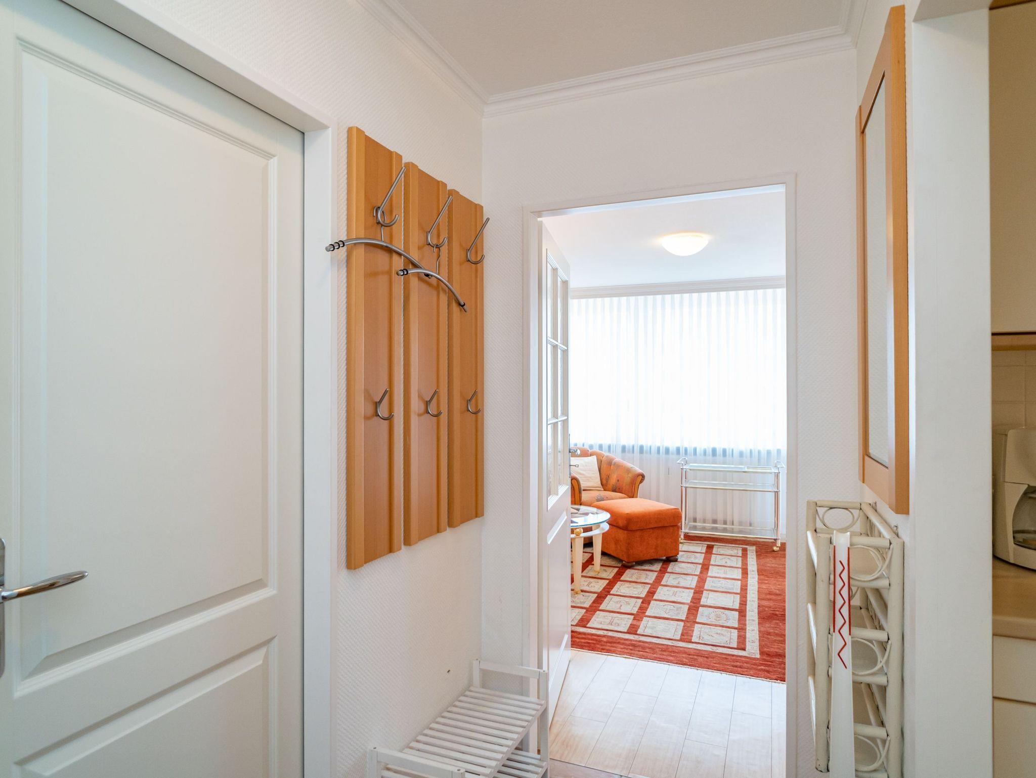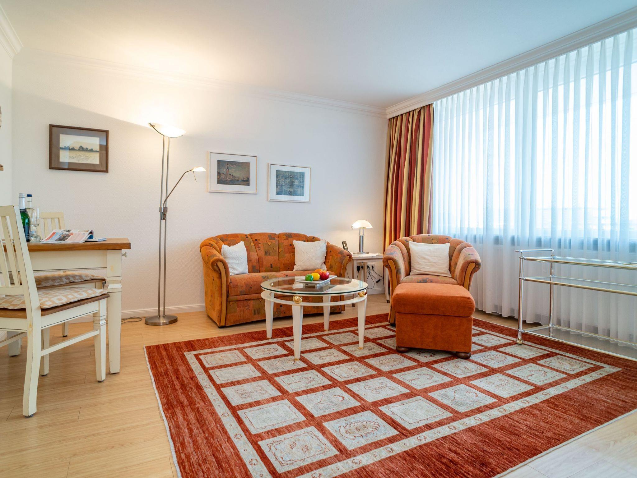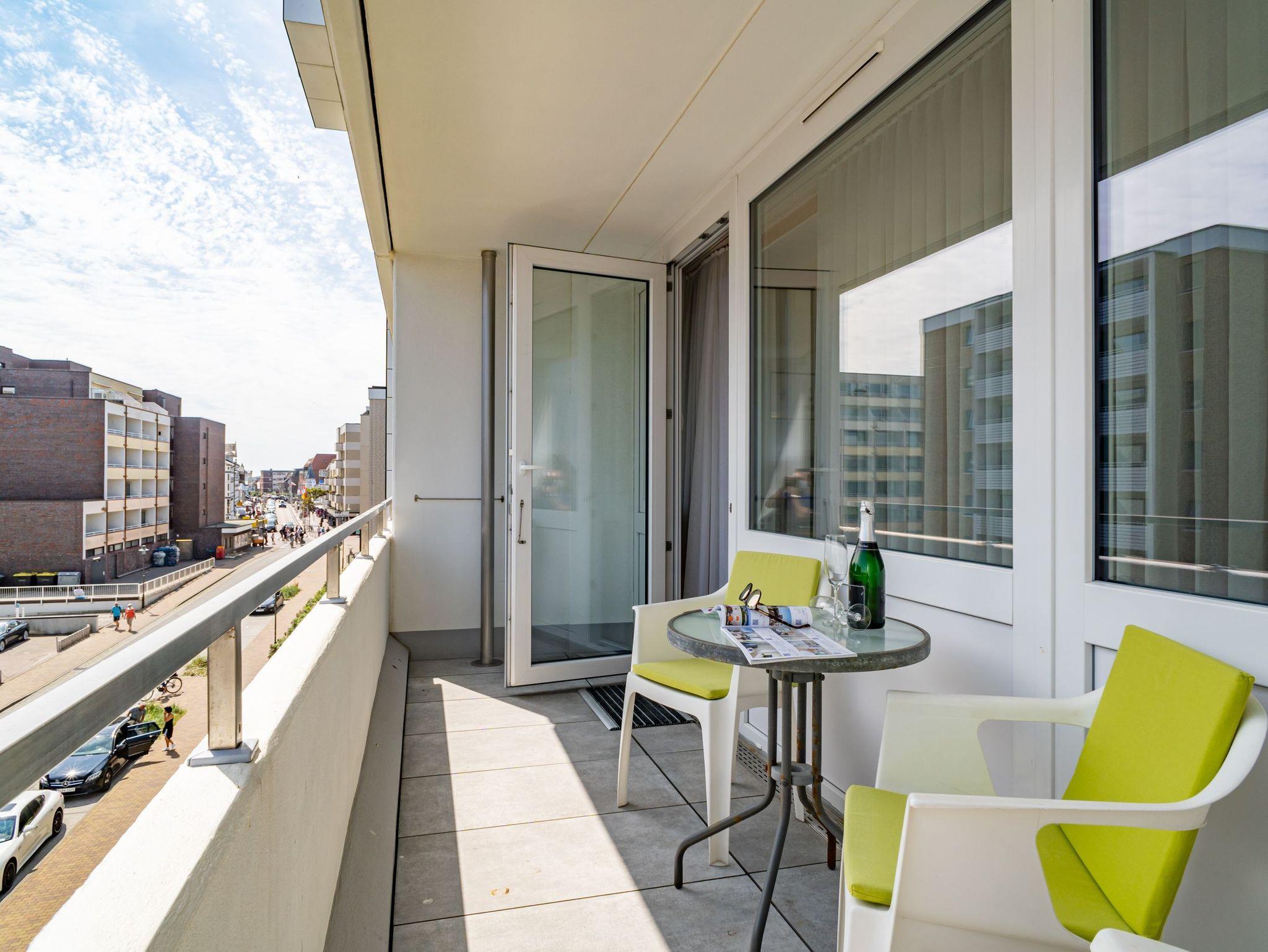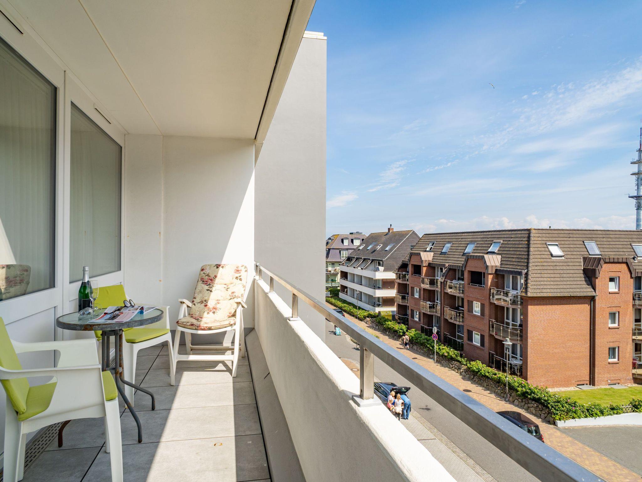 Großzügige, gut ausgestattete 1-Zimmer-Nichtraucher-Ferienwohnung (ca. 36 m²) in der 3. Etage zur Landseite mit Ostloggia (Morgensonne, mit Balkonmöbeln und Auflagen) für max. 2 Personen.