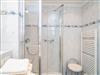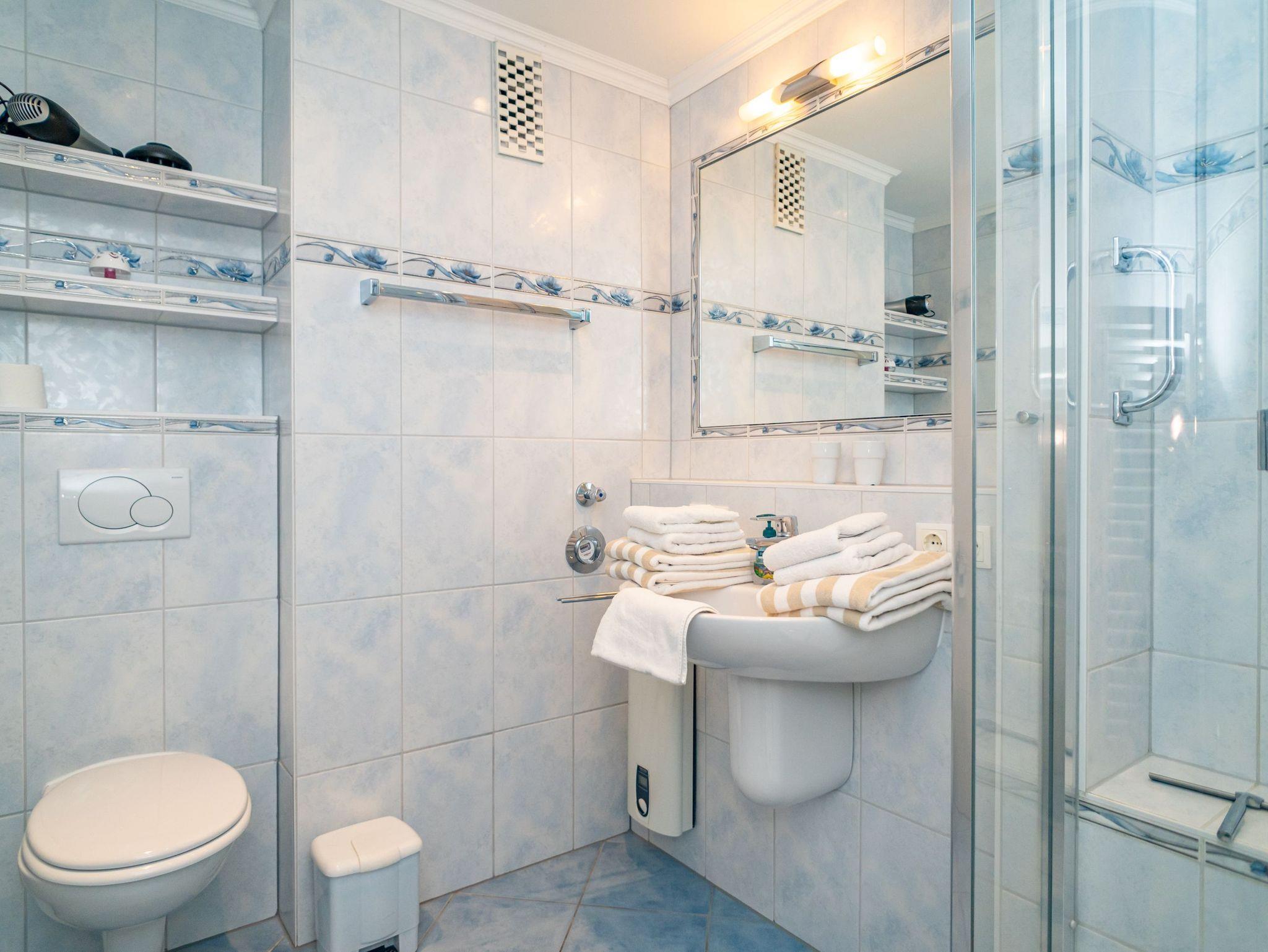 Im neuen, modernen Bad befinden sich eine Runddusche, ein WC, ein Waschtisch und ein Handtuchtrockner.