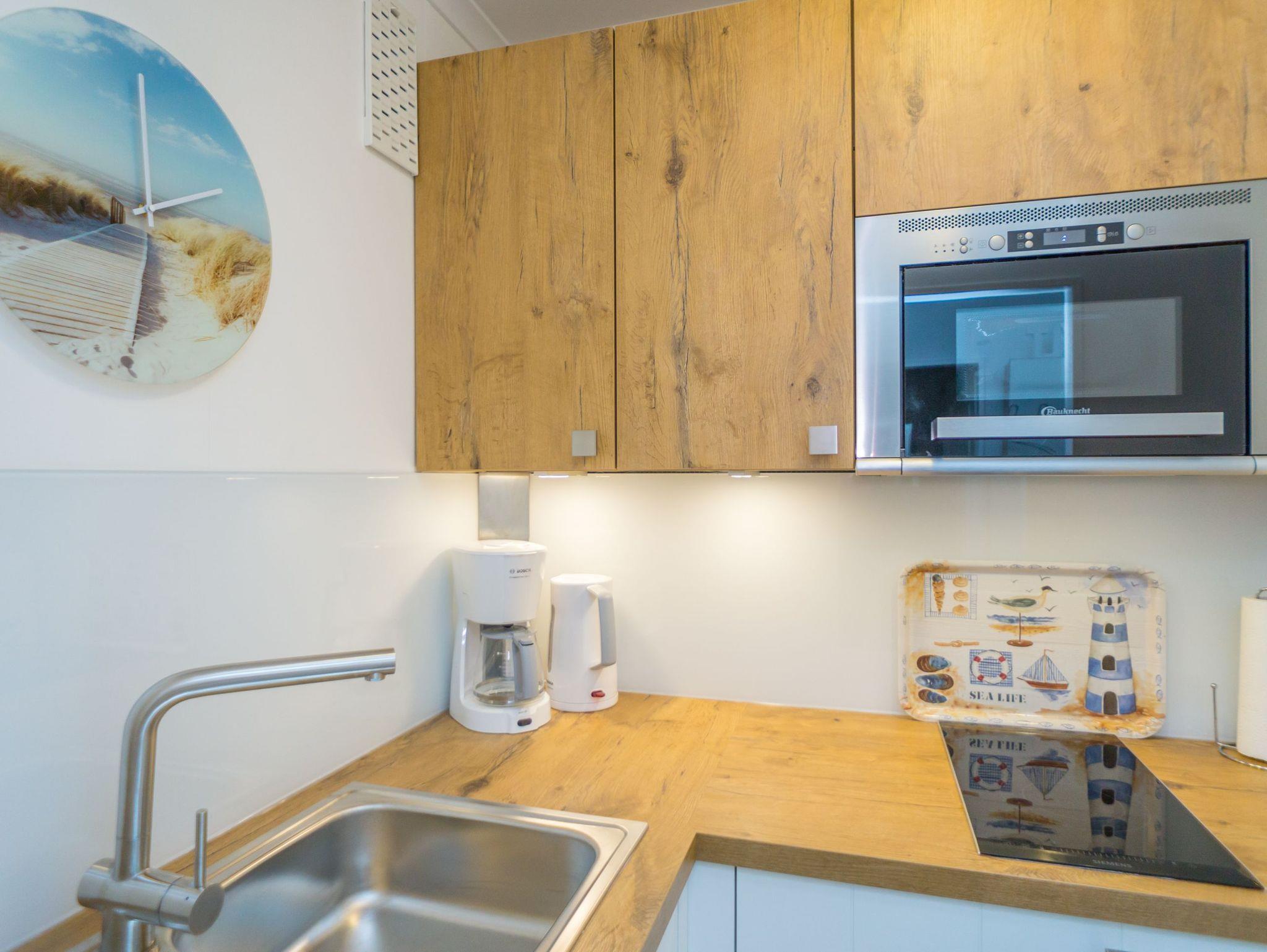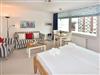 Der Wohn-/Schlafraum ist komplett neu gestaltet und besteht aus einer gemütlichen Sitzgarnitur (ein Zweisitzer und ein Stuhl), einem Essplatz, freistehenden Betten, Kabel-Flachbild-TV, Radio/CD. Die separate Küche hat einen Geschirrspüler, eine Mikrowelle, ein 2-Plattenkochfeld und Abzugshaube. Kaffeemaschine, Wasserkocher, und Toaster gehören zur Grundausstattung, sowie eine Saftpresse und ein Eierkocher. Im hellen, großzügig gestalteten Bad befinden sich eine Runddusche sowie ein beheizbarer Handtuchhalter.
