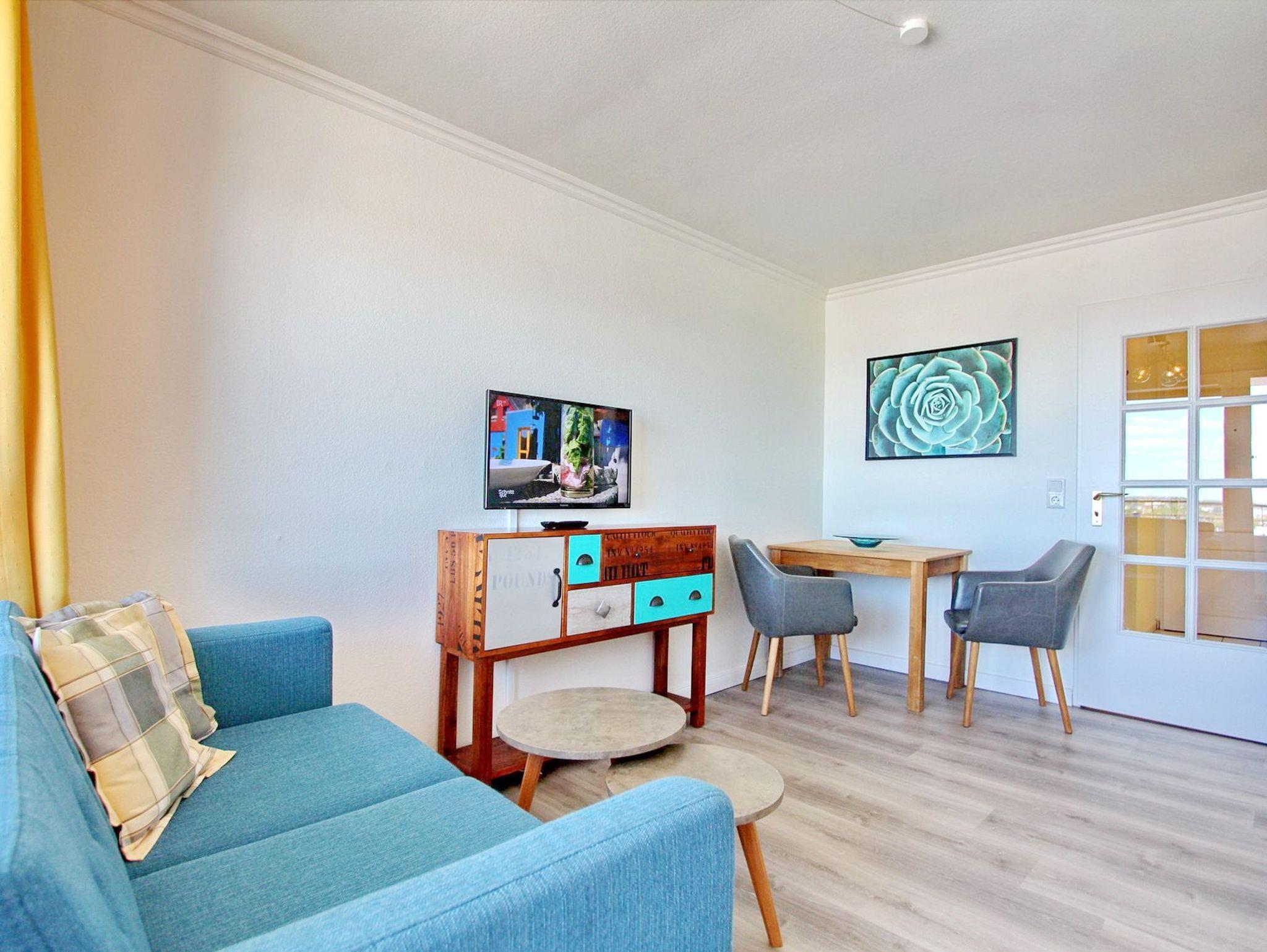 Diese sehr einfache Einzimmerwohnung in der 11. Etage im Haus Metropol mit vorgelagertem Ostbalkon hat einen herrlichen Weitblick über die Insel und die Stadt. Bei klarem Wetter können sie das nordfriesische Wattenmeer und das Festland sehen. Der Wohn-/Schlafraum hat Einzelschrankbetten, einen Essplatz mit 2 Stühlen und eine Couch am Fenster. Im Flur gibt es eine Einbauküche mit Ceranfeld. Das Badezimmer hat eine Dusche. Zur technischen Ausstattung dieser Wohnung gehört: ein Flachbildfernseher von Panasonic, ein Bluetoothradio mit CD Player von Sony und ein freies WLAN Netzwerk (WEG Haus Metropol - Passwortfrei - ohne Gewähr) steht ihnen kostenfrei zur Verfügung. Wohnungsgröße: ca. 22 m².