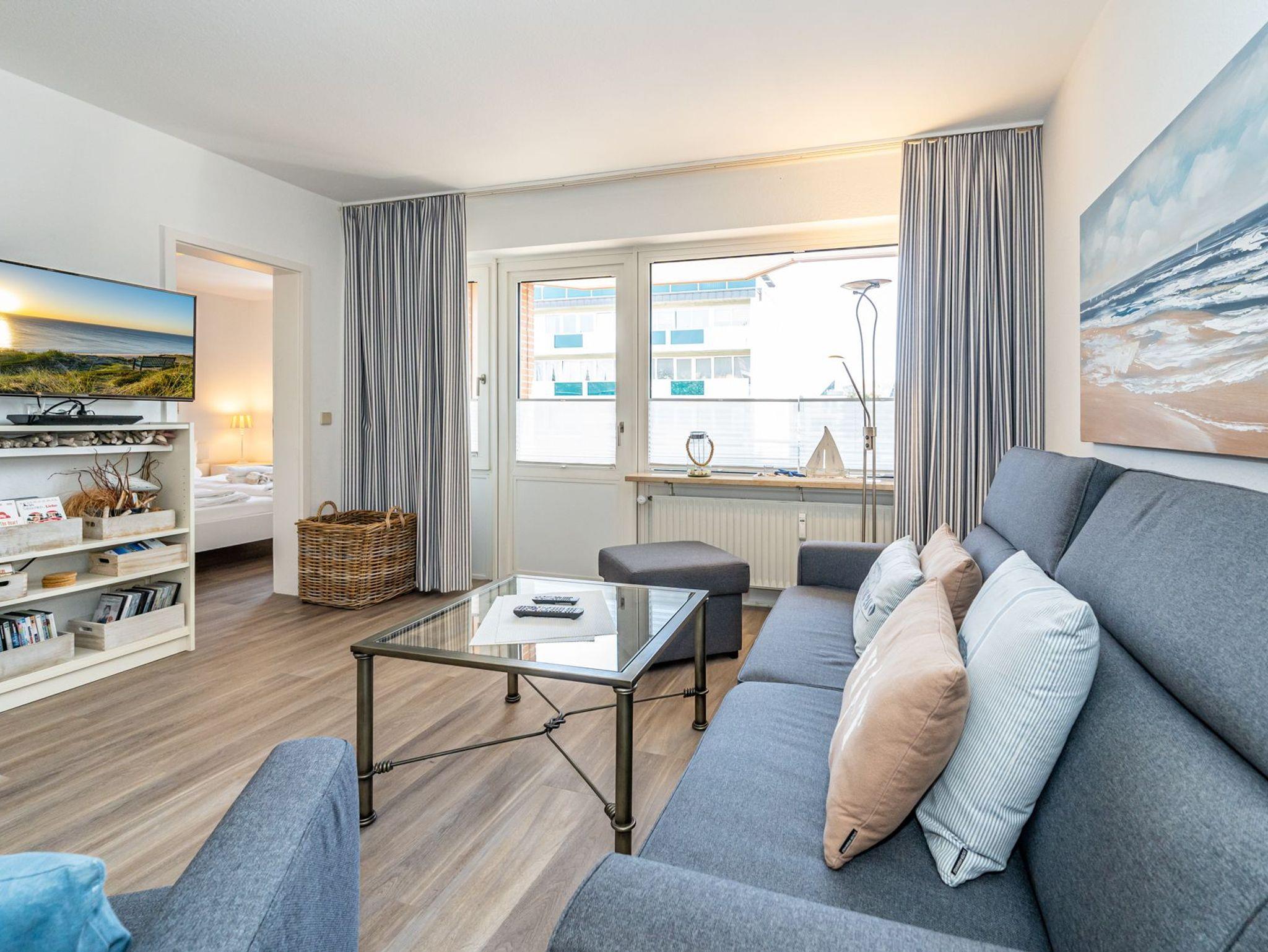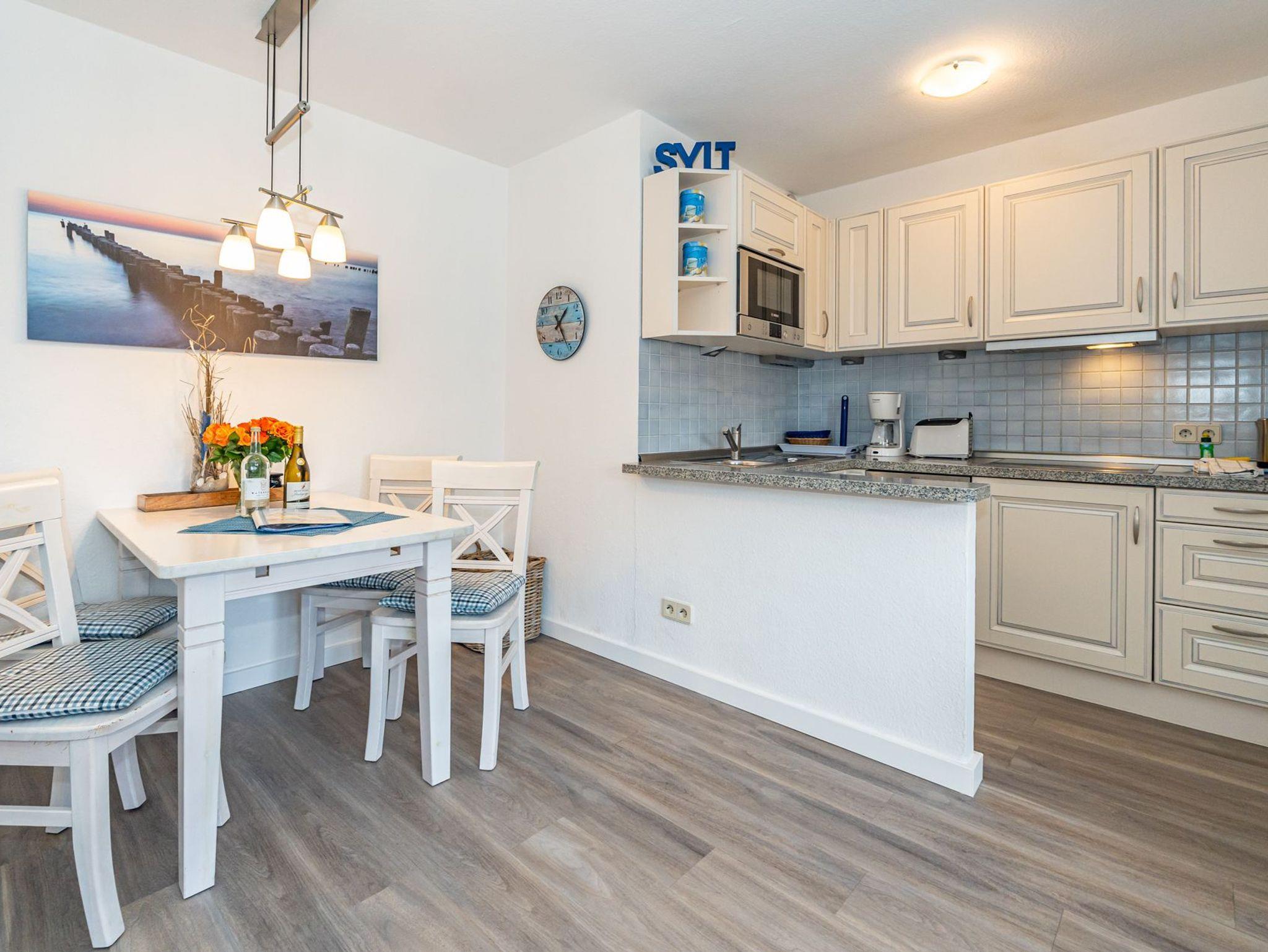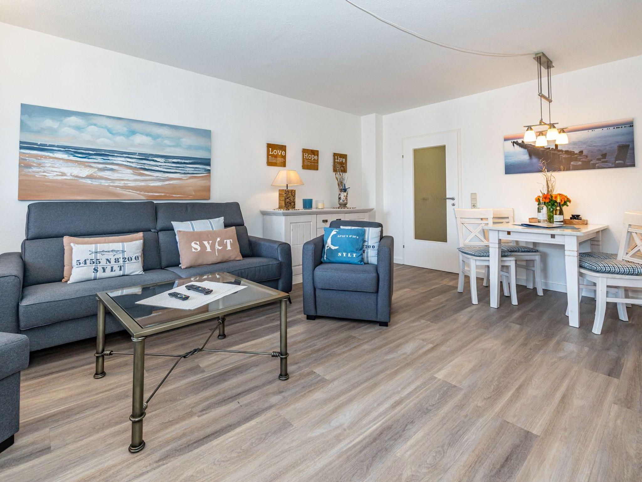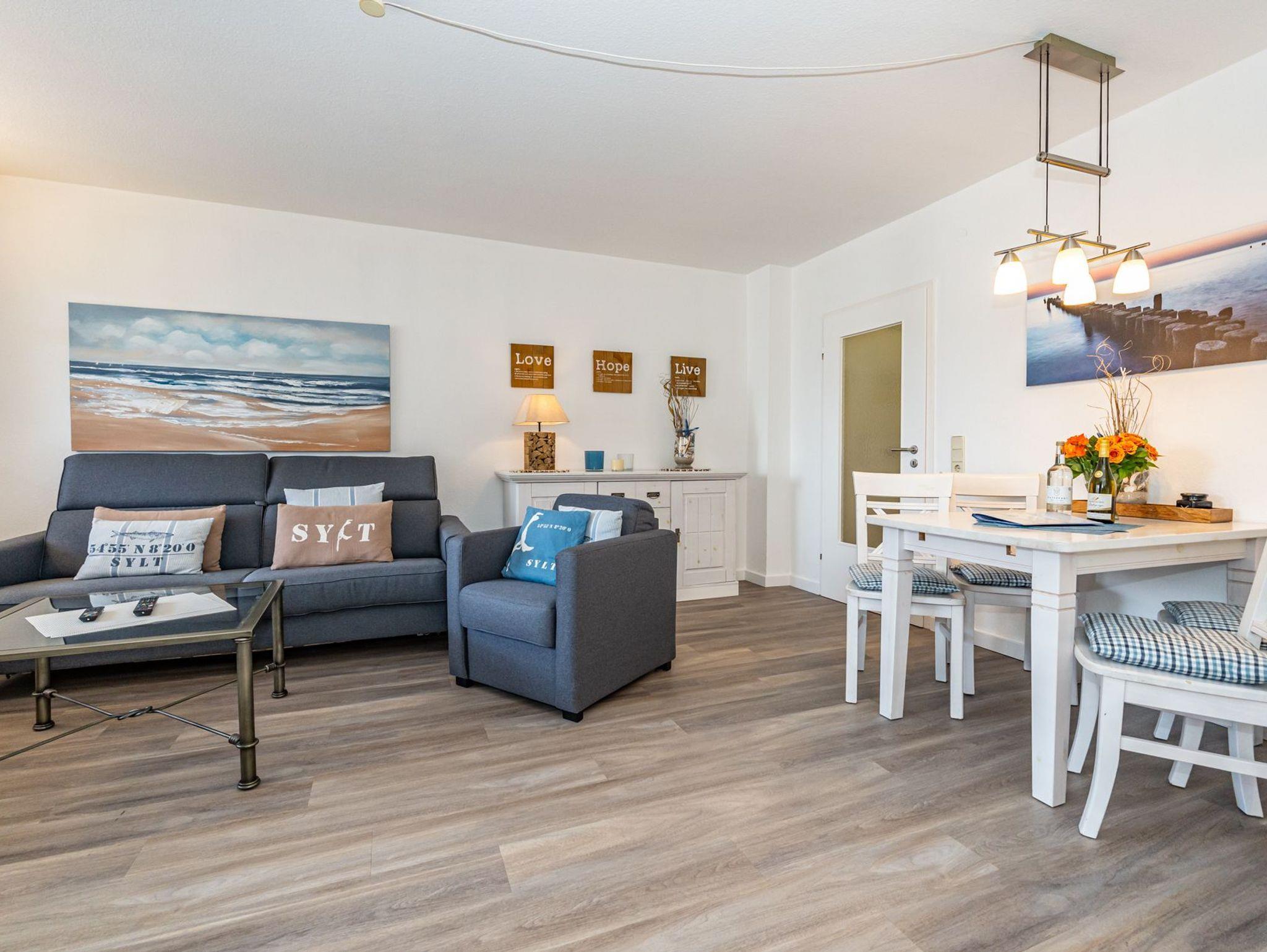 Der Wohnraum besteht aus einer bequemen Sitzgarnitur (Doppel-Schlafcouch 1,50 x 2,00 m und zwei Sesseln), einem Essplatz, Kabel-Flachbild-TV, neuer offenen Küche.