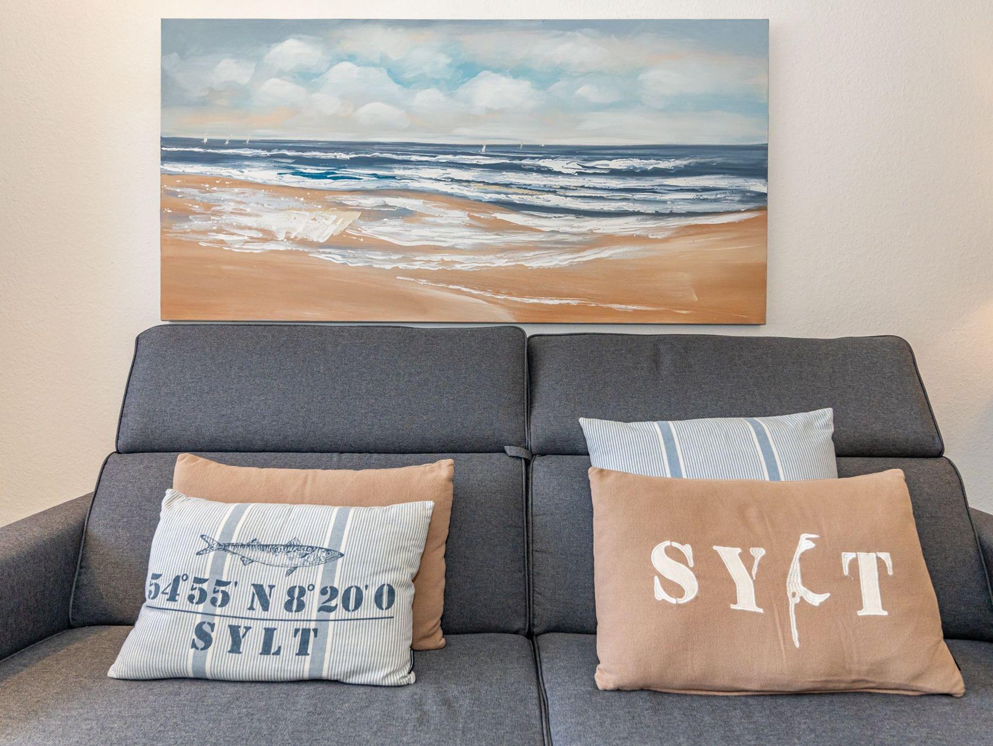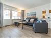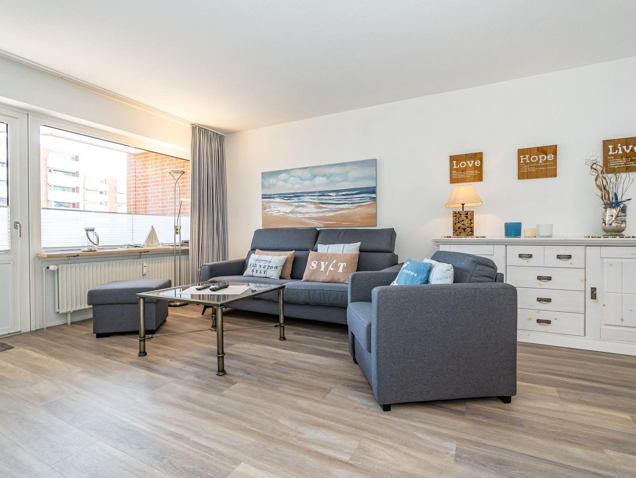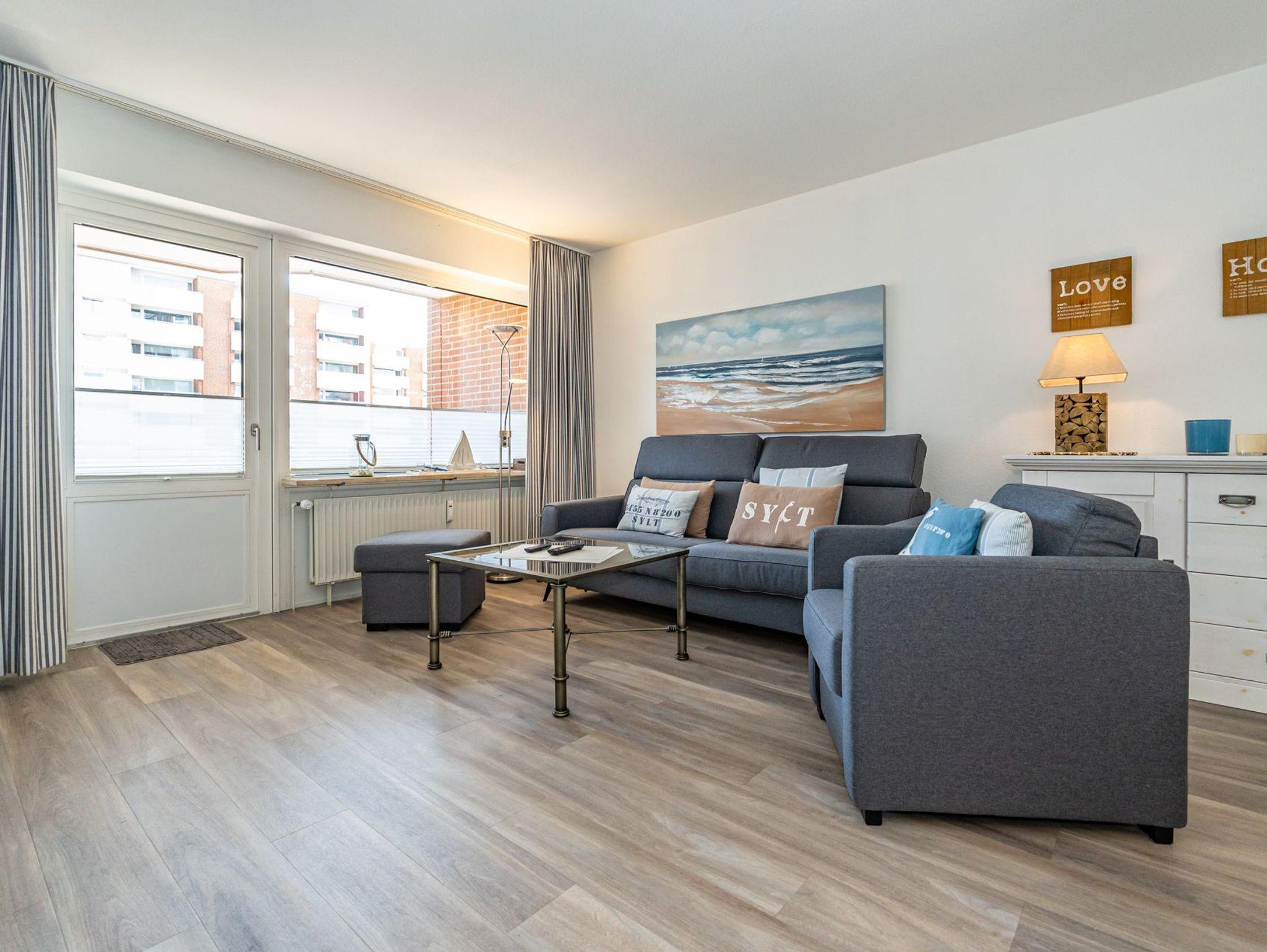 Der Wohnraum besteht aus einer bequemen Sitzgarnitur (Doppel-Schlafcouch 1,50 x 2,00 m und zwei Sesseln), einem Essplatz, Kabel-Flachbild-TV, neuer offenen Küche.