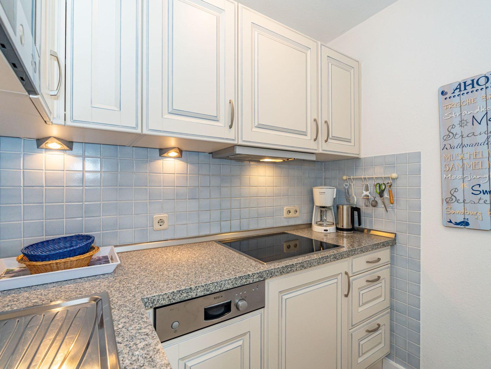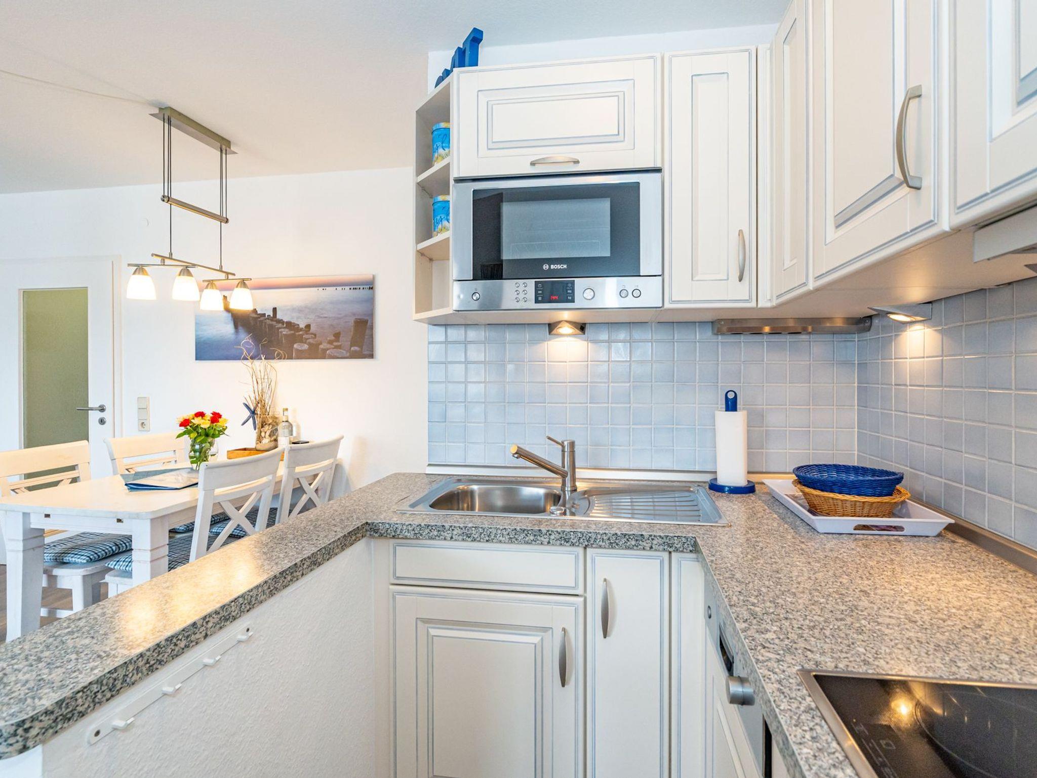 Die neue, offene Küche ist mit Geschirrspüler, Cerankochfeld , Mikrowelle und Kühlschrank mit 4-Sterne-Gefrierfach gut ausgestattet.