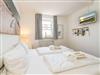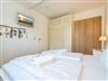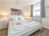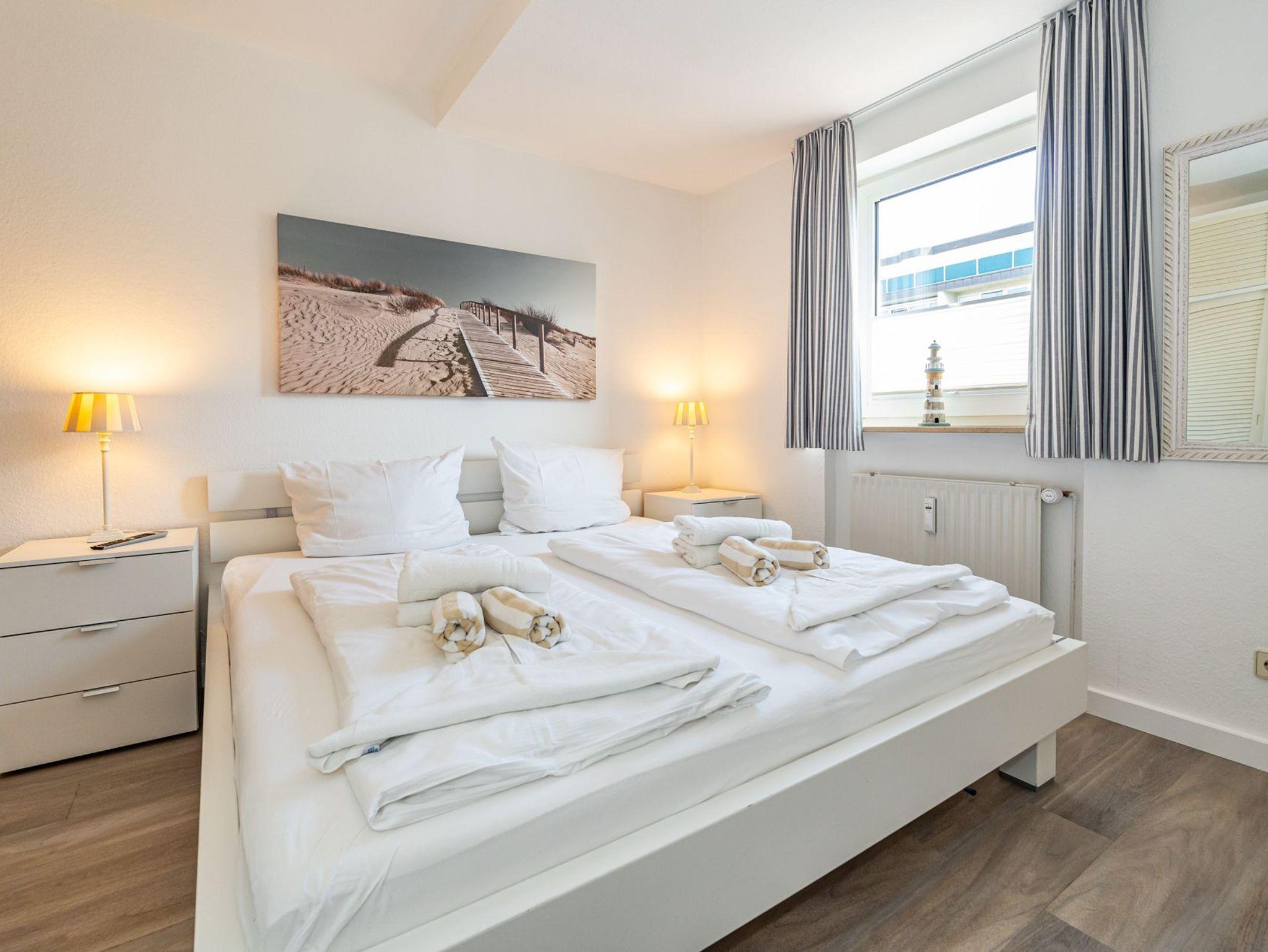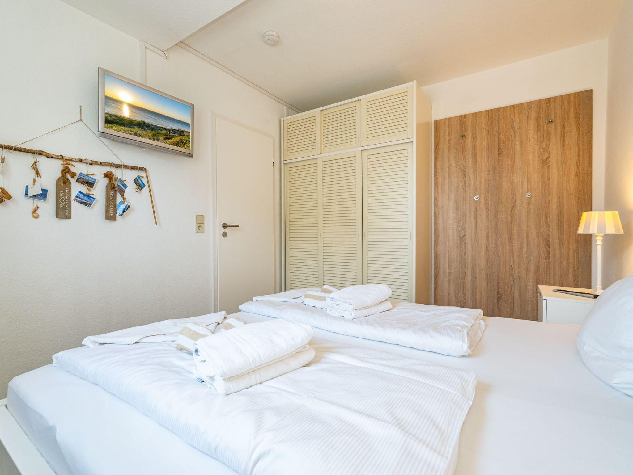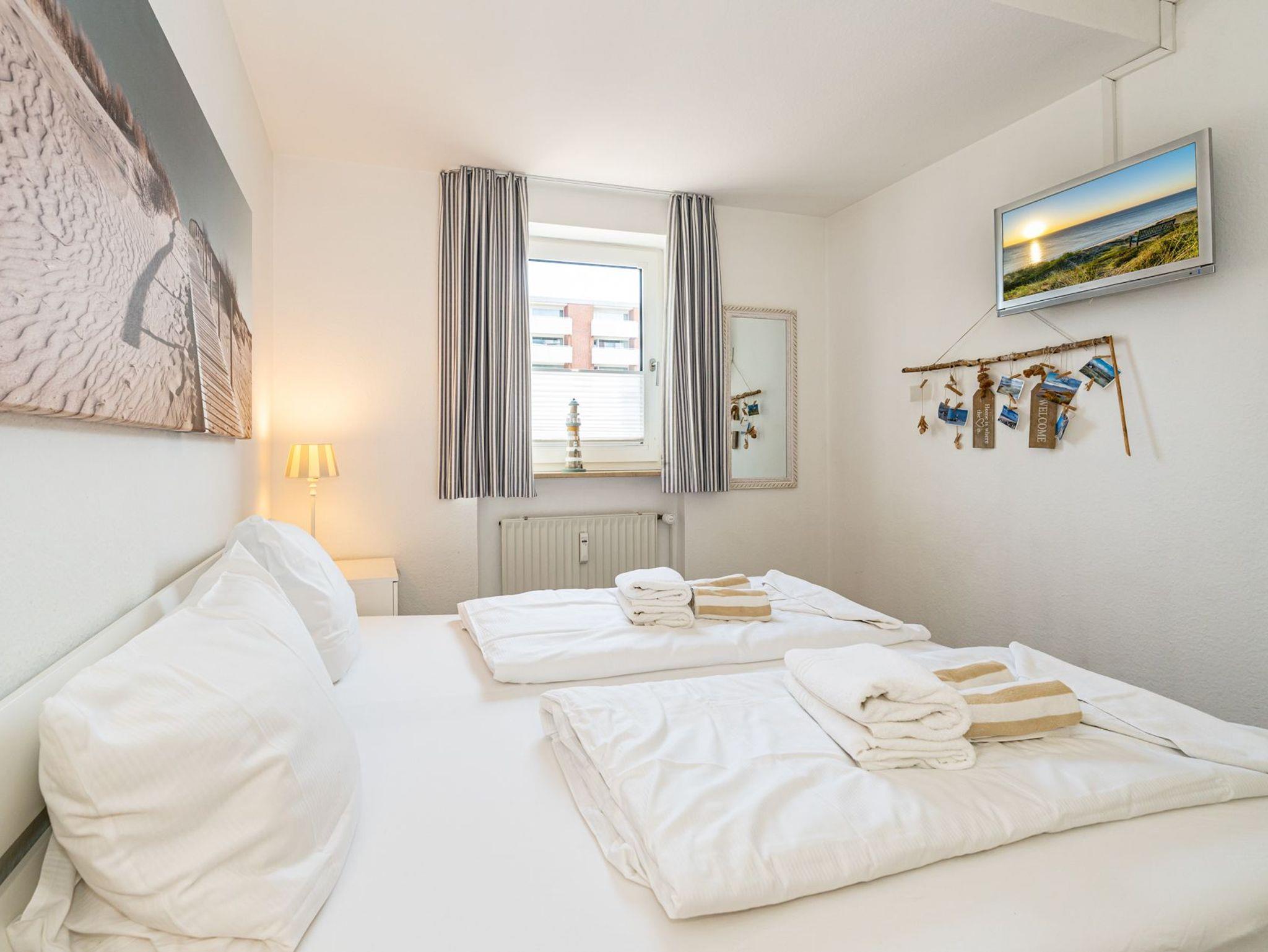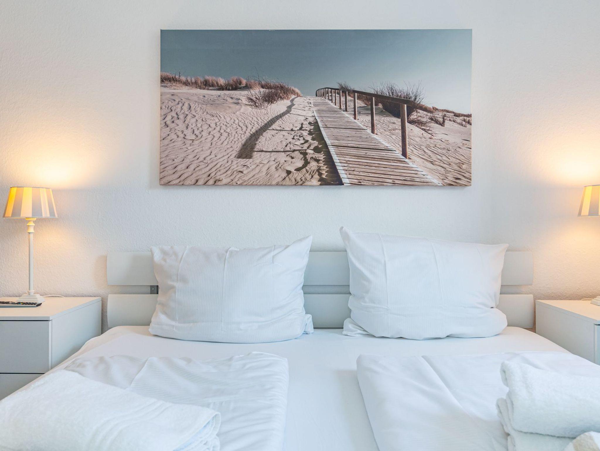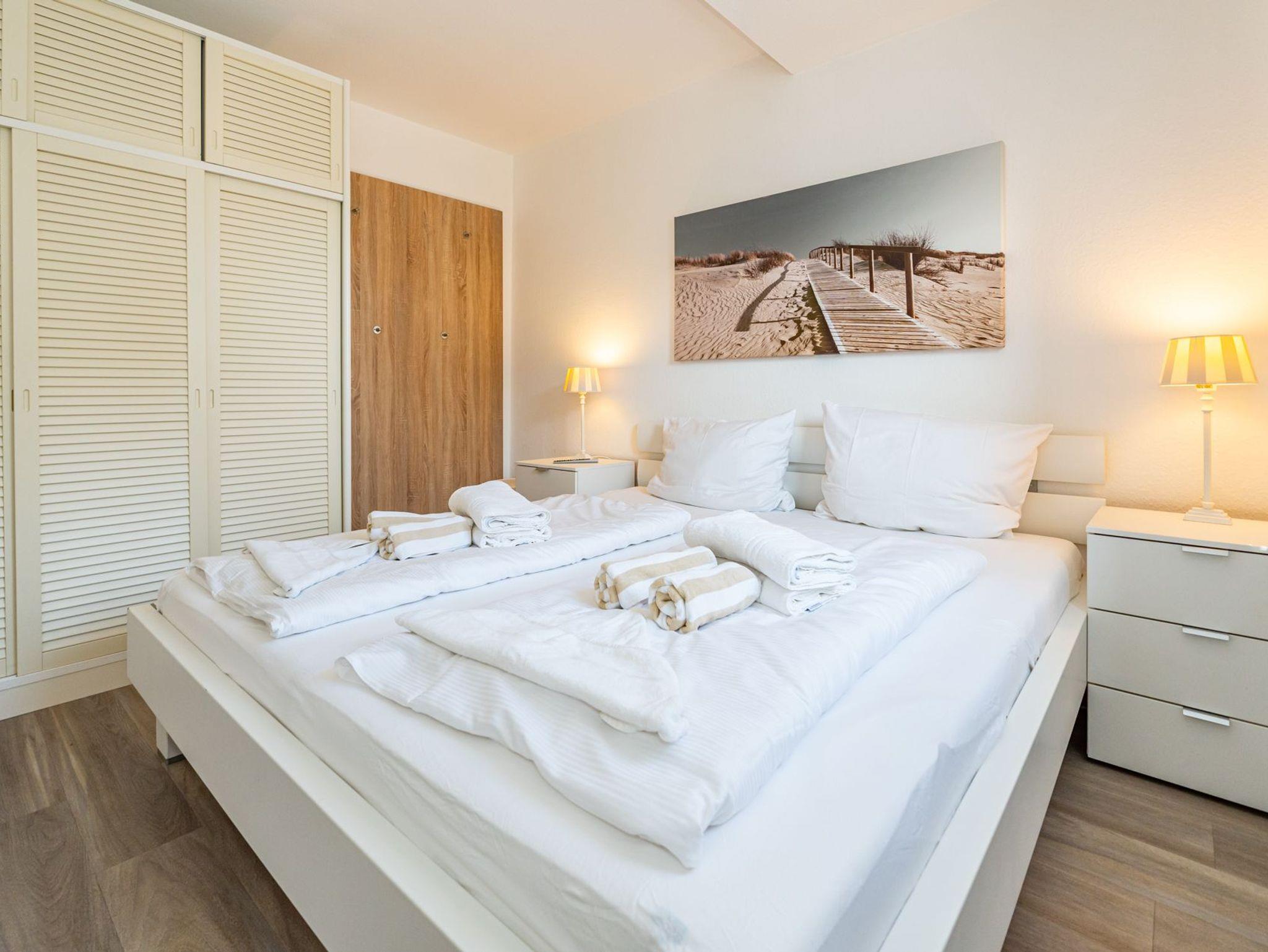 Das vom Wohnzimmer begehbare Schlafzimmer hat ein gutes Doppelbett mit zwei Einzelmatratzen (0,90 x 2,00 m), einen Kleiderschrank und zwei Nachttische.