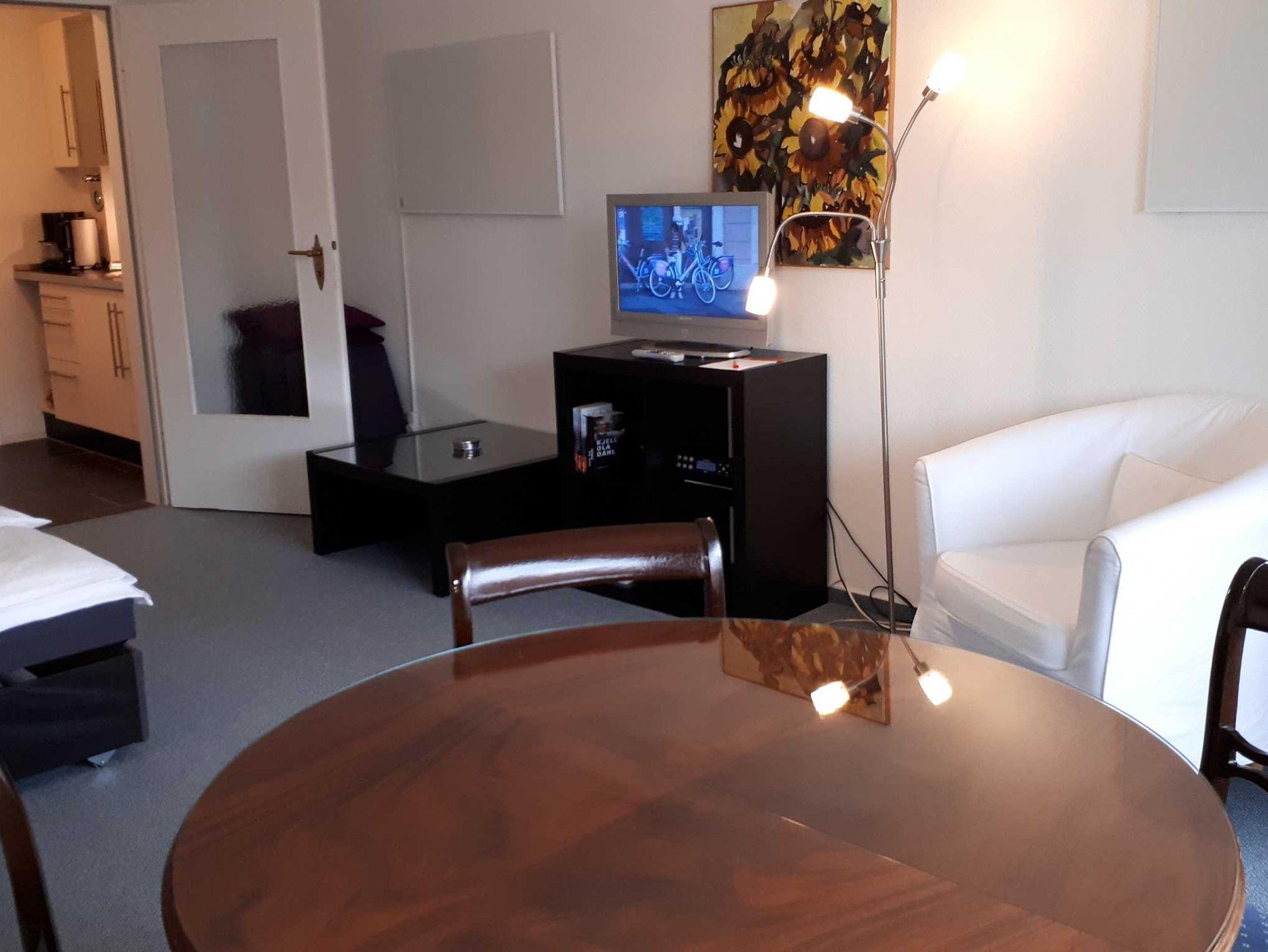 Ein gemütliches Wohnzimmer mit Couchgarnitur (Schlafsofa), Flachbild-TV und Essecke ist der Mittelpunkt der Wohnung.