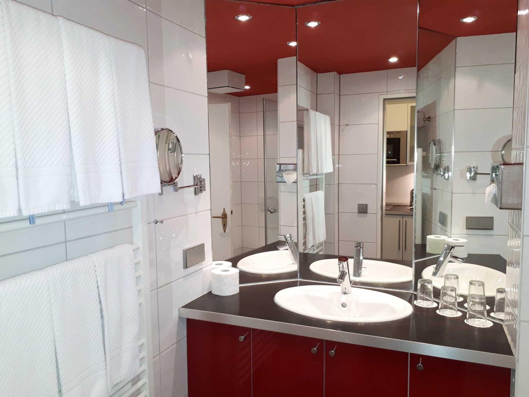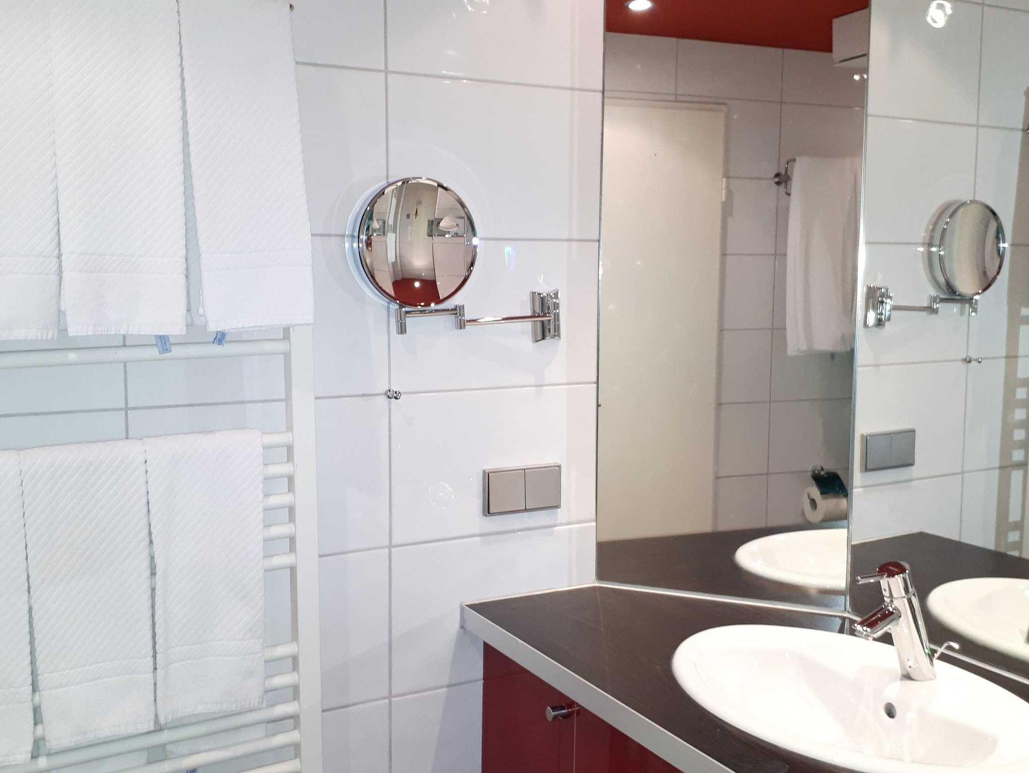 Ein elegantes Bad mit Waschtisch, Dusche, WC, Handtuchwärmer und Haartrockner.