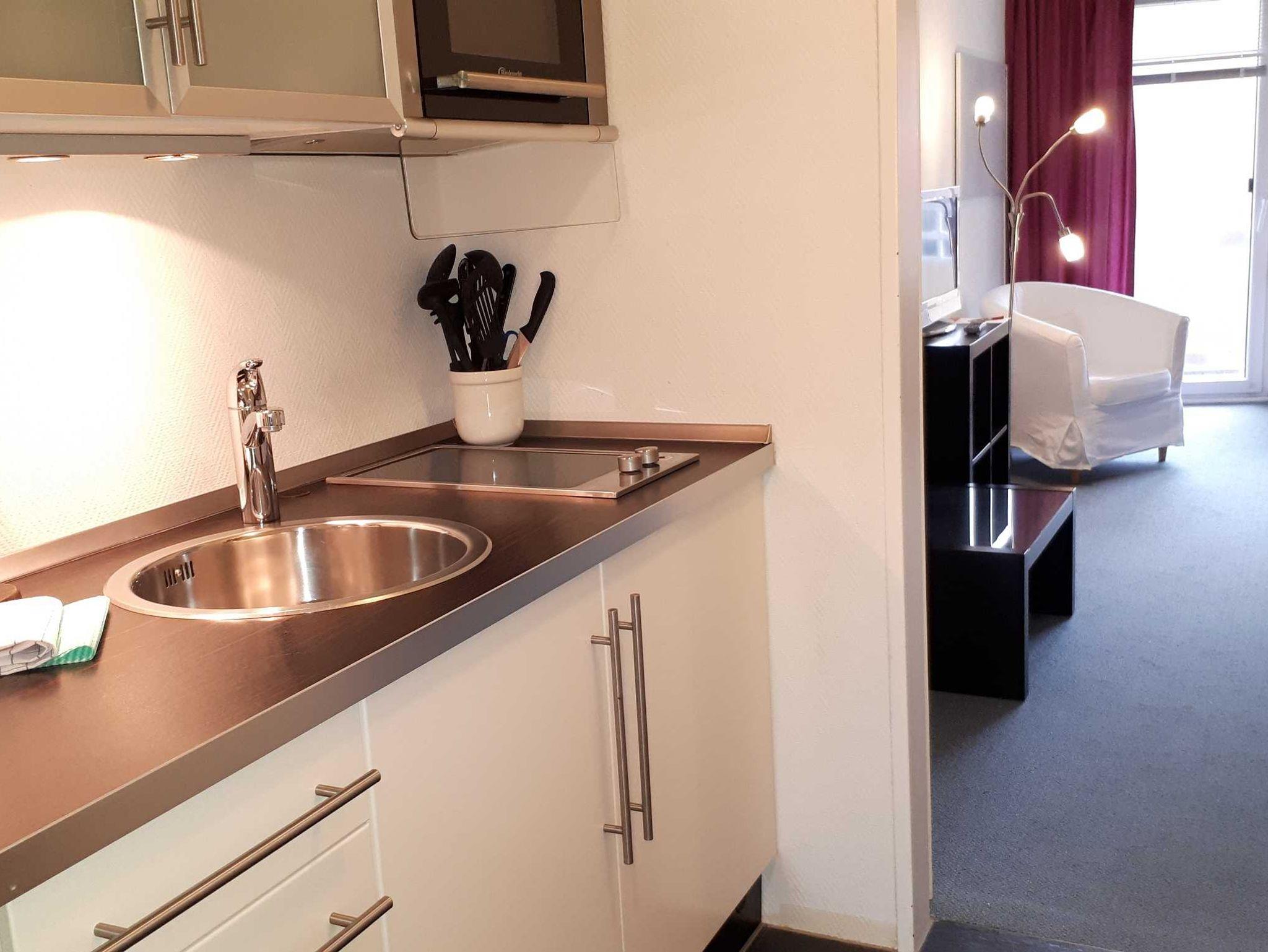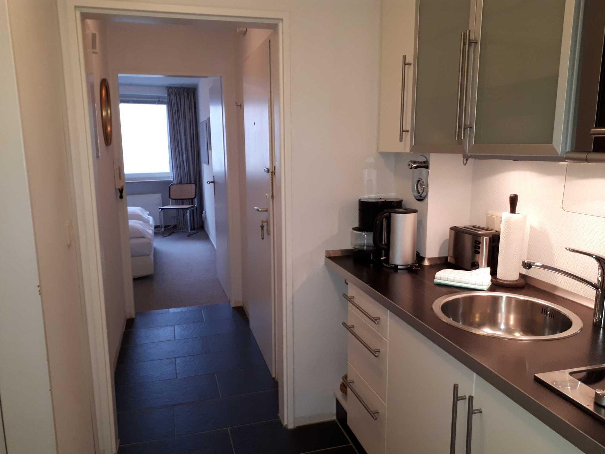 Die moderne Küchennische ist ausgestattet mit 2-Plattencerankochfeld, Mikrowelle, Kühlschrank mit Gefriermöglichkeit, Kaffeemaschine, Wasserkocher, Toaster und Geschirr für den täglichen Bedarf sind selbstverständlich.