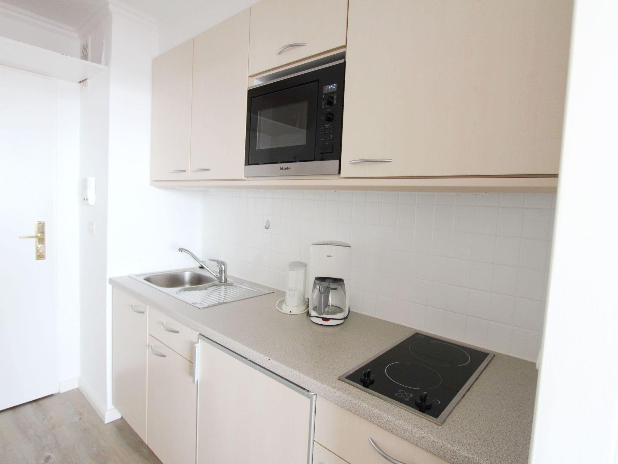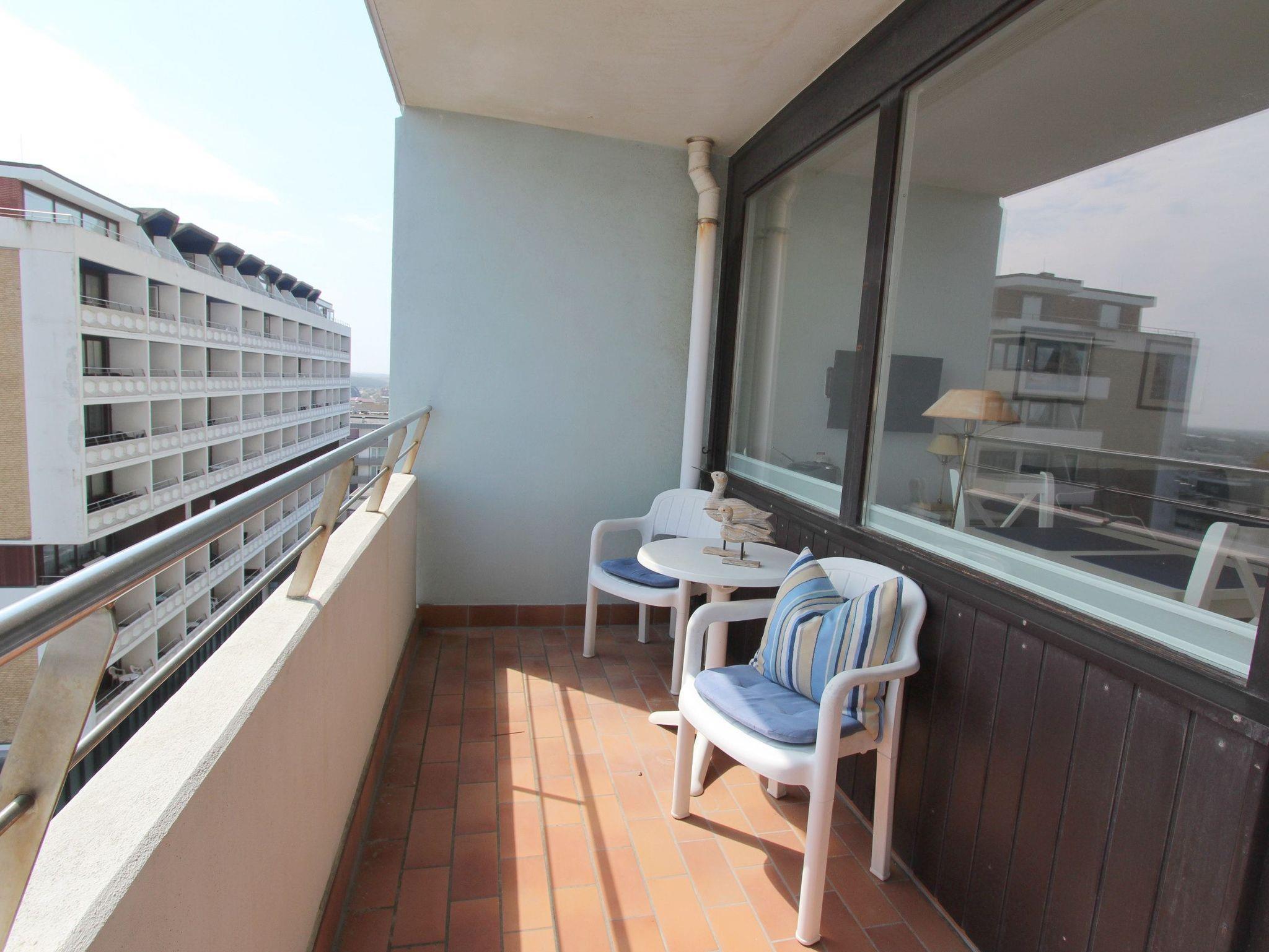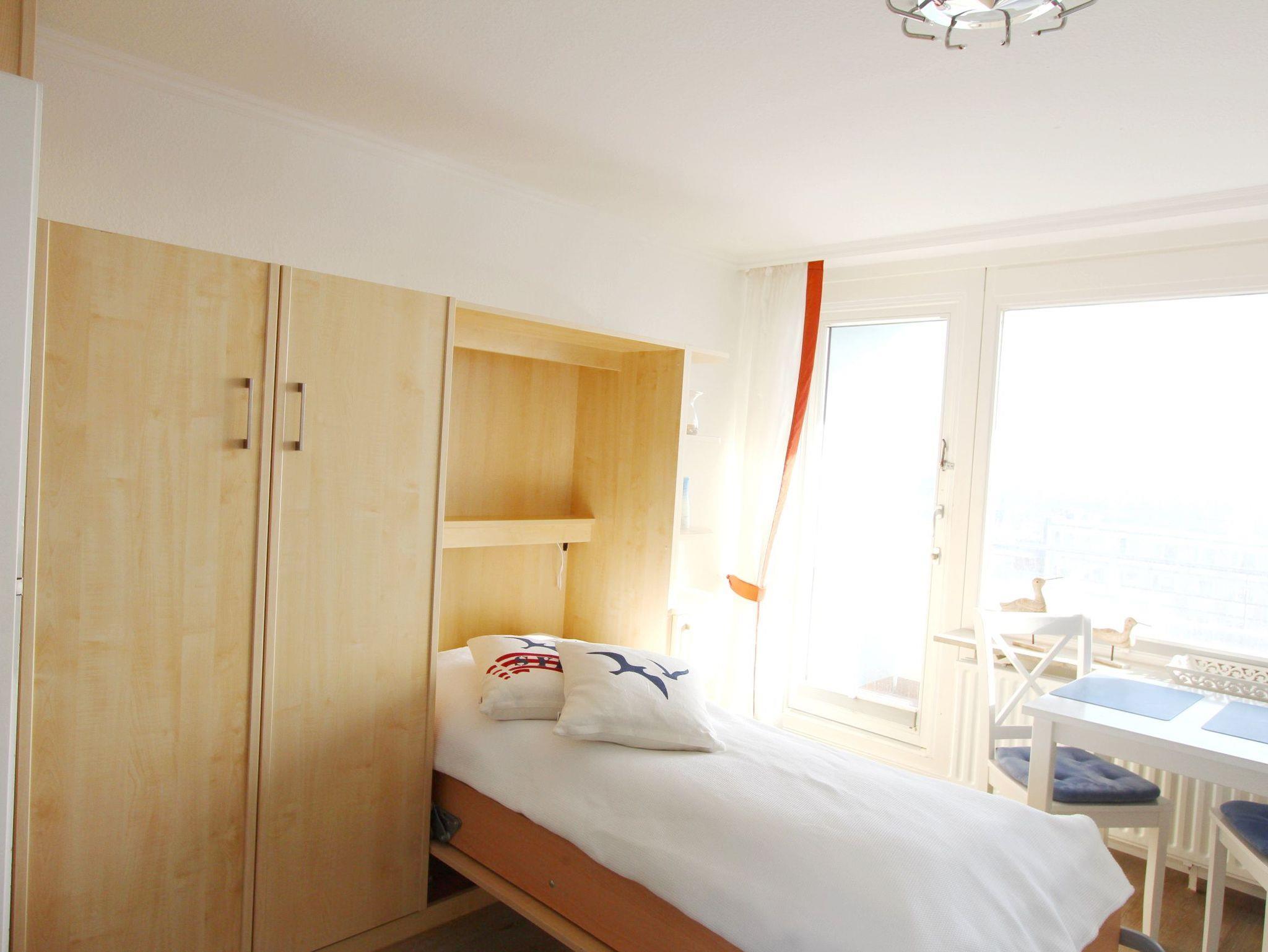 Einzimmerwohnung in der 6. Etage im Haus Metropol mit einem schönen Blick über die Insel und bei gutem Wetter bis zum Wattenmeer. Die Wohnung hat einen Ostbalkon mit Balkonmöbeln auf dem sie jeden Morgen die Sonne gegrüßt. Im Wohn-Schlafraum gibt es Einzelschrankbetten, einen Essplatz am Fenster mit 2 Stühlen sowie eine Couch. Es wurde Designfussboden in Holzoptik verlegt und die Fenster sind mit Verdunklungsrollos ausgestattet. Das Badezimmer hat eine Badewanne, einen Fön, einen Kosmetikspiegel und ausreichend Abstellfläche für Ihre persönlichen Dinge. Die Küchenzeile im Flur verfügt über 2 Ceranfeldkochplatten und eine Mikrowelle. Zur technischen Ausstattung dieser Nichtraucherwohnung gehört ein Flachbildfernseher und ein CD-Radio. Ein freies WLAN Netzwerk (WEG Haus Metropol - Passwortfrei - ohne Gewähr) steht ihnen kostenfrei zur Verfügung. Wohnungsgröße: ca. 30 m².