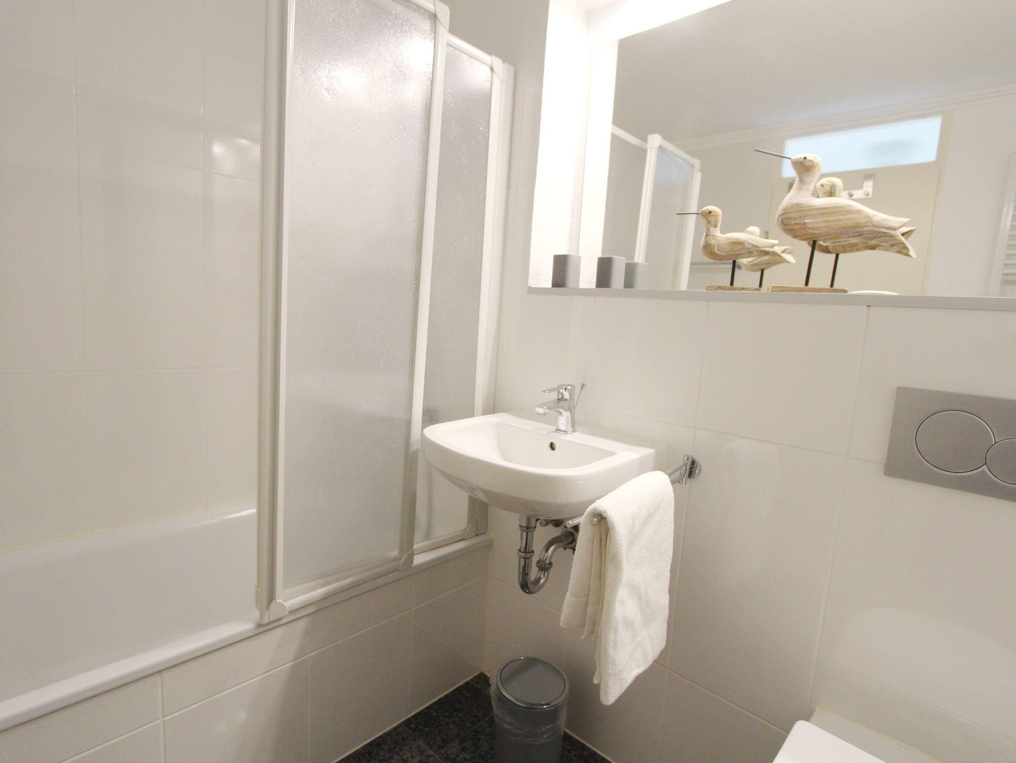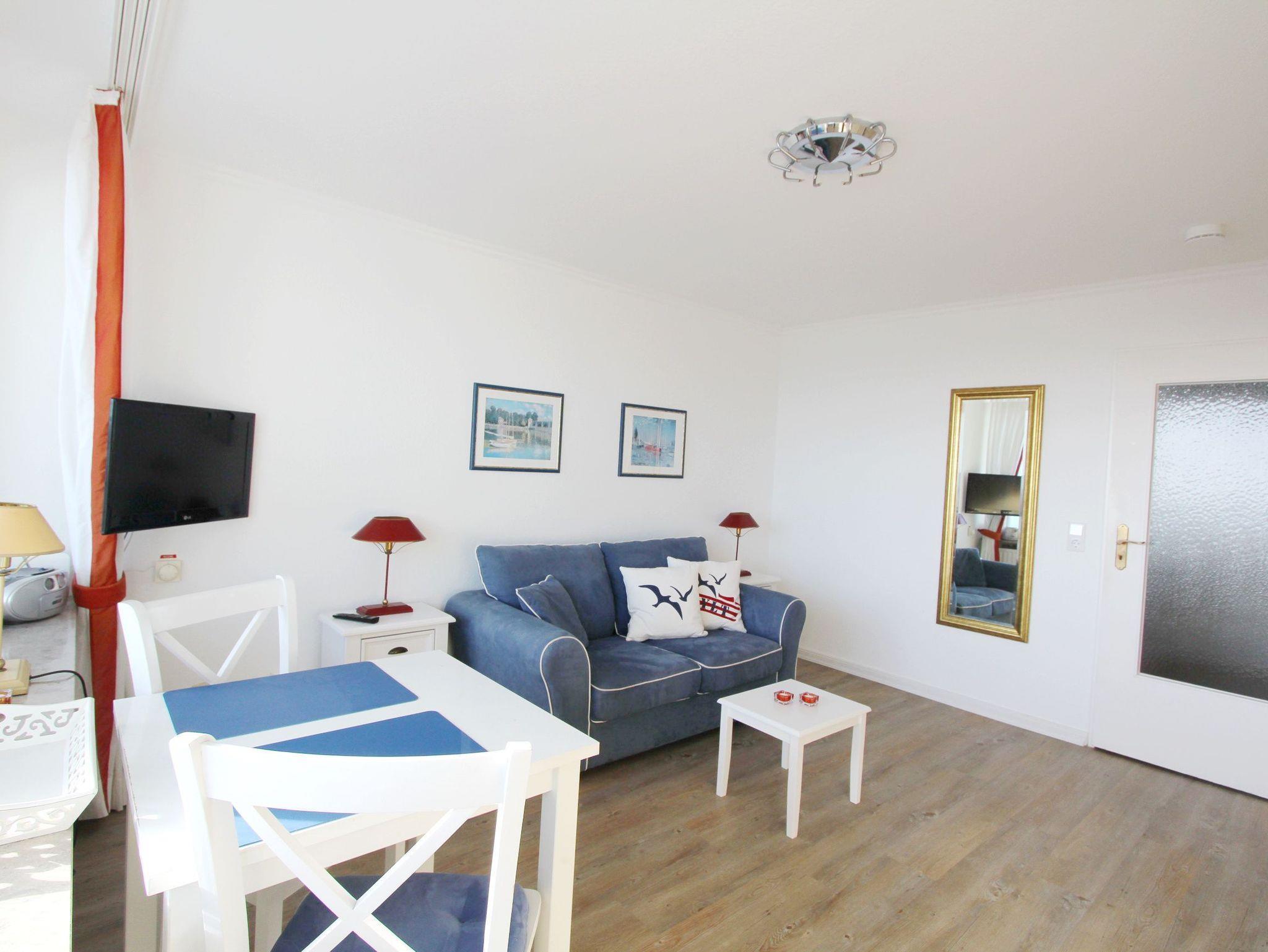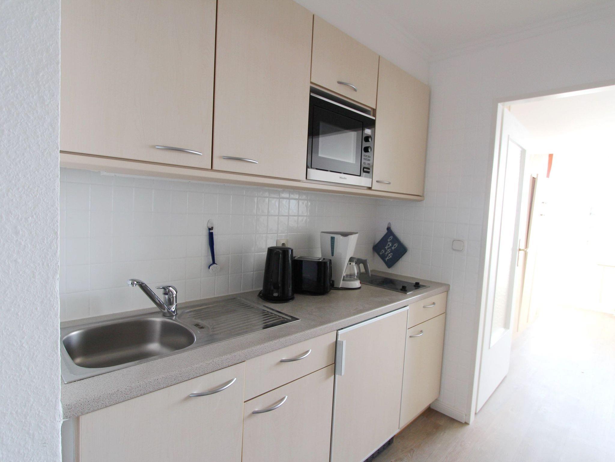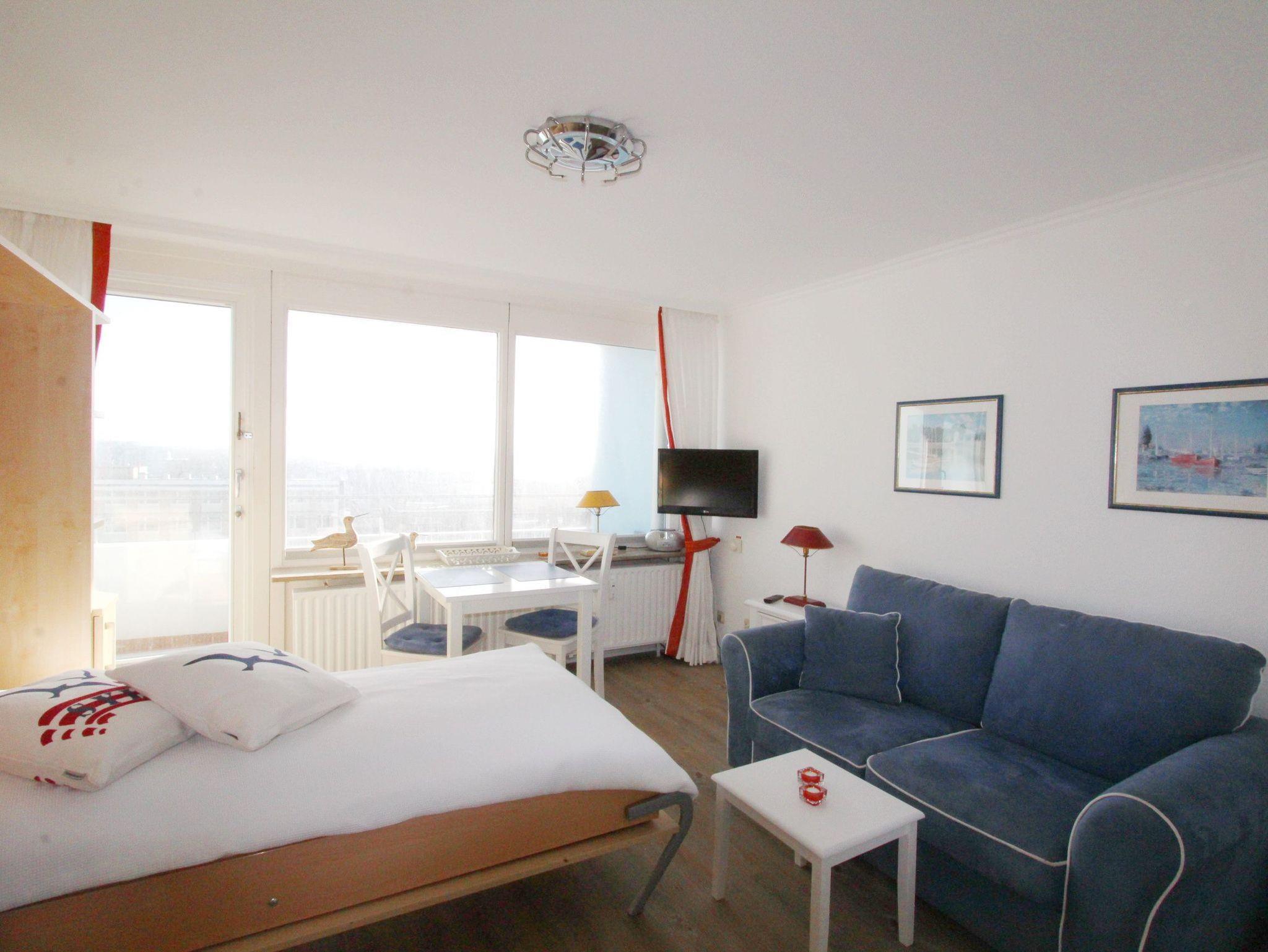Einzimmerwohnung in der 6. Etage im Haus Metropol mit einem schönen Blick über die Insel und bei gutem Wetter bis zum Wattenmeer. Die Wohnung hat einen Ostbalkon mit Balkonmöbeln auf dem sie jeden Morgen die Sonne gegrüßt. Im Wohn-Schlafraum gibt es Einzelschrankbetten, einen Essplatz am Fenster mit 2 Stühlen sowie eine Couch. Es wurde Designfussboden in Holzoptik verlegt und die Fenster sind mit Verdunklungsrollos ausgestattet. Das Badezimmer hat eine Badewanne, einen Fön, einen Kosmetikspiegel und ausreichend Abstellfläche für Ihre persönlichen Dinge. Die Küchenzeile im Flur verfügt über 2 Ceranfeldkochplatten und eine Mikrowelle. Zur technischen Ausstattung dieser Nichtraucherwohnung gehört ein Flachbildfernseher und ein CD-Radio. Ein freies WLAN Netzwerk (WEG Haus Metropol - Passwortfrei - ohne Gewähr) steht ihnen kostenfrei zur Verfügung. Wohnungsgröße: ca. 30 m².