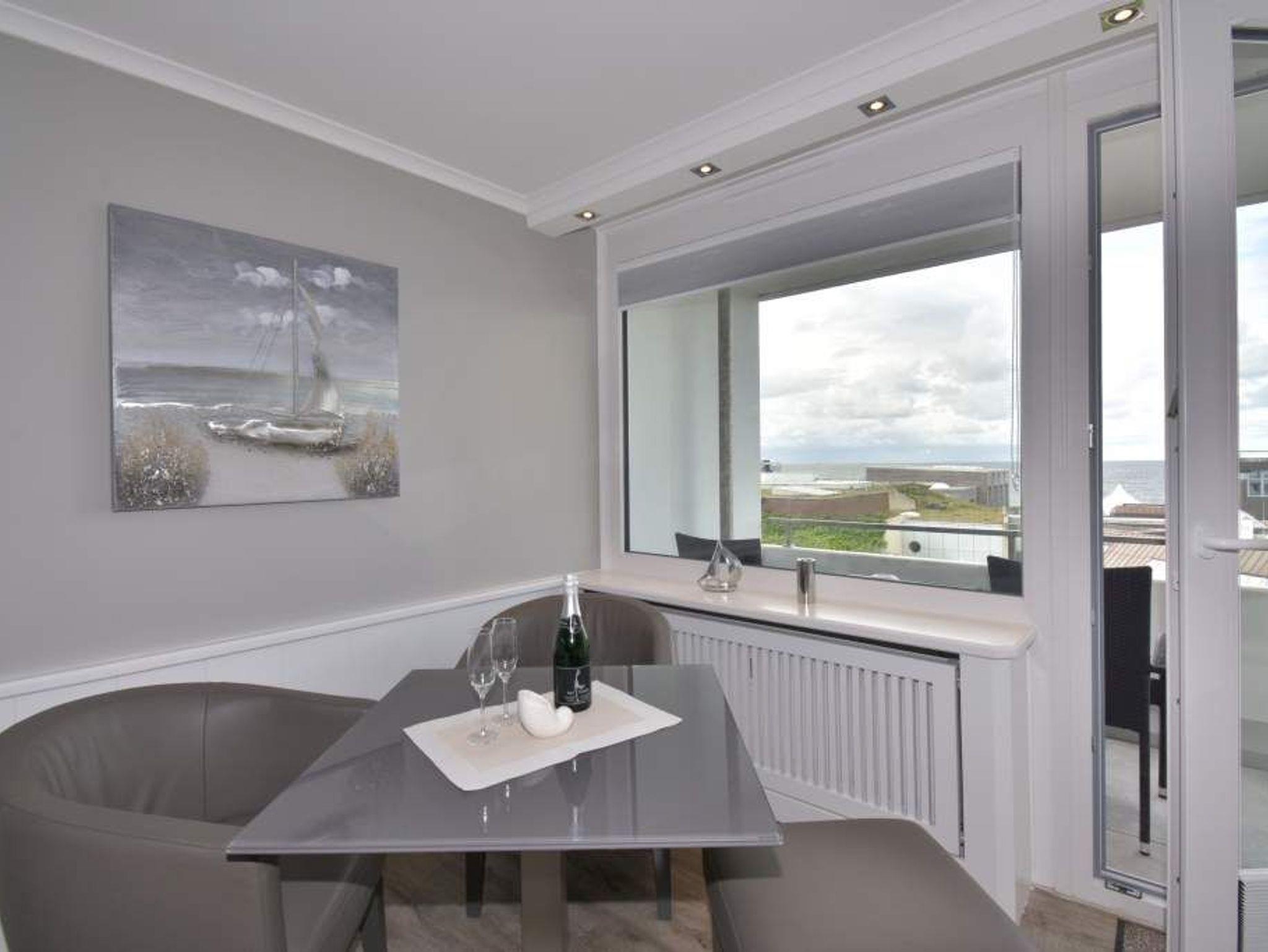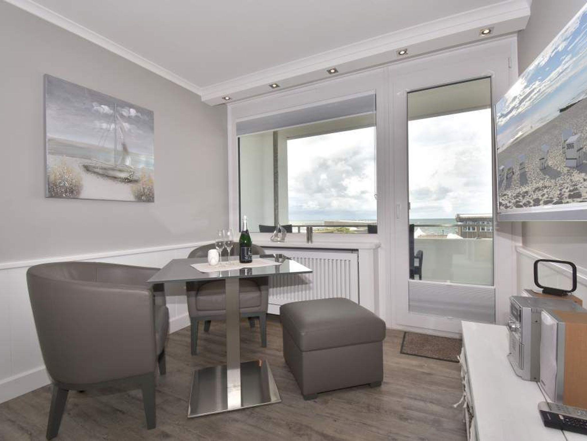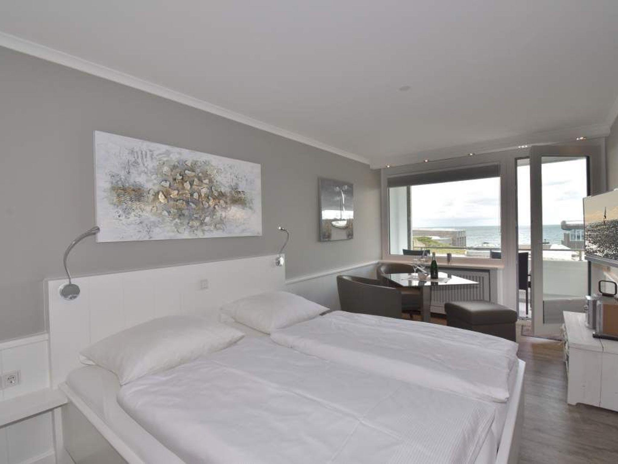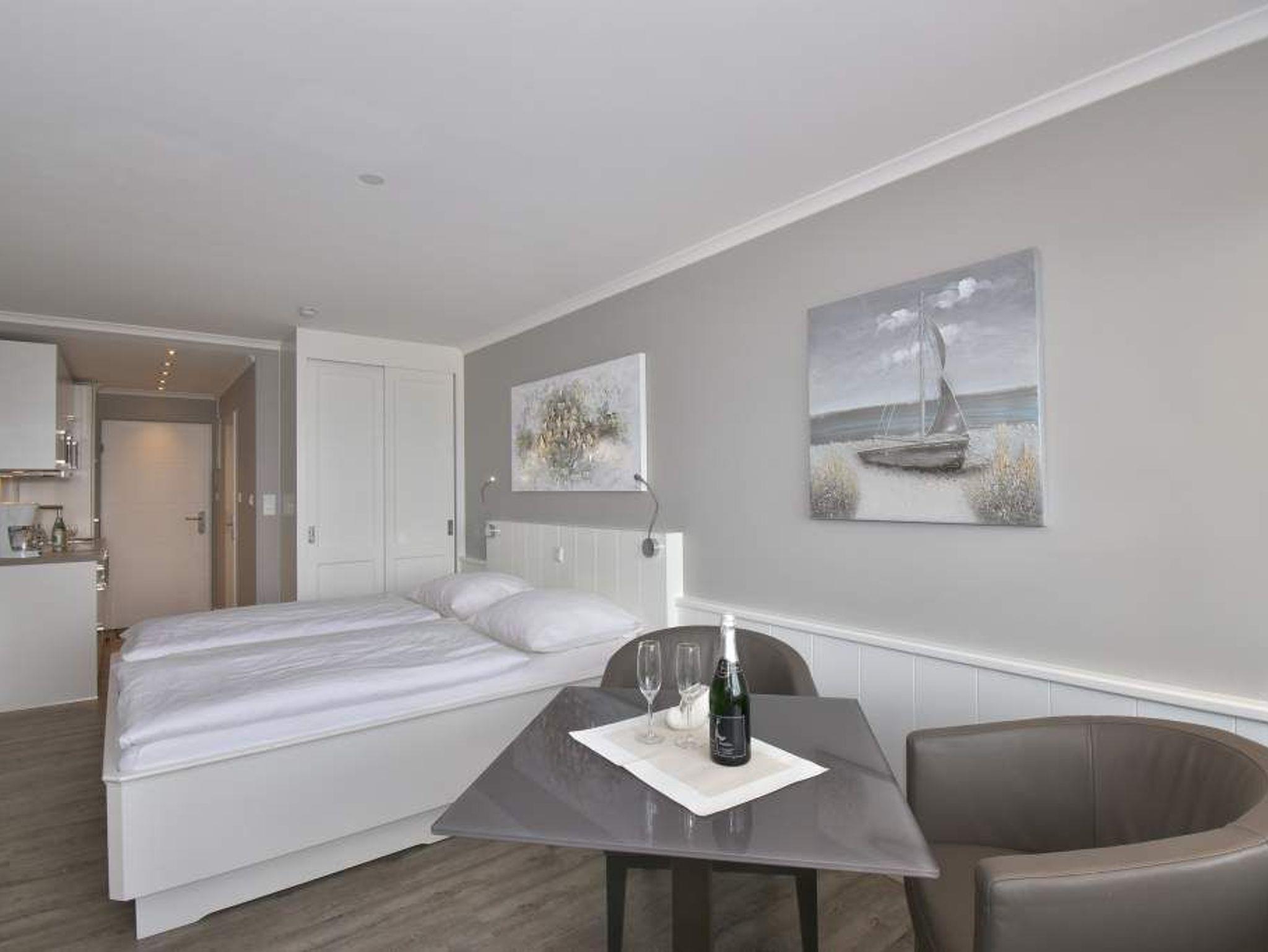 Individuell gestaltete 1-Zimmer-Nichtraucher-Ferienwohnung (ca. 25 qm) in der 4. Etage zur Seeseite mit Westloggia und herrlichem Meerblick, (Nachmittagssonne mit Balkonmöbeln und Auflagen) für max. 2 Personen. Vom Vorflur mit Garderobe und Küchenzeile gelangt man in das kombinierte Wohn-/Schlafzimmer (mit Austritt zum Balkon) und in das moderne Duschbad/WC.