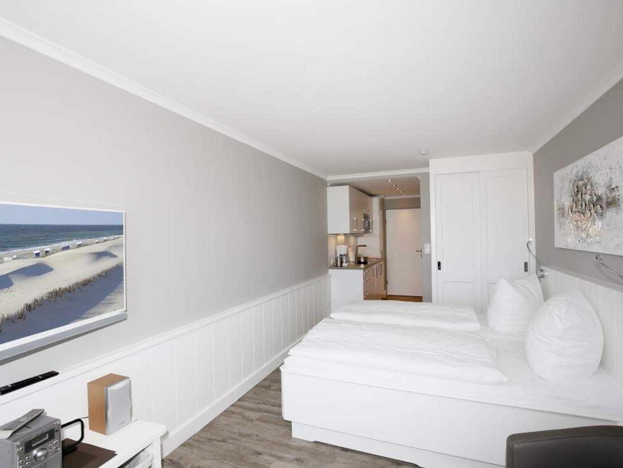 Der Wohn-/Schlafraum besteht aus einem feststehendem Doppelbett, zwei Sesseln, Flachbild-TV, Radio-CD. Die moderne Küchenzeile ist voll ausgestattet mit einem Geschirrspüler, einer Nespresso-Maschine, einem Cerankochfeld, einer Mikrowelle mit Grillfunktion sowie einem Kühlschrank mit 3*-Gefrierfach. Kaffeemaschine, Wasserkocher und Toaster sind selbstverständlich Teil der Grundausstattung. Das neu gestaltete Duschbad überzeugt durch eine komfortable Dusche, ein modernes WC, einen eleganten Waschtisch, einen Handtuchtrockner und einen Fön.