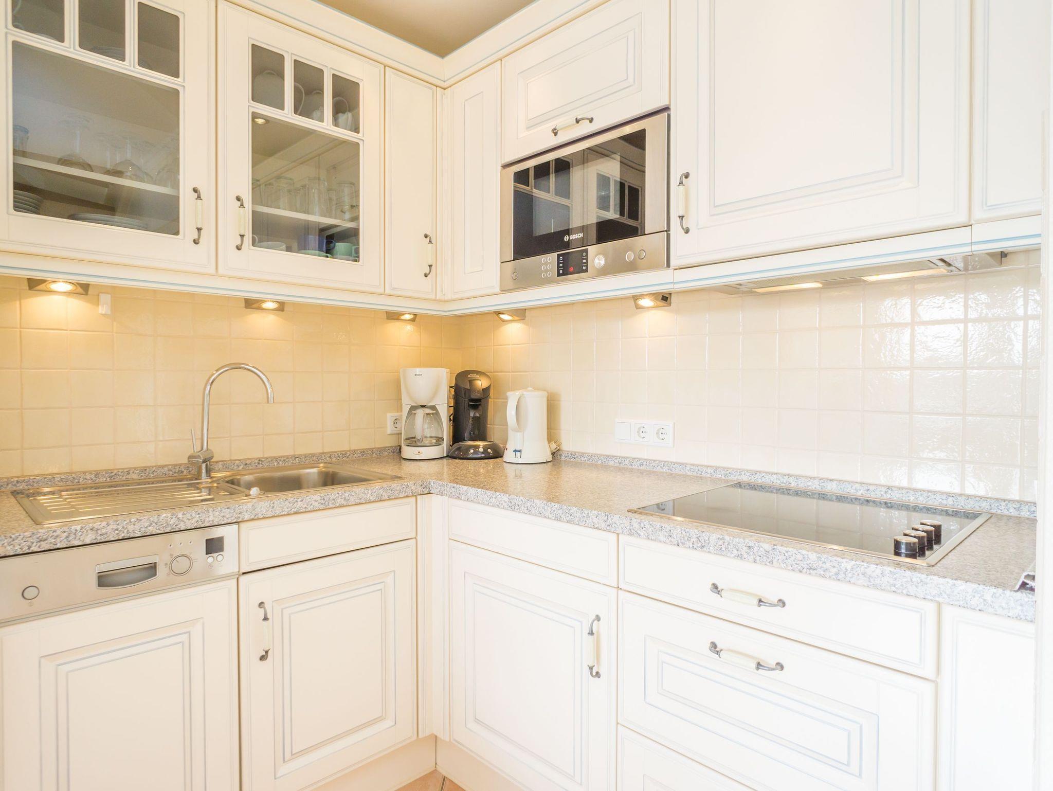 Die neue Küchenzeile hat einen Geschirrspüler, eine Mikrowelle, ein Ceranfeld mit 4 Kochfeldern und ein Kühlschrank mit 3*-Gefrierfach. Kaffeemaschine, Wasserkocher und Toaster gehören zur Grundausstattung.