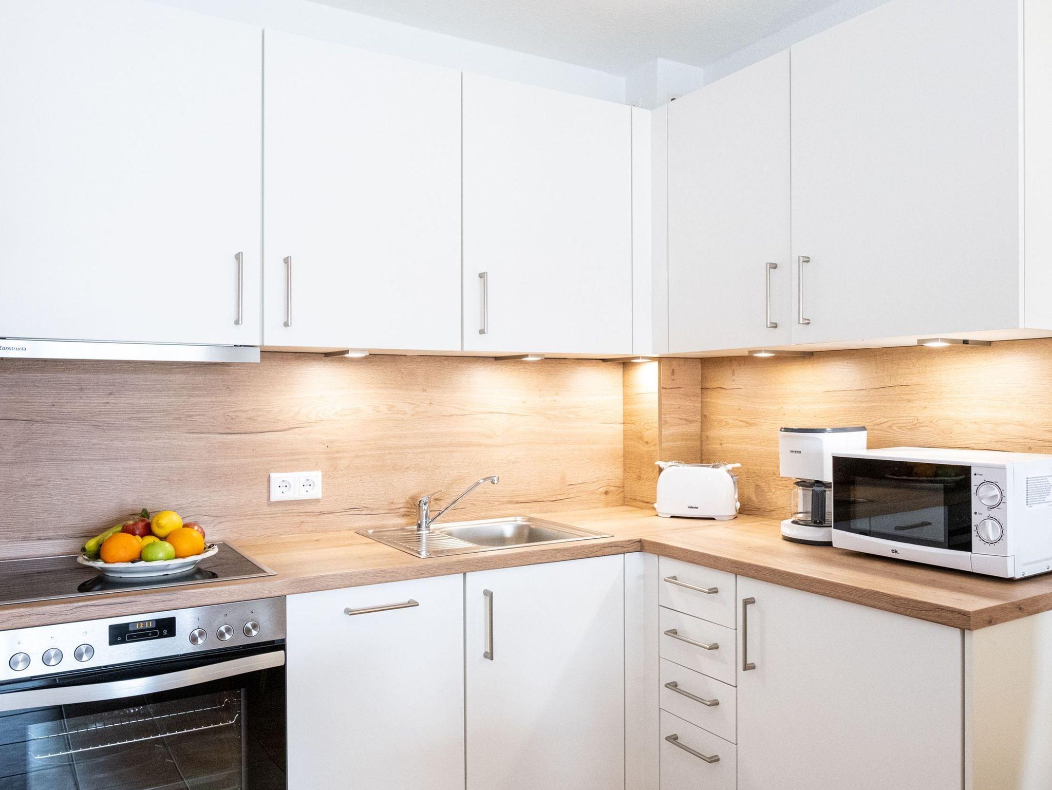 Es handelt sich um eine neue voll ausgestattete Küchenzeile, die mit dem Ess- und Wohnbereich verbunden ist. Das Wohnzimmer verfügt über eine gemütliche Schlafcouch und zwei Ohrensessel sowie einer Schrankwand mit Fernseher, Radio mit CD-Player sowie W-lan (kostenlos). Dank der bequemen Schlafcouch können problemlos vier Personen in der Wohnung unterkommen. Zu der Wohnung gehört der Garagenstellplatz Nr. 16 auf der Palette (Bis 1,70 Meter Höhe). Die maximale Fahrzeugbreite beträgt 1,90 Meter, die maximale Fahrzeuglänge 5,00 Meter und die maximale Spurweite beträgt 1,85 Meter.