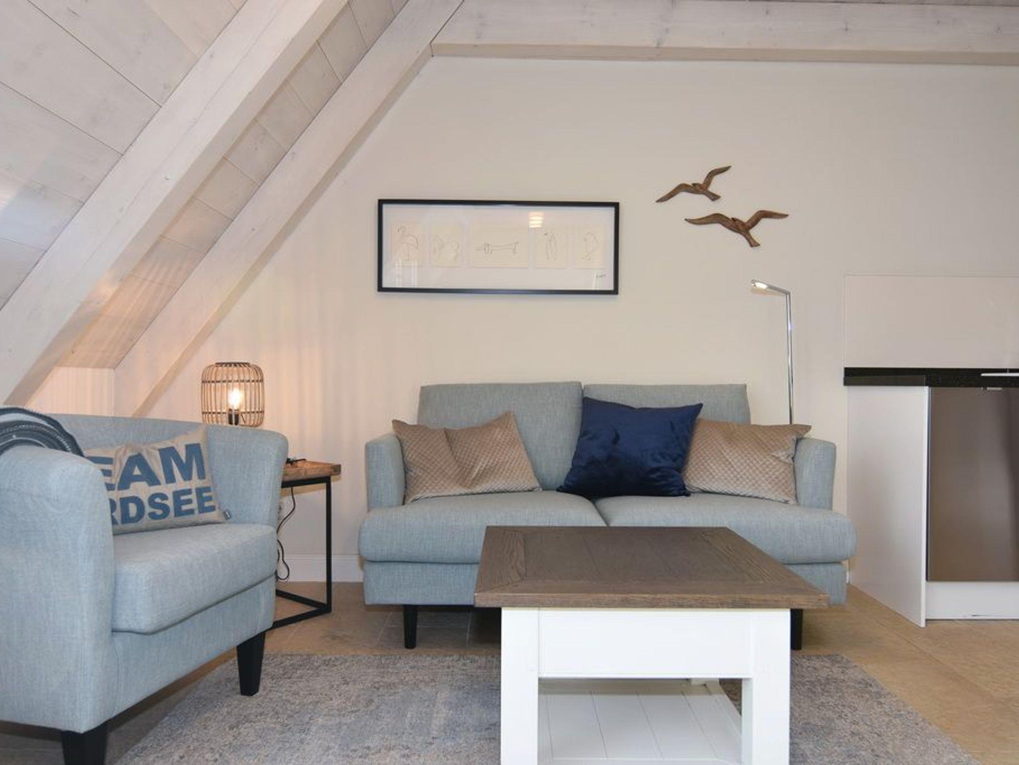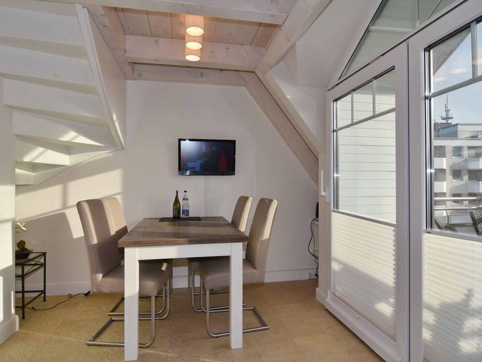 Schöne 2-Zimmer-Ferienwohnung in direkter Lage am Strandübergang. Nichtraucher-Whg.! Ca. 56m². OG/DG. Sonniges Wohnzimmer mit Couchecke, Essplatz sowie integrierter Küche mit Geschirrspüler und Mikrowelle, Flatscreen/Stereoanlage, W-Lan[nbsp] ohne Gewähr), Duschbad/WC, Südbalkon mit Balkonmöbeln. DG: Schlafzimmer mit Doppelbett (2x90x200) und Flatscreen. Pkw-Stellplatz kann kostenlos gebucht werden. Bettwäsche und Handtücher sind zur Anreise aufgezogen!