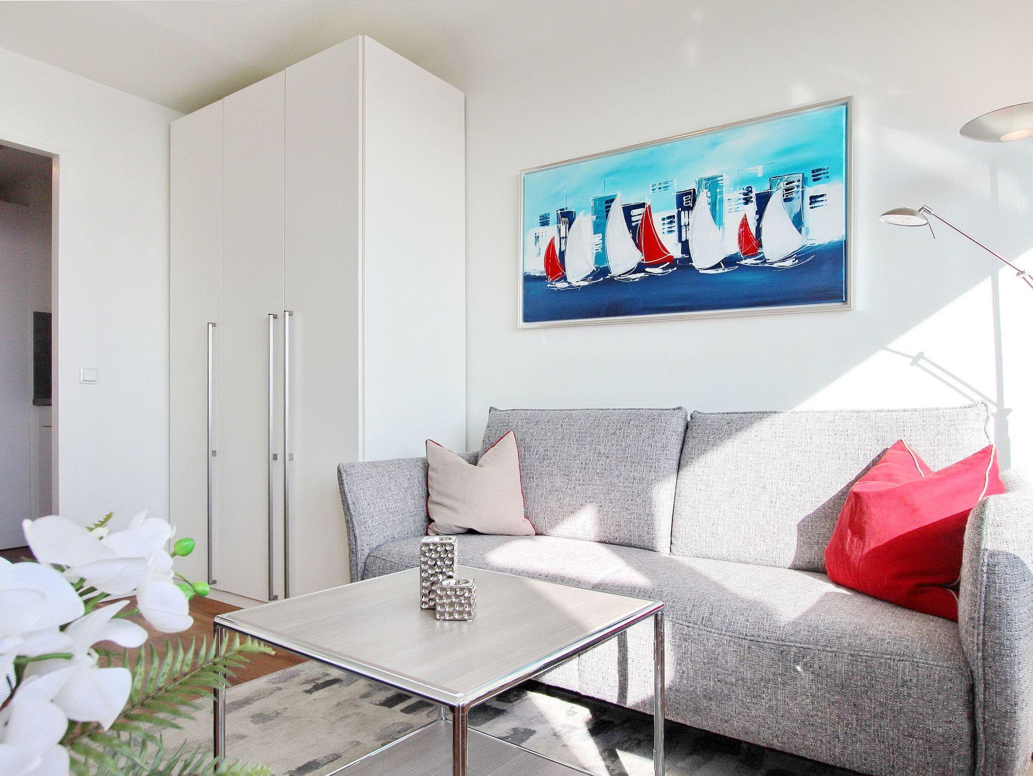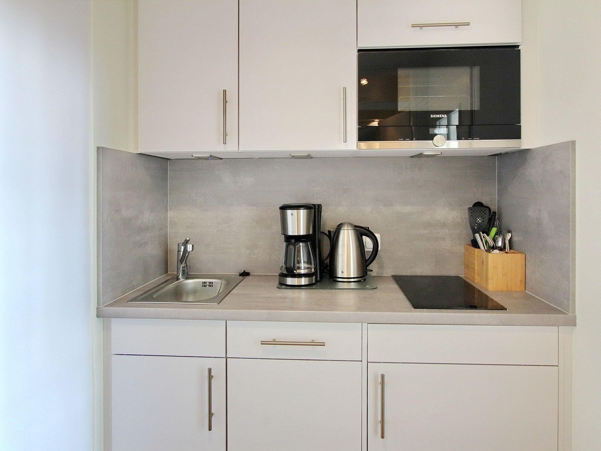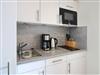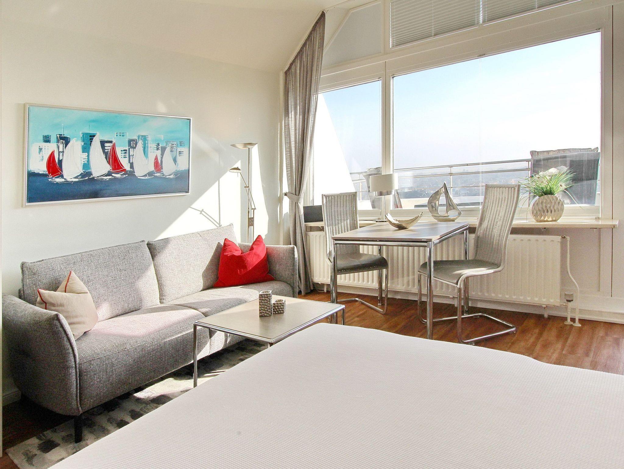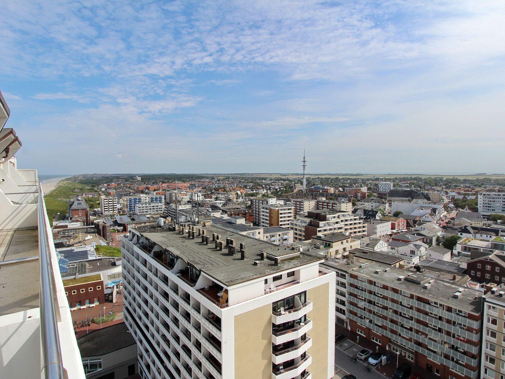 Penthousewohnung in der 14. Etage des Haus Metropol mit herrlichem Weitblick über die Insel und die Stadt. Der Wohn-/Schlafraum mit vorgelagertem Ostbalkon und Balkonmöbeln verfügt über ein komfortables Boxspringbett, eine bequeme 2 Sitzer Couch, einen Kleiderschrank mit viel Stauraum und eine Kommode. Der Essplatz mit 2 Stühlen steht direkt am Fenster und von dort aus können Sie den wunderbaren Sonnenaufgang genießen. Das helle Badezimmer hat eine Dusche. Im Flur gibt es eine Küchenzeile mit 2 Platten Ceranfeld, eine Mikrowellen-Backkombination, einen Geschirrspüler und eine zusätzliche Nespressomaschine. Stilvoll decken Sie den Tisch mit Geschirr von Thomas Trend. Zur technischen Ausstattung dieser Nichtraucherwohnung gehört: ein Radio mit CD Player und ein Flachbildfernseher. Der freie WLAN Hotspot (WEG Haus Metropol - Passwortfrei - ohne Gewähr) steht ihnen ebenfalls kostenfrei zur Verfügung. Das Penthouse ist nur über eine Treppe erreichbar, da der Aufzug in der 13. Etage endet. Wohnungsgröße: ca. 30 m².