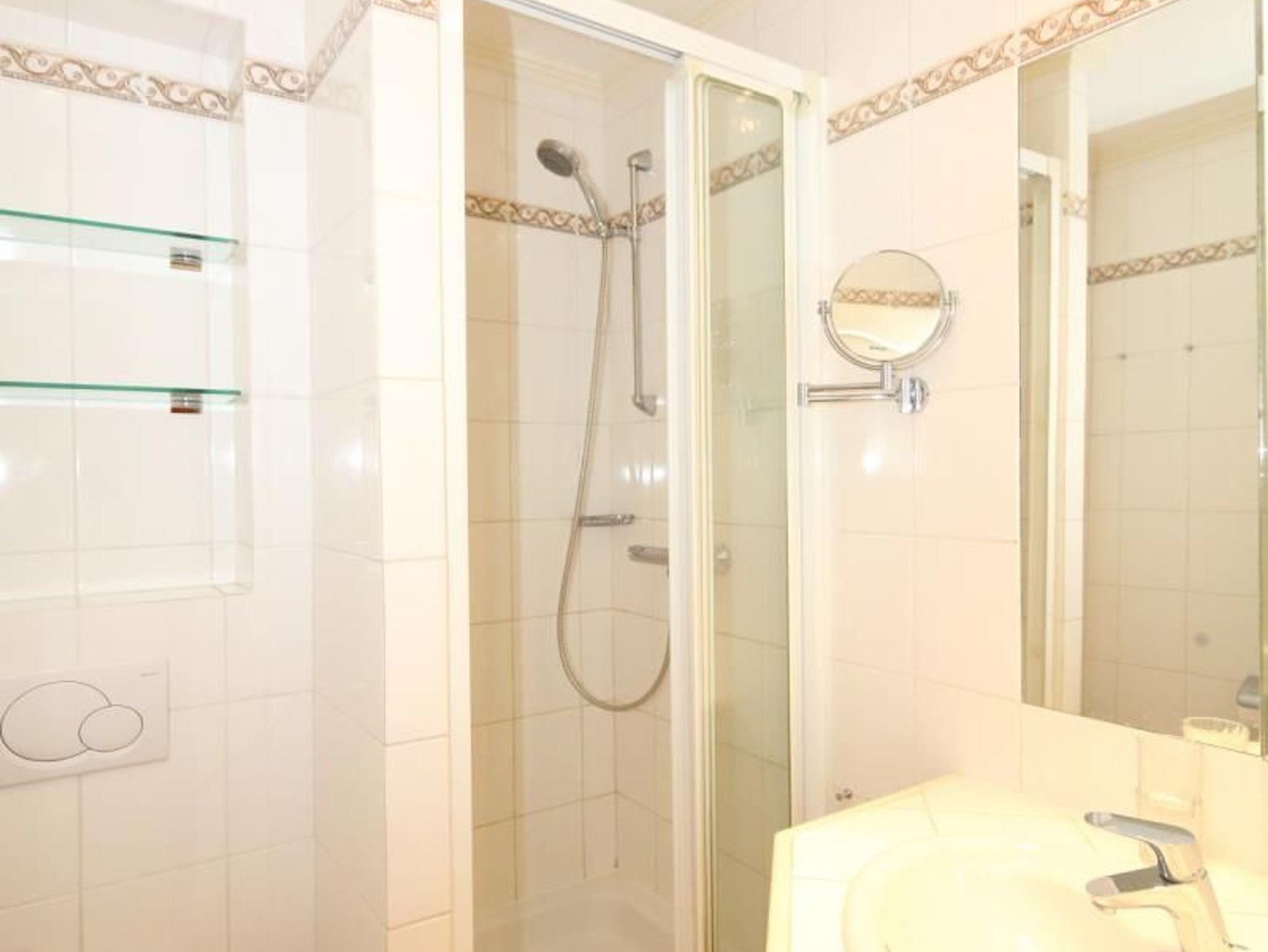 Badezimmer mit Dusche, WC, Waschtisch. Ausreichend Handtücher und Vorleger.