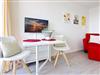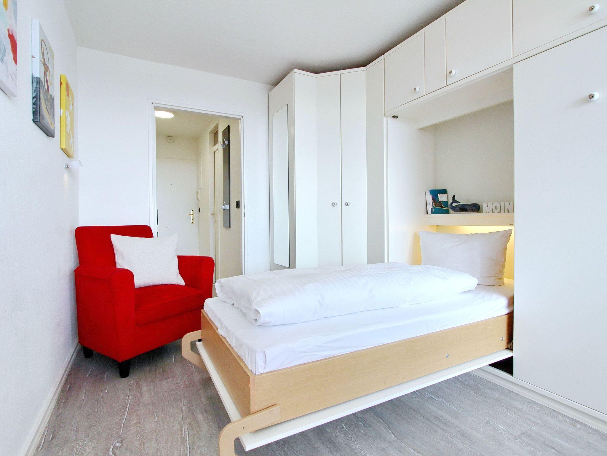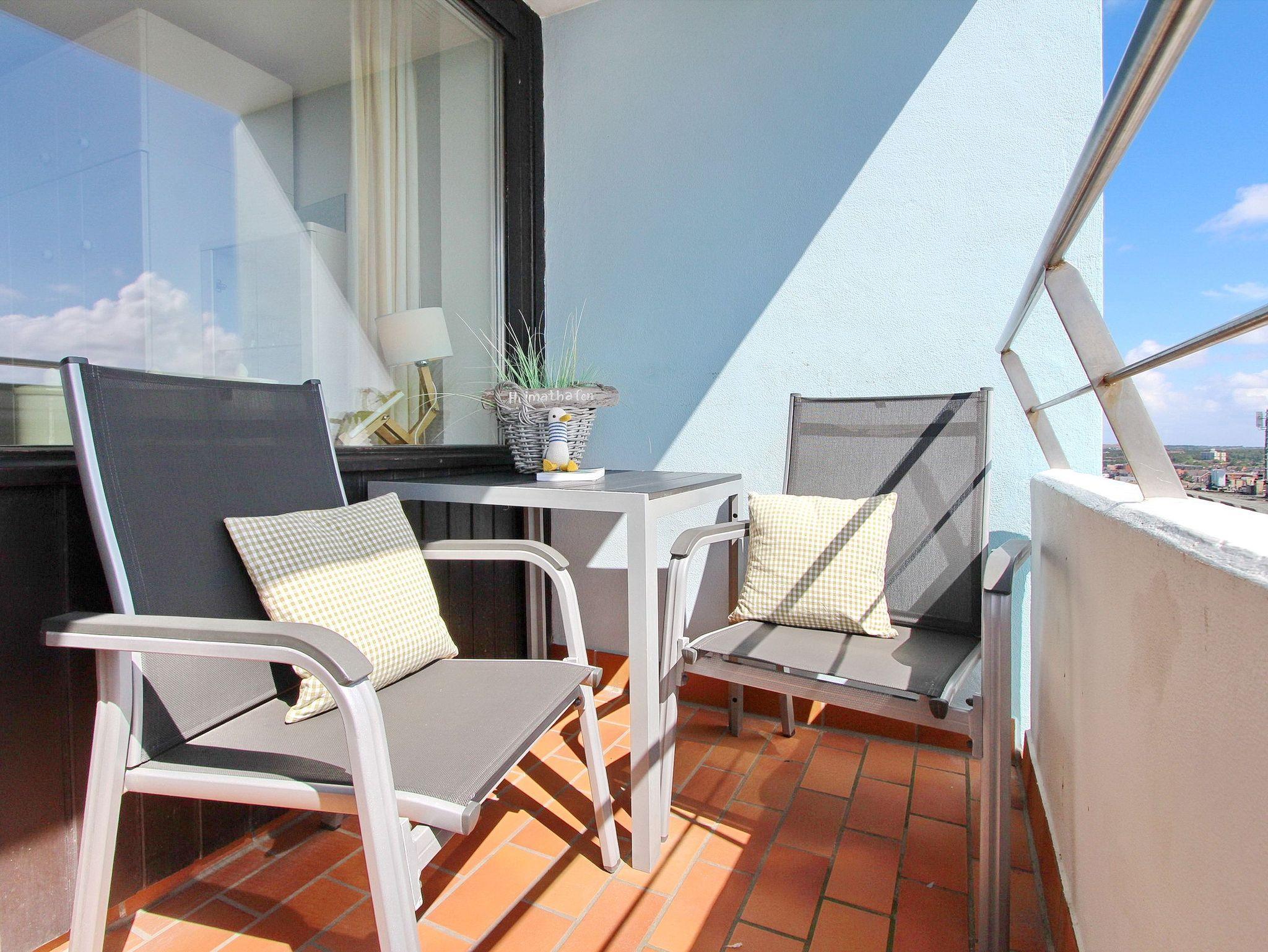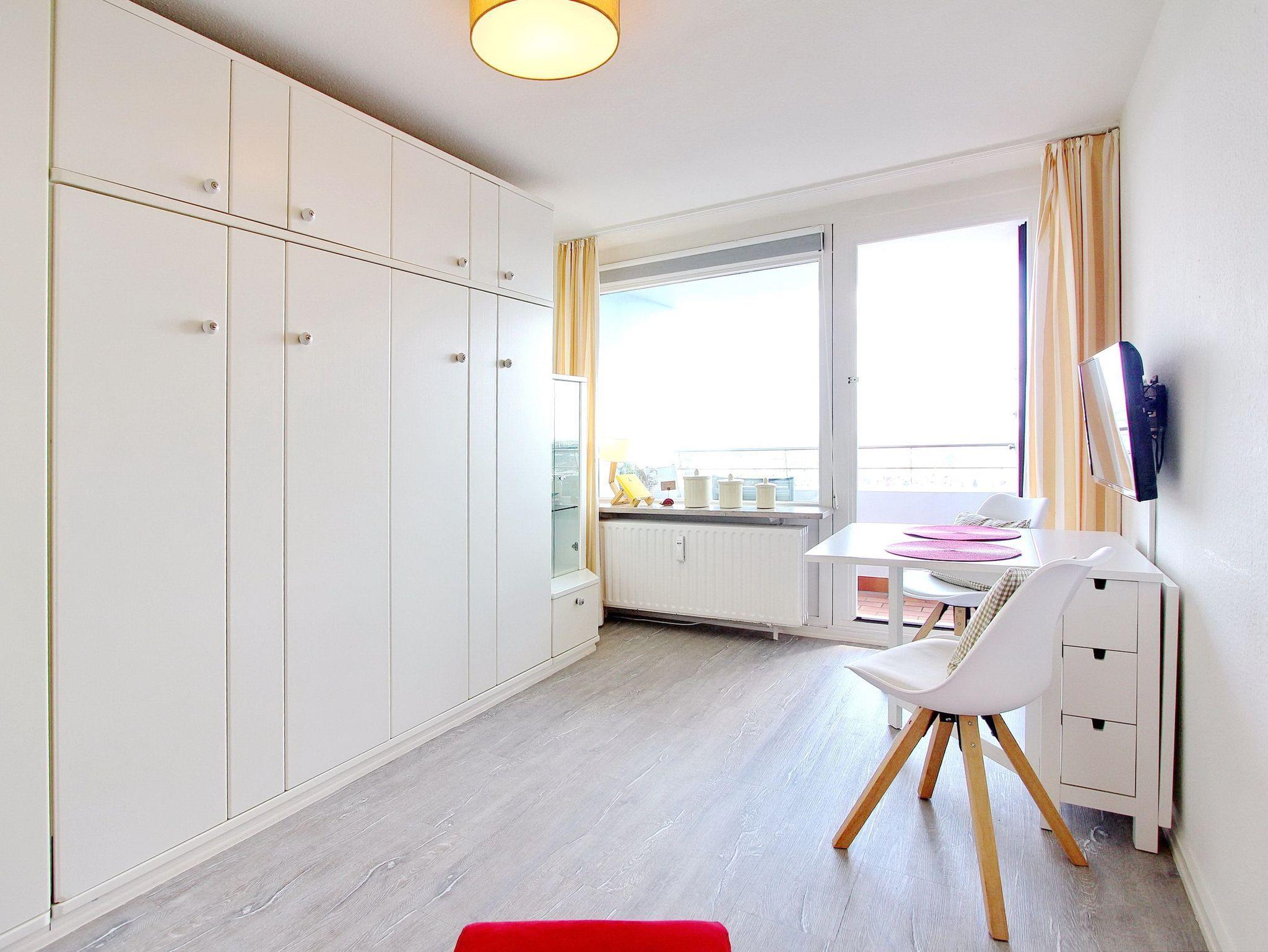 Diese Einzimmerwohnung in der 11. Etage im Haus Metropol hat einen wunderbaren Blick über die Insel Sylt und die Westerländer Innenstadt. Vom Balkon aus (ausgestattet mit 2 Stühlen und einem Tisch) können Sie jeden Morgen einen tollen Sonnenaufgang genießen. Der kombinierte Wohn-Schlafraum ist mit 2 Einzelschrankbetten, einem Sessel mit Fusshocker und einem Essplatz mit 2 Stühlen eingerichtet. Die große Schrankwand bietet viel Platz für Ihre persönlichen Dinge und im Safe können Wertsachen sicher aufbewahrt werden. In der modernen und ganz neuen Küche im Flur, mit Mikrowellen-Backkombination, Geschirrspüler, 2 Platten Ceranfeld und zusätzlicher Nespressomaschine, können Sie sich selbst verpflegen. Das Badezimmer in weiß/blau hat eine Dusche mit Glastrennwand, einen Handtuchhalter, Schminkspiegel, mobilen Haltegriff und einen Fön. Zur technischen Ausstattung dieser Nichtraucherwohnung gehört: ein 32 Zoll Fernseher von Panasonic, eine Bluetoothanlage von Sony mit CD Spieler und der passwortfreie WLAN Netzwerk (WEG Haus Metropol - Passwortfrei - ohne Gewähr) kann genutzt werden. Für die kleinen Syltgäste gibt es eine extra Spielzeugkiste und eine Toniebox mit Hörspiel- und Kreativtonies. Diese, mit viel Liebe zum Detail eingerichtete, Wohnung ist ca. 23m² groß.