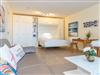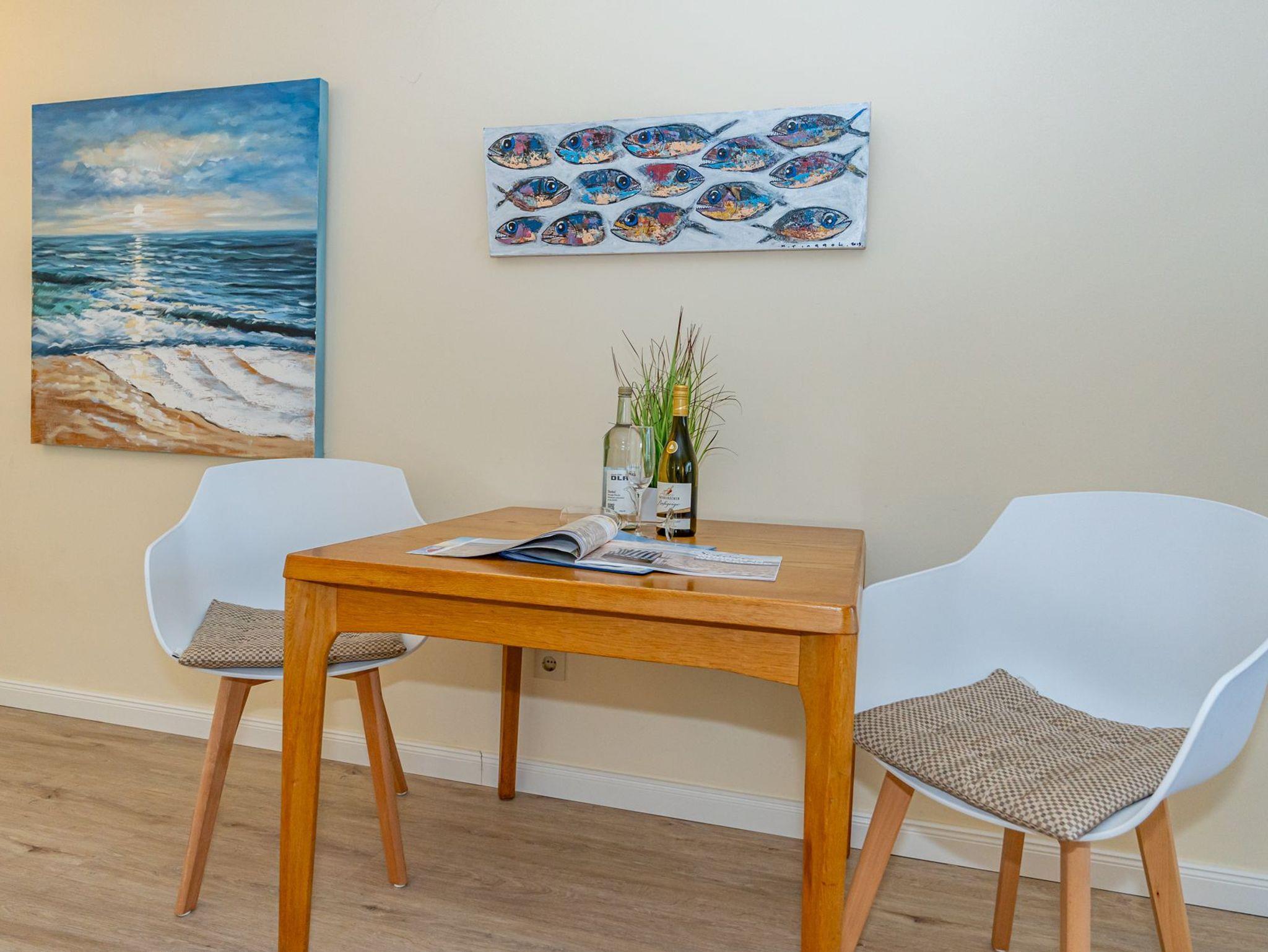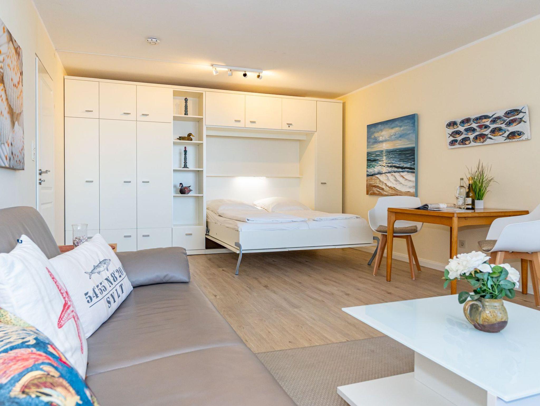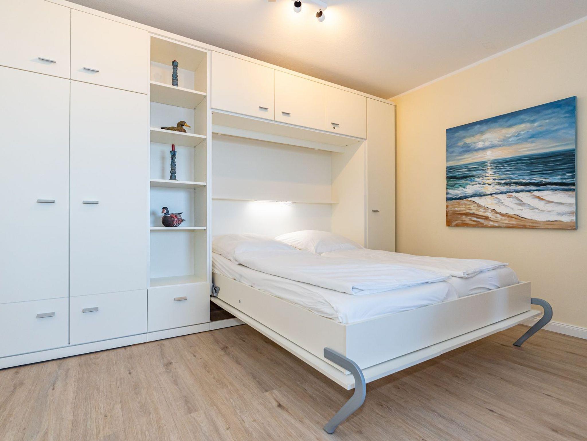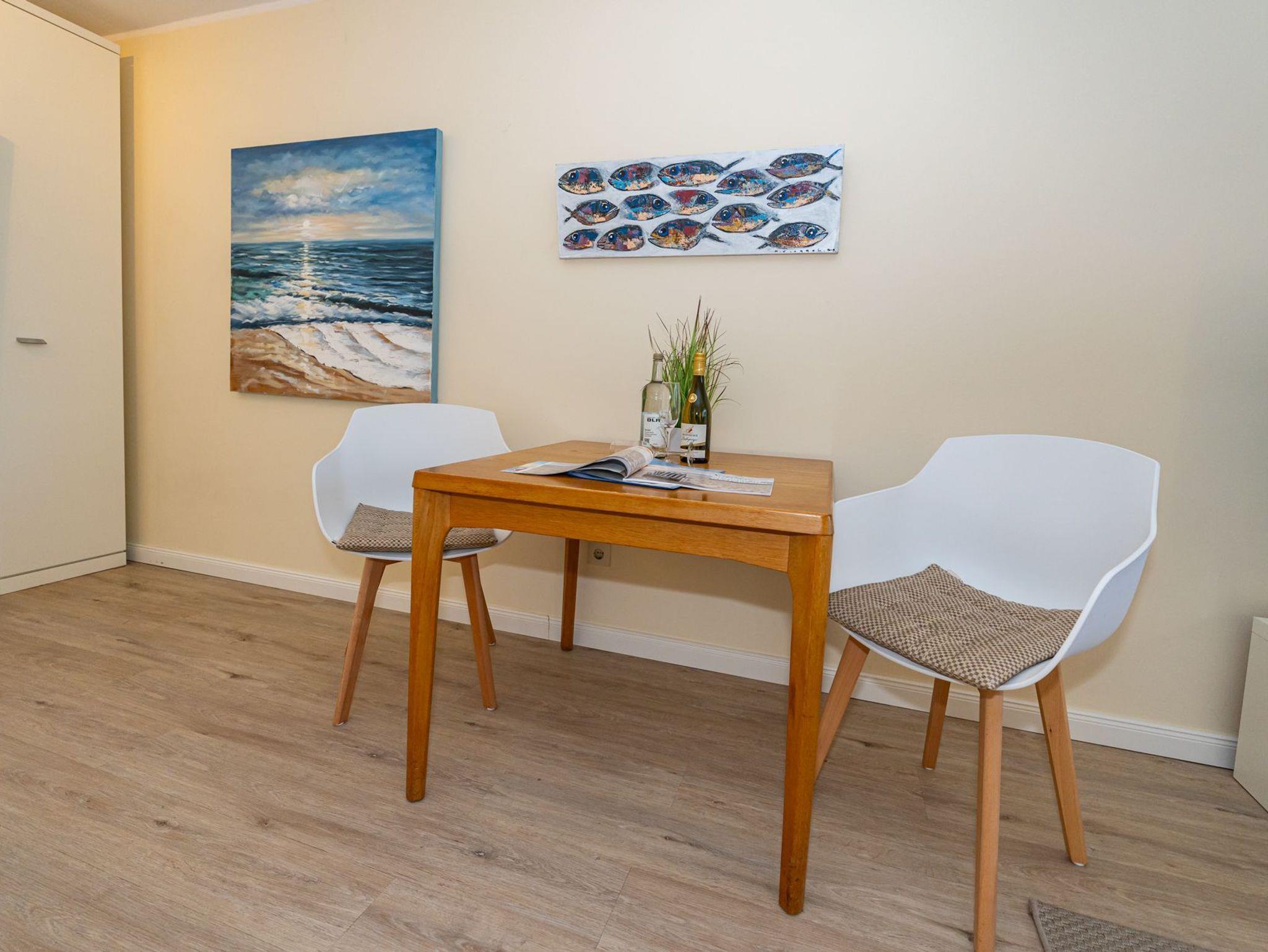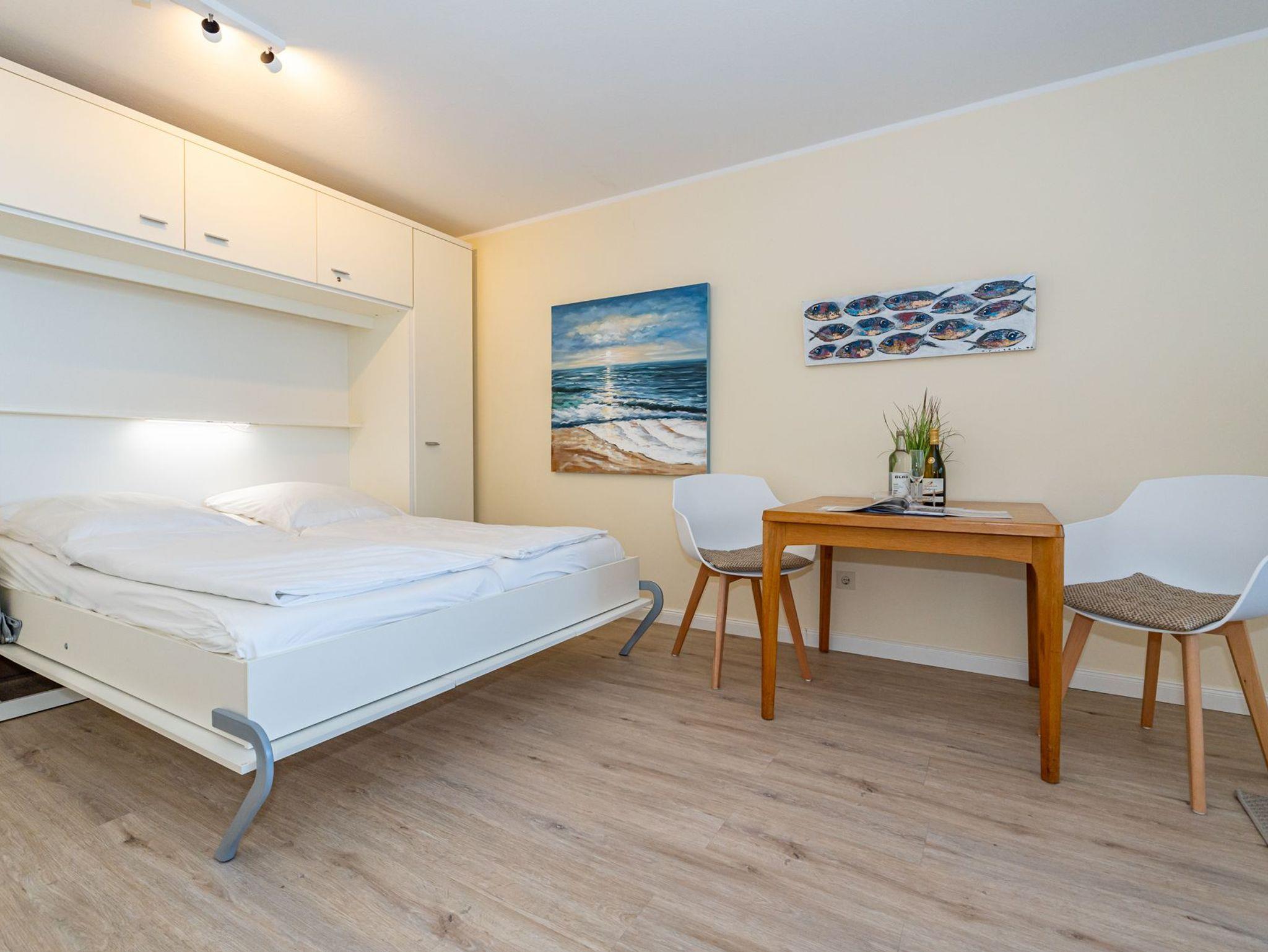 Der Wohn-/Schlafraum besteht aus einer gemütlichen Couchgarnitur (Schlafcouch, Liegefläche 1,60 x 1,90 m), einem Doppelschrankbett (Liegefläche 1,60 x 2m) , mit Einzelmatratzen, im Ganzen ausklappbar), einem Essplatz, Kabel-TV.