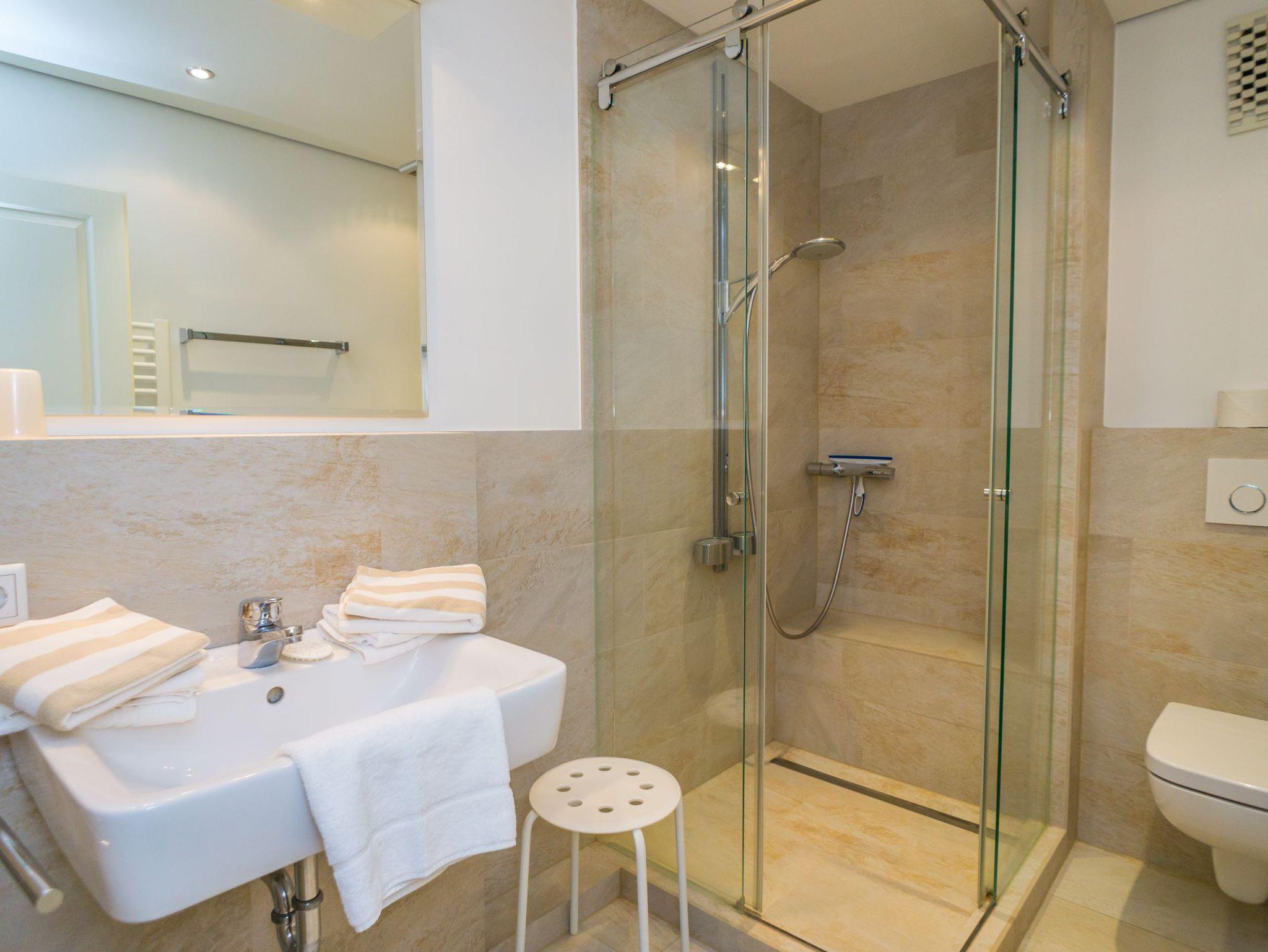Im neuen Badezimmer befindet sich eine Dusche, ein WC und ein Waschtisch, ein Föhn ist vorhanden