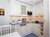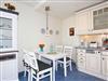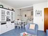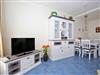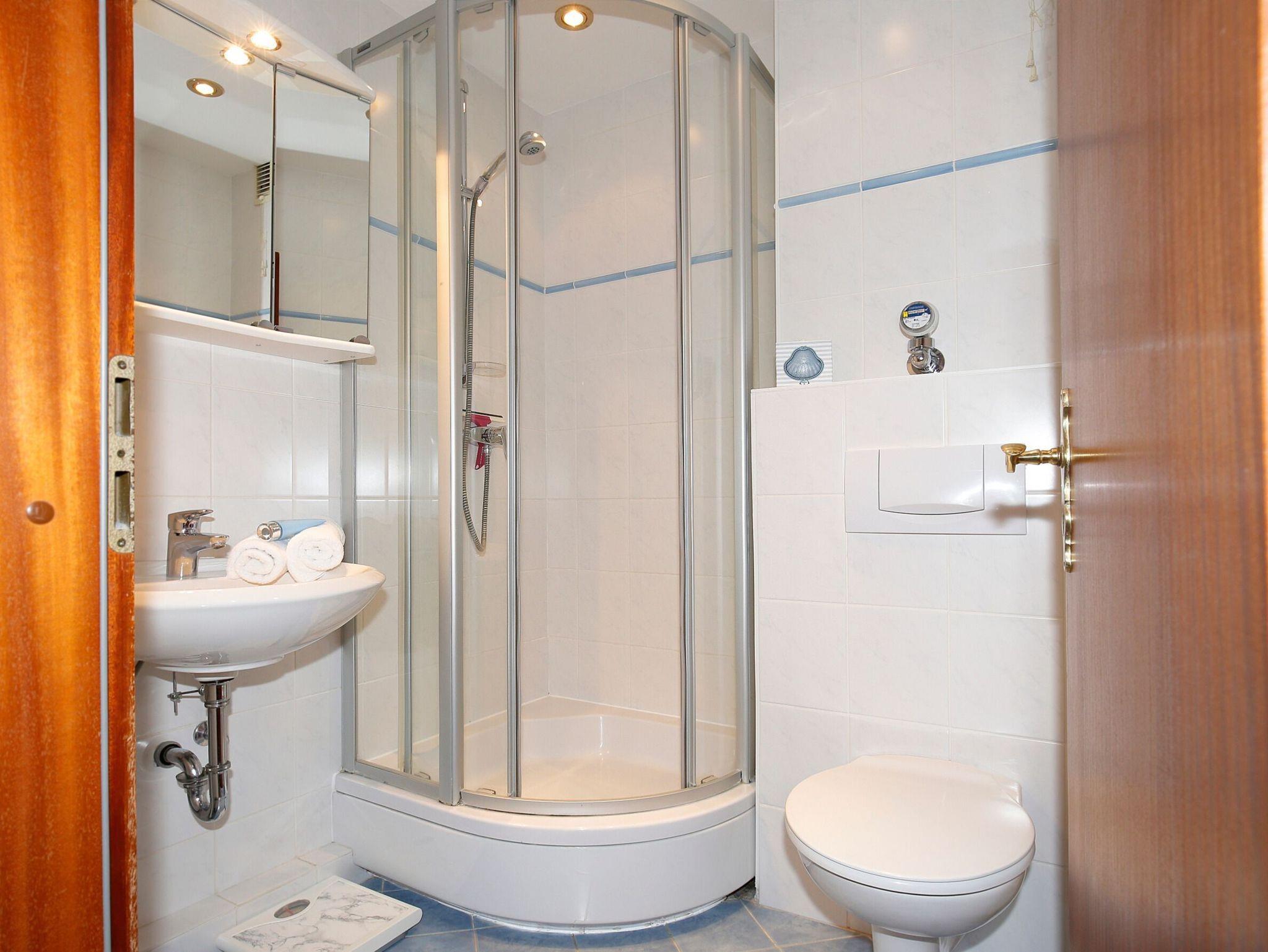 Die zum Wohnbereich offene Kochnische ist voll ausgestattet mit einem Geschirrspüler, einer Mikrowelle, einem Ceranfeld mit 4 Kochfeldern, einem Kühlschrank mit 3-Sterne-Gefrierfach und einem Fenster. Zur Grundausstattung zählen zudem Kaffeemaschine, Wasserkocher und Toaster. Das gemütliche Schlafzimmer ist mit einem Doppelbett eingerichtet, während das Badezimmer über eine Dusche, ein WC und einen Waschtisch verfügt.