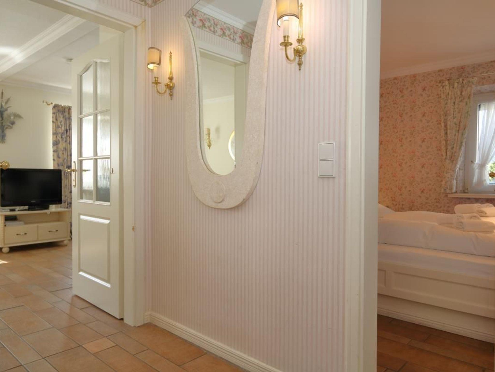 Die Wohnung ist für bis zu vier Personen nutzbar. Das Wohnzimmer hat zwei bequeme Couchgarnituren, die auch als weitere Schlafgelegenheit dienen. Der Küchenbereich mit dem Essplatz ist offen vom Wohnzimmer aus zugänglich. Die Einrichtung ist sehr gemütlich und stilvoll mit vielen liebevollen Details, unter anderem mit einem elektrischen Kamin, der sehr viel Gemütlichkeit ausstrahlt. Die Küche ist sehr hochwertig und komplett ausgestattet. Das Schlafzimmer hat ein Doppelbett. Im Bad ist eine großzügige Dusche mit vielen Funktionen. Vor dem Wohnzimmer ist die eigene, möblierte Südterrasse.