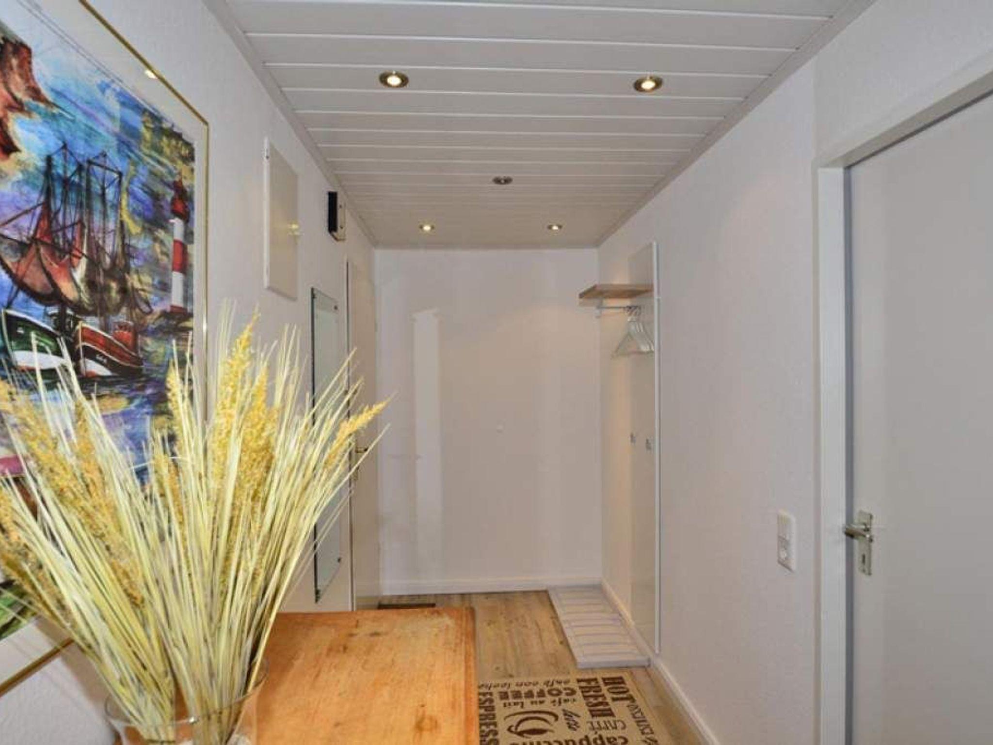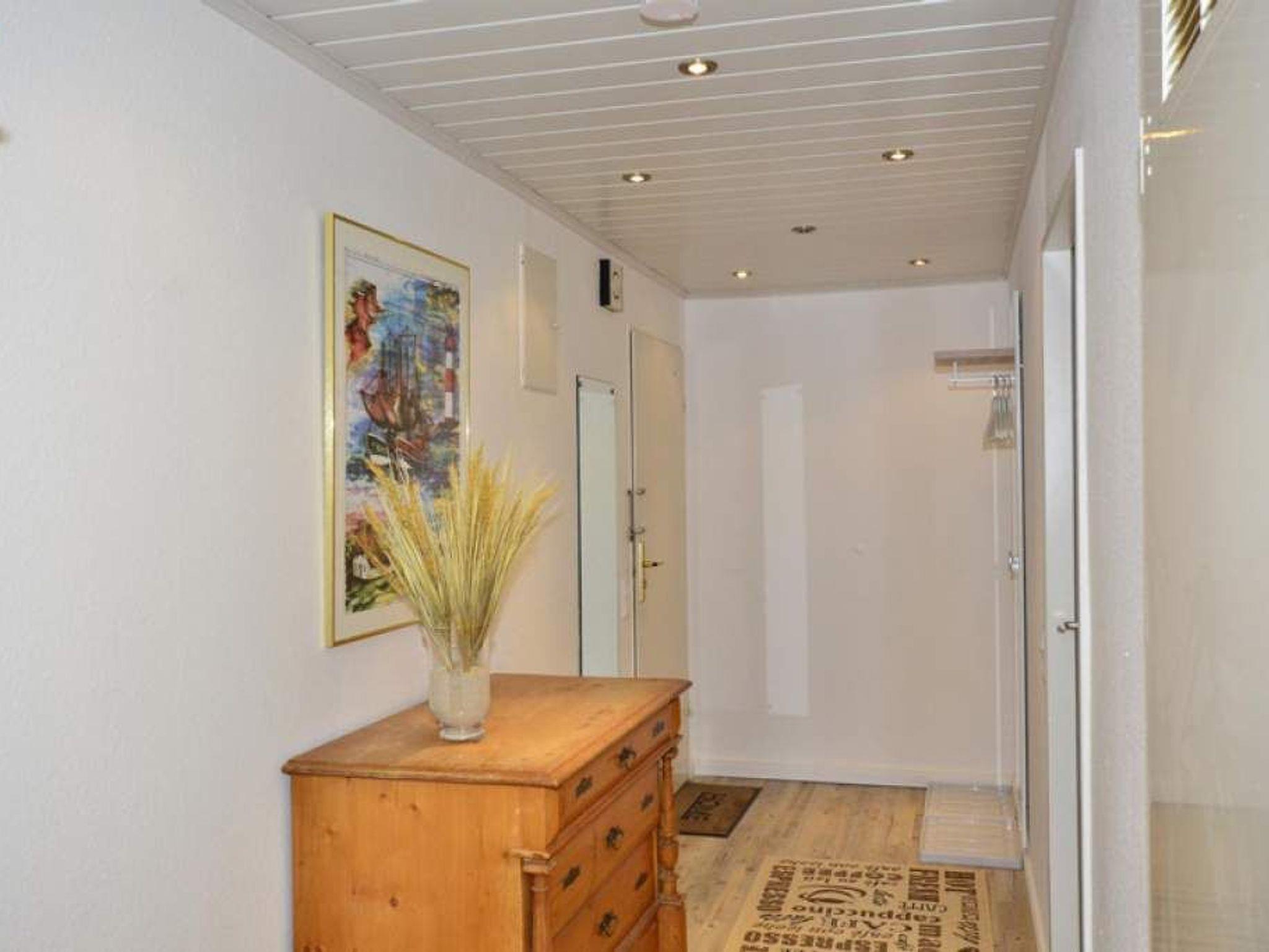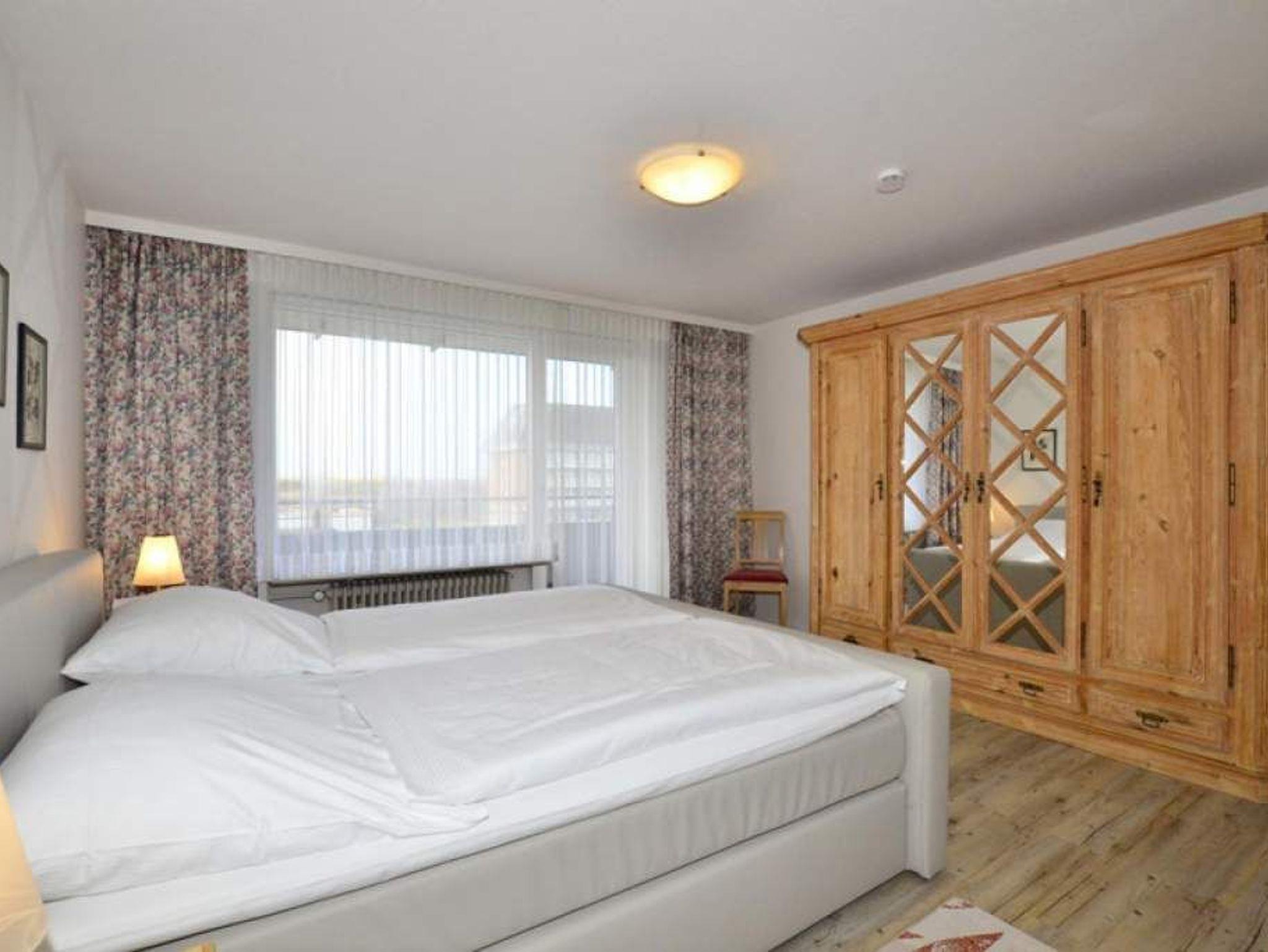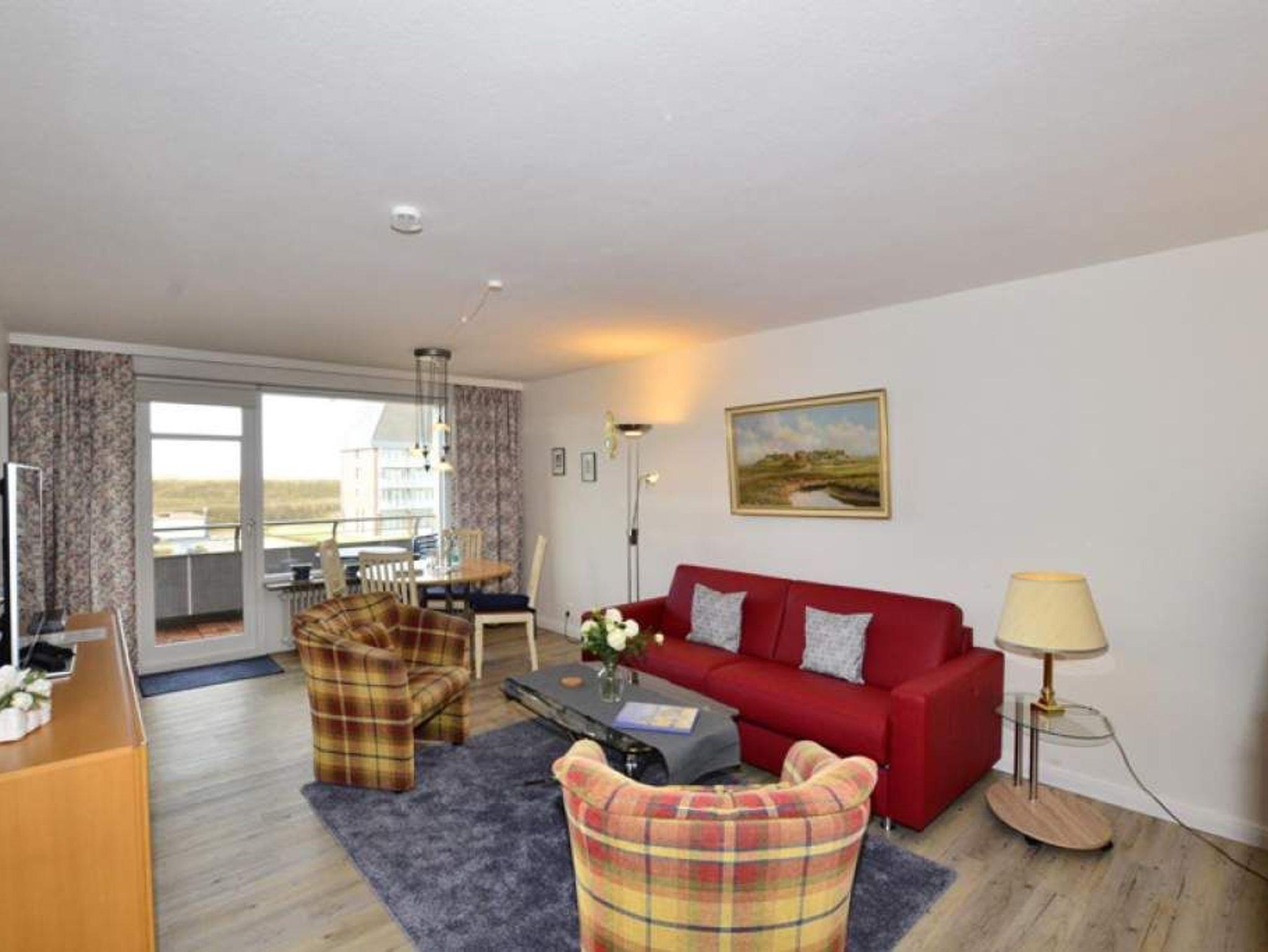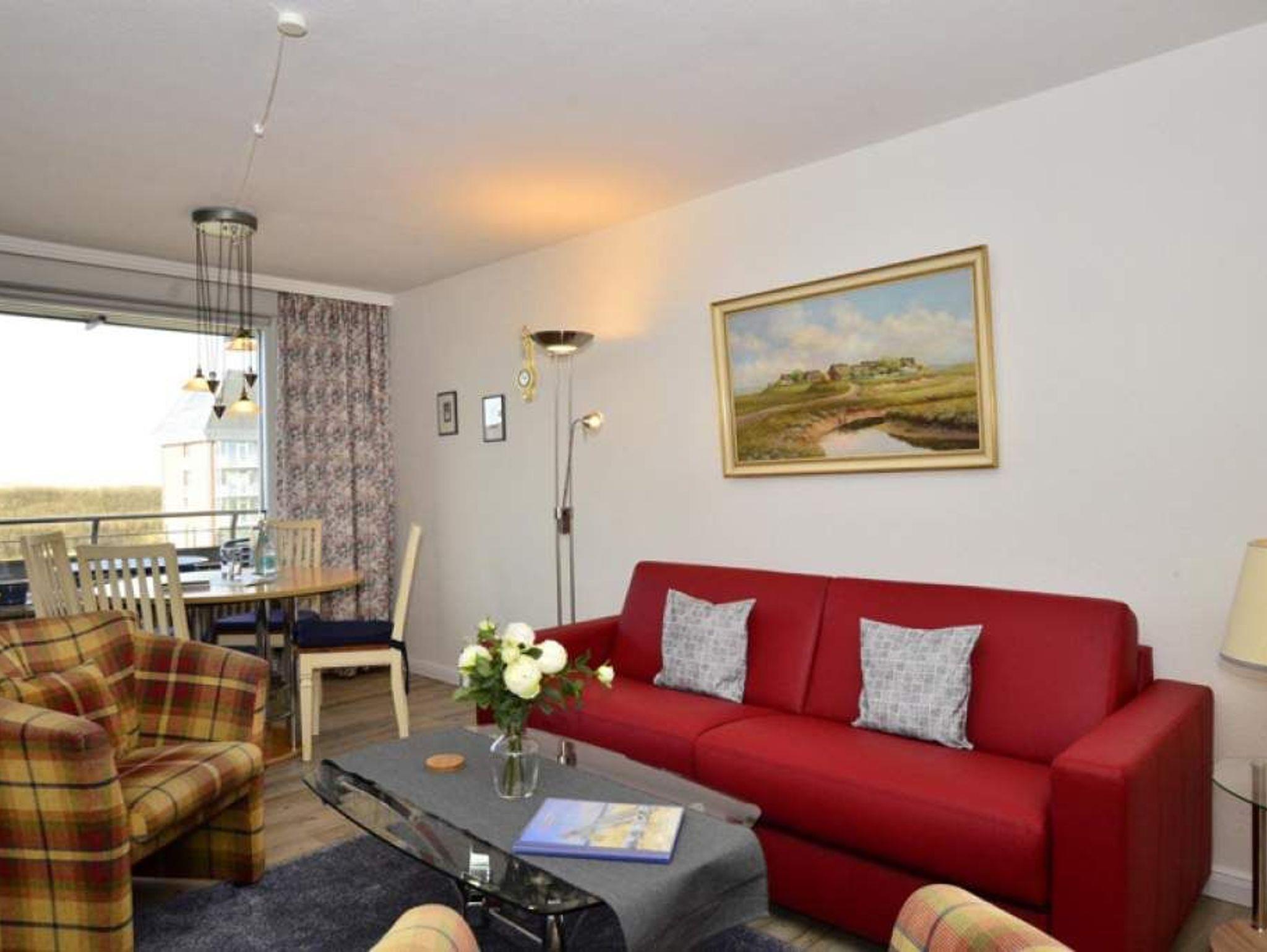 Der Wohnraum besteht aus einer bequemen Sitzgarnitur (2-Sitzer-Schlafcouch, 1,60 x 1,90 m und zwei Sesseln), einem Essplatz (direkt an der großen West-Fensterfront mit Dünenblick), Sat-TV, HiFi-Anlage, W-Lan und Zugang zur Westloggia.