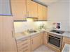 Kaffeemaschine, Wasserkocher und Toaster gehören zur Grundausstattung. Das großzügige Schlafzimmer hat ein Doppelbett (1,80 x 2,00 m, Komforthöhe 23 cm), einen geräumigen Kleiderschrank und bietet Zugang zu einer weiteren Loggia. Das neuwertige, hellgeflieste Bad hat eine Dusche, einen Waschtisch, einen Handtuchtrockner und WC.