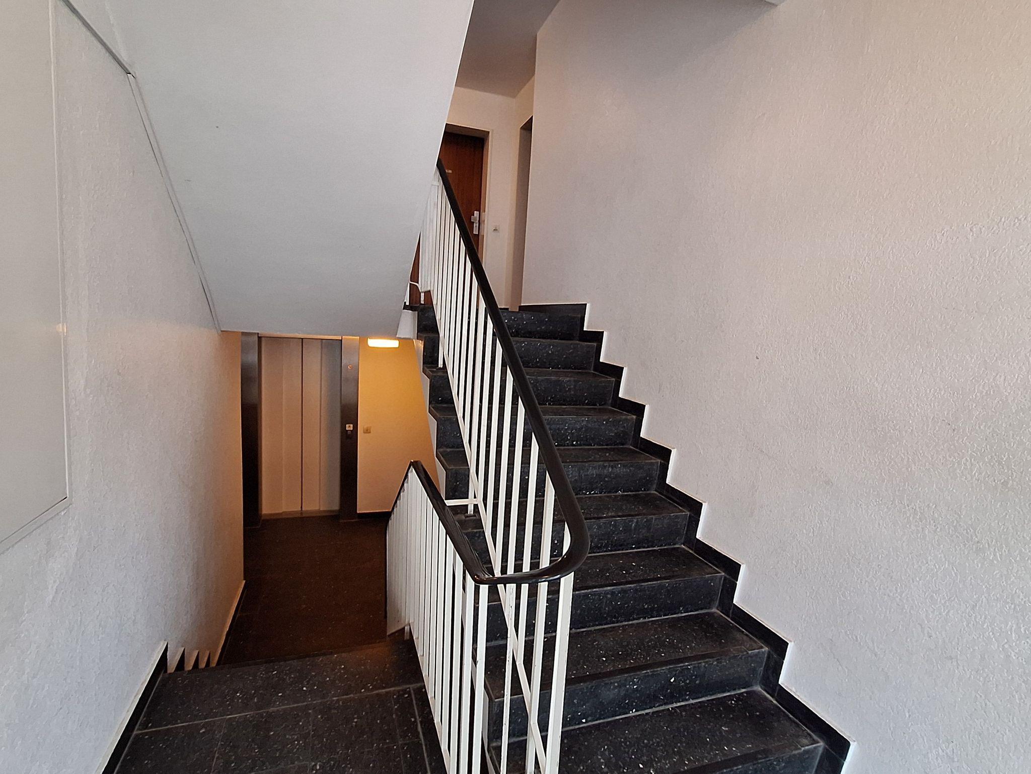 Der Aufzug ist über wenige Stufen erreichbar ? wahlweise vier Stufen abwärts oder neun Stufen aufwärts.