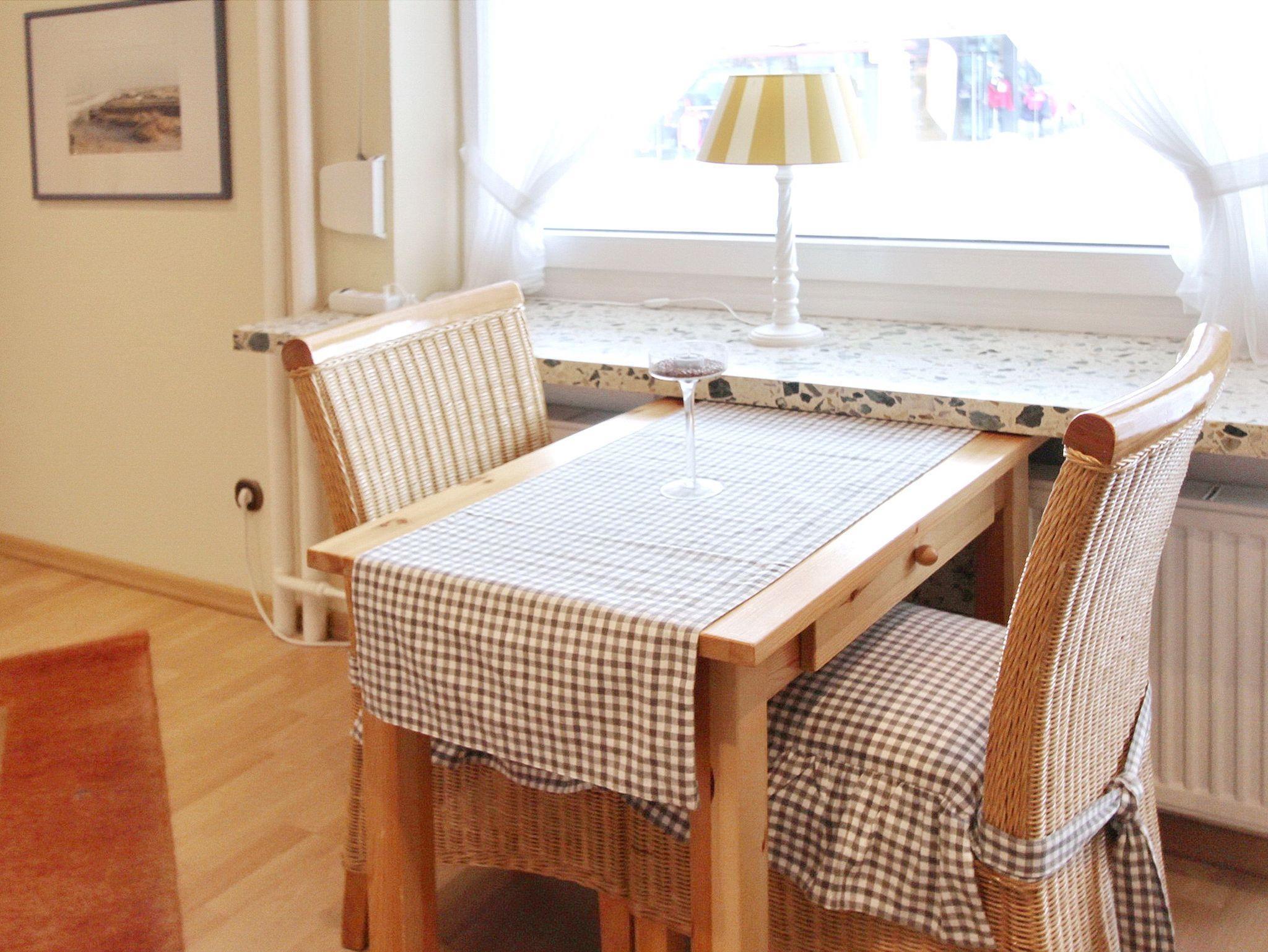 Hell und freundlich eingerichtete Ferienwohnung im Obererdgeschoss in zentraler Innenstadtlage. Der kombinierte Wohn-/Schlafraum mit Westbalkon (Balkonmöbel sind vorhanden) ist mit einem Doppelschrankbett, einem Essplatz mit 2 Stühlen am Fenster sowie einer bequemen Sitzgruppe und einem Sessel ausgestattet. Der Laminatboden sorgt für ein angenehmes Wohnklima. In der Küchenzeile im Flur mit Ceranfeld, Geschirrspüler und Mikrowelle mit Grillfunktion können sie sich selbst verpflegen. Das Badezimmer verfügt über eine Dusche und einen Handtuchtrockner. Zur technischen Ausstattung dieser Nichtraucherwohnung gehört: eine Stereoanlage mit CD und MP3 Spieler und ein Smartfernseher. Der freie WLAN Hot Spot (WEG A-D-5 - Passwortfrei - ohne Gewähr) kann genutzt werden. Wohnungsgröße: ca. 35 m².