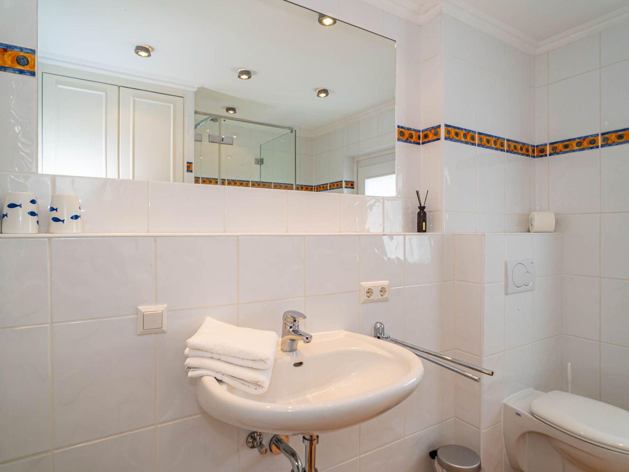 Im modernen Bad befinden sich eine Dusche, ein WC, ein Waschtisch und ein Fenster. Außerdem ein Fön.