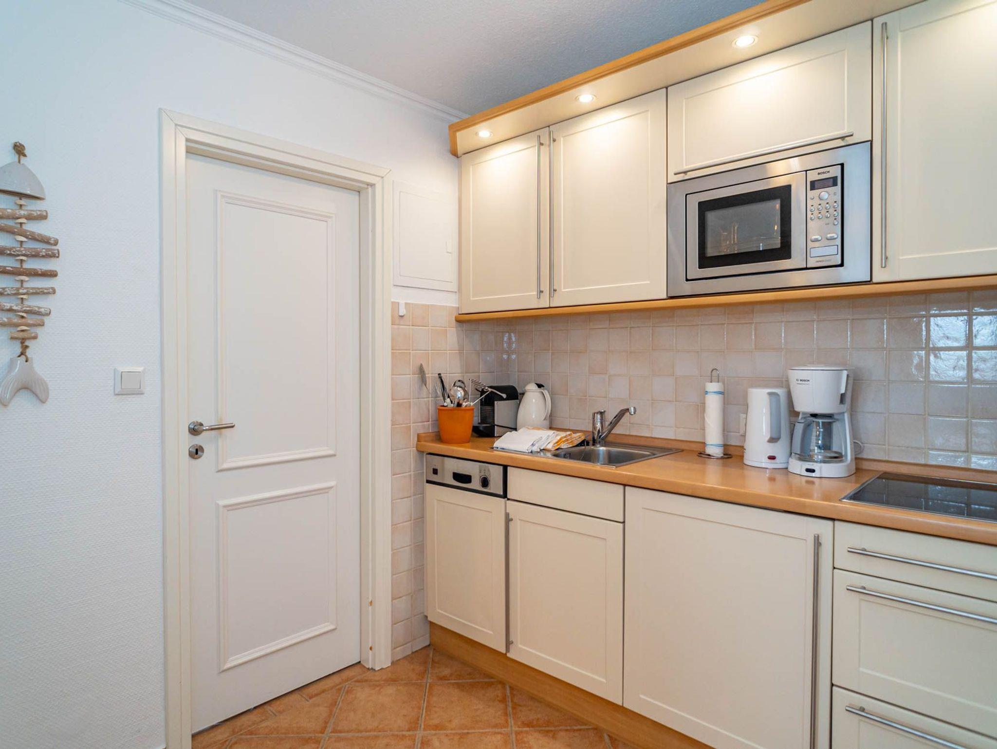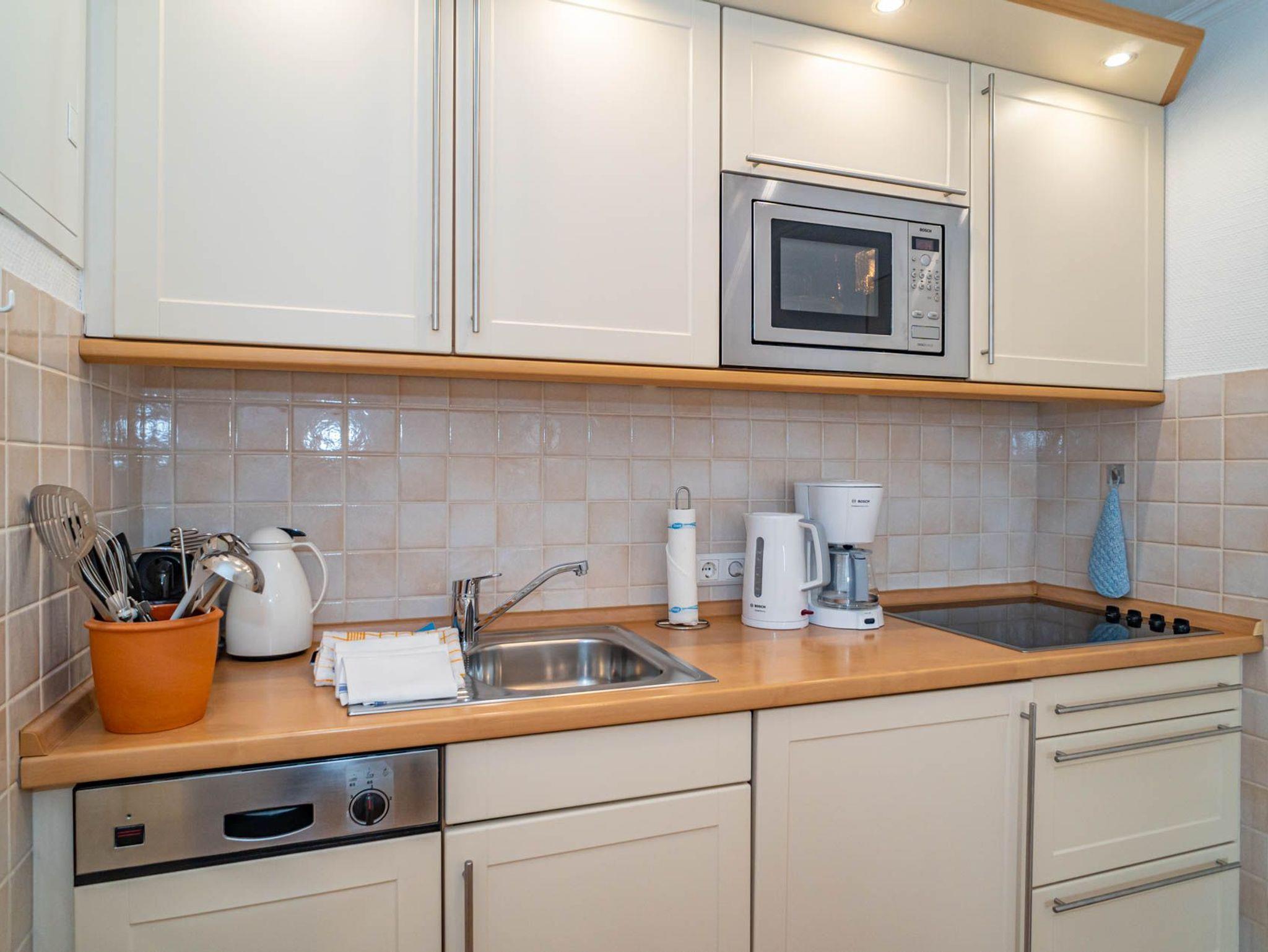 Die Küchenzeile hat einen Geschirrspüler, ein Cerankochfeld, eine Mikrowelle mit Grill und einen Kühlschrank mit 3-Sterne-Gefrierfach. Kaffeemaschine, Nespresso-Kapselmaschine, Wasserkocher, Eierkocher und Toaster gehören zur Grundausstattung.