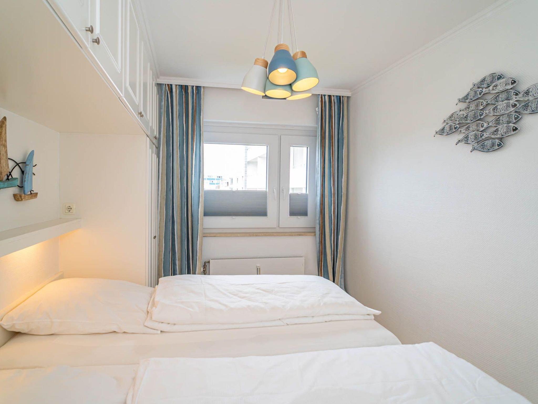 Das Schlafzimmer hat ein Doppelbett in der Größe 2,00 x 2,00 Meter mit zwei Einzelmatratzen.