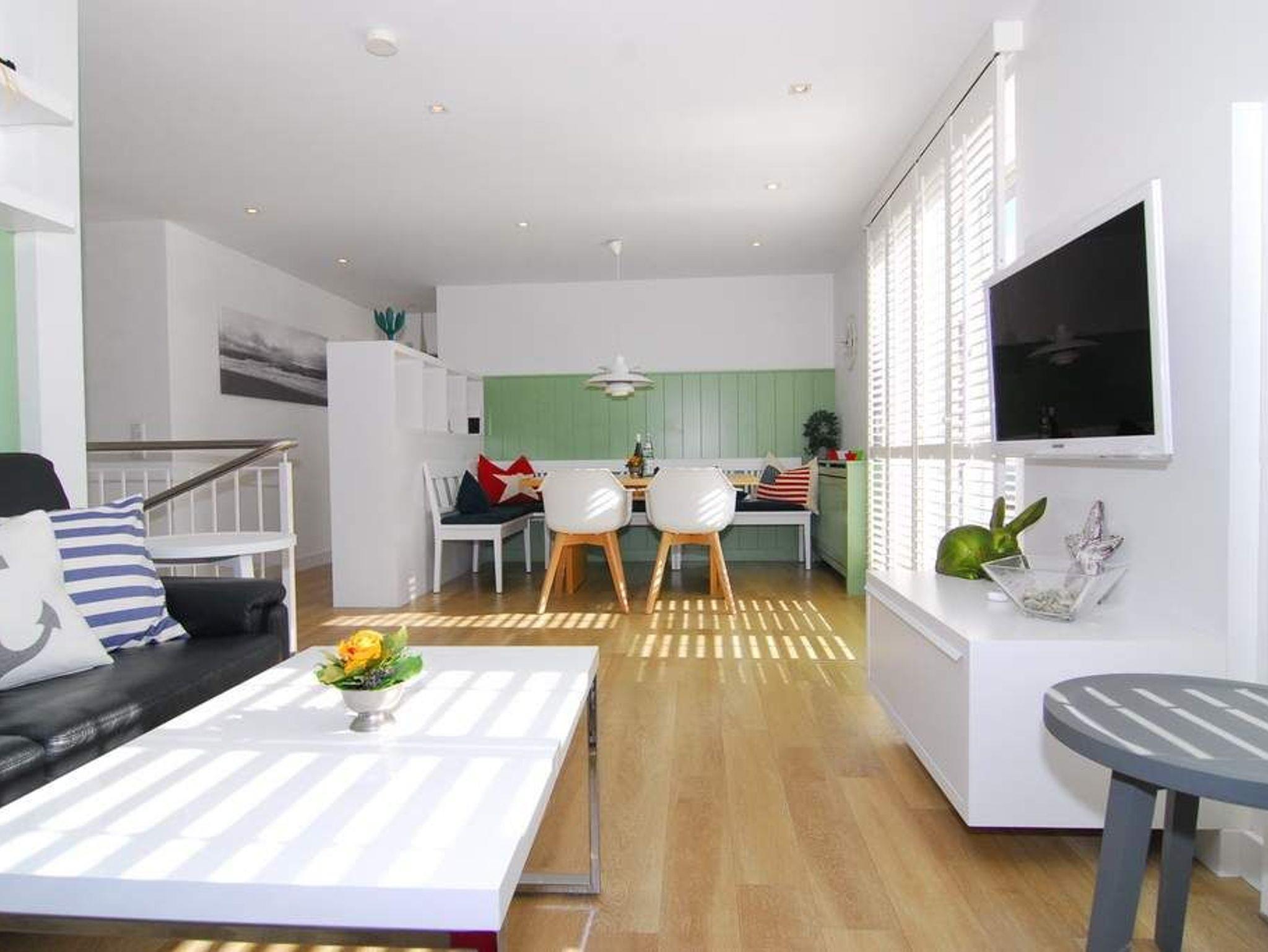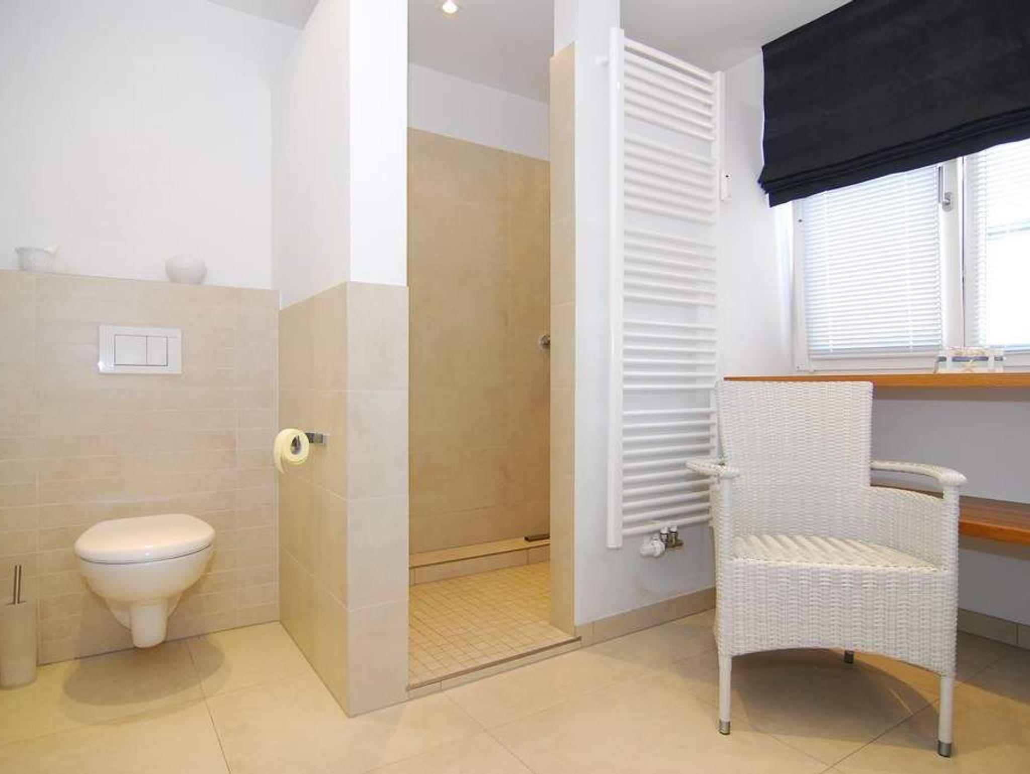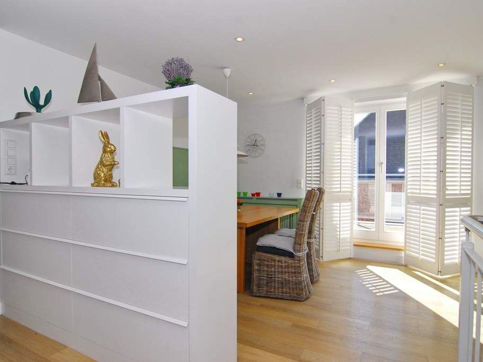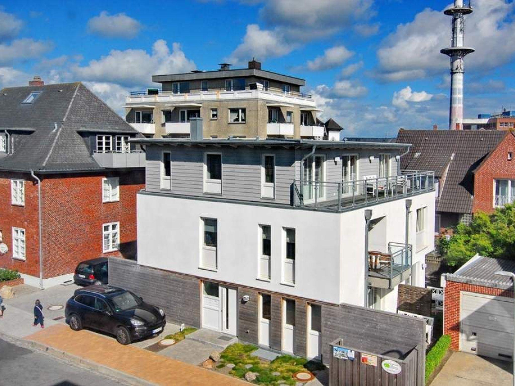 Exklusive 3-Zimmer-Ferienwohnung - Penthouse, 2. OG, ca. 90m², Nichtraucher, Wohnzimmer mit Couch, Sessel, Esstisch mit Eckbank und 2 Rattanstühlen, Flat-TV, WLAN (ohne Gewähr), Musikanlage, offene Küche mit Geschirrspüler, Mikrowelle und Backofen, Zugang zur Südterrasse, 1 Schlafzimmer mit Doppelbett, Einbauschrank und Flat-TV und Zugang zur Terrasse, 1 Schlafzimmer mit Etagenbetten (Matratzen 1x2m) Einbauschrank und Flat-TV, 1 großes Duschbad / WC, 1 Gäste-WC, Flur mit Garderobe, Abseite mit Waschmaschine, Pkw-Stellplatz am Haus. Tierhaltung ist nicht gestattet. Bettwäsche und Handtücher sind zur Anreise aufgezogen. Auf dem östlich angrenzenden Nachbargrundstück entsteht ein Neubauvorhaben mit Baubeginn Juli 2024 - geplante Fertigstellung Winter 2026. Hier kann es zu Lärmbelästigung kommen.