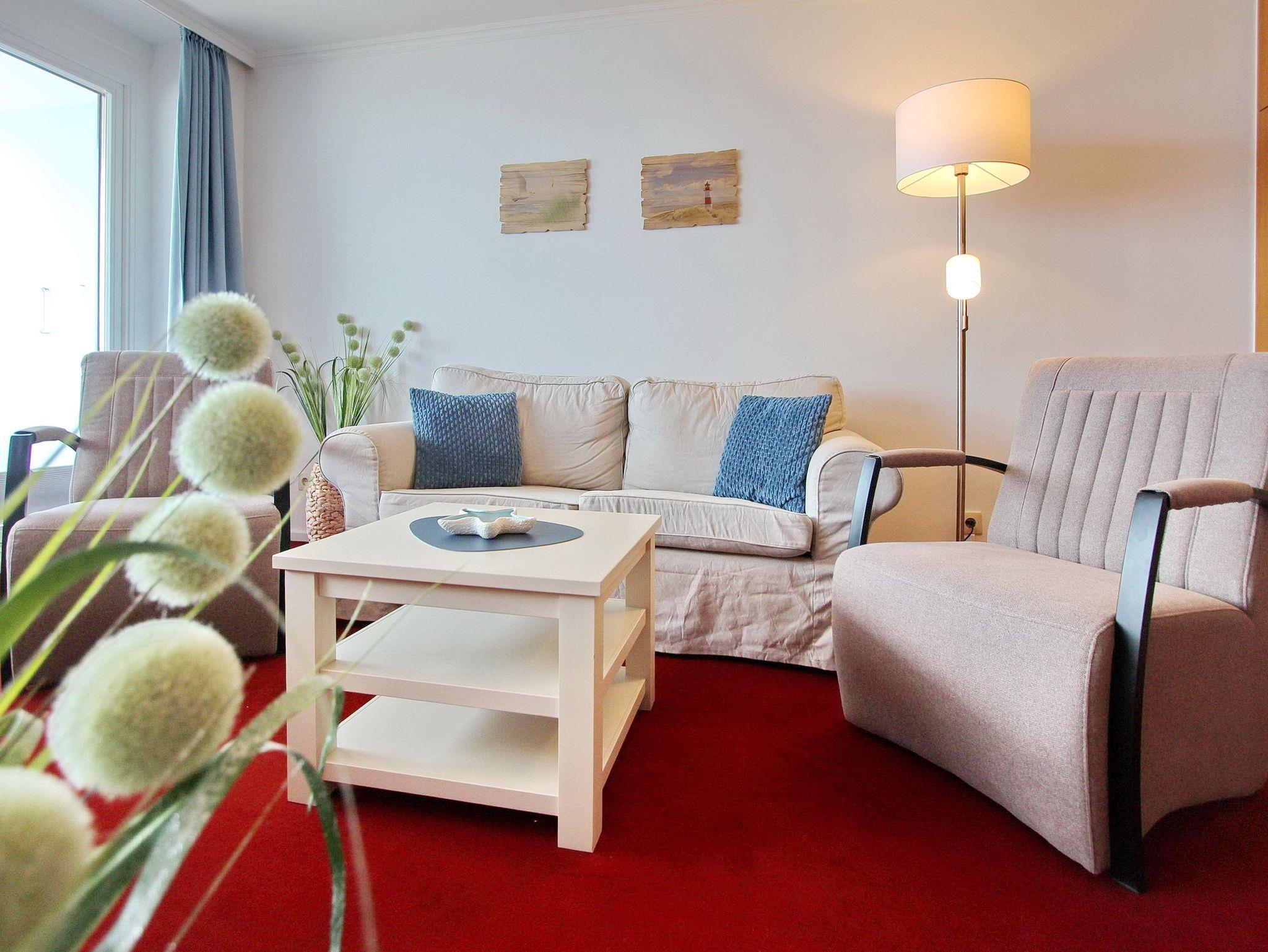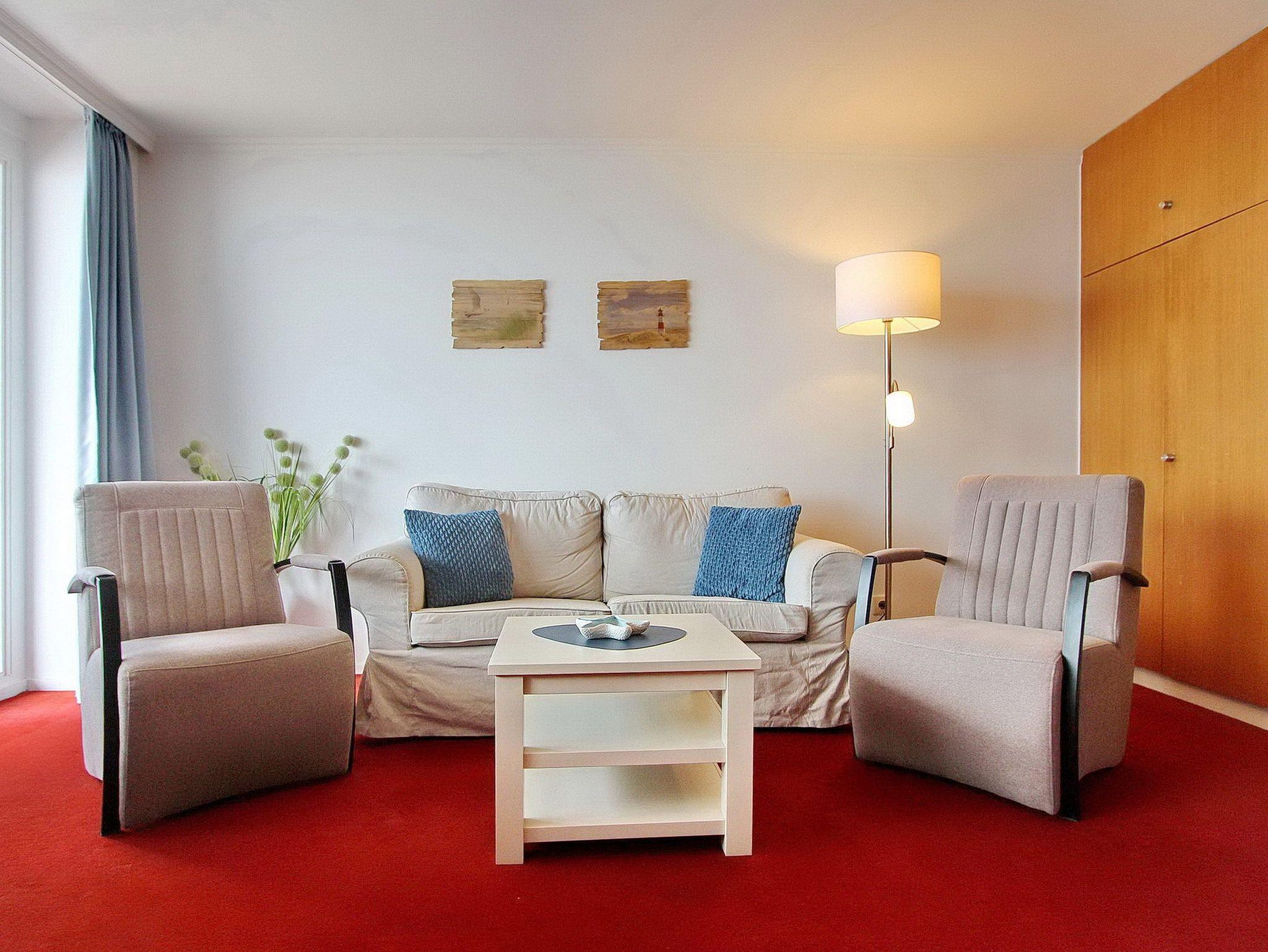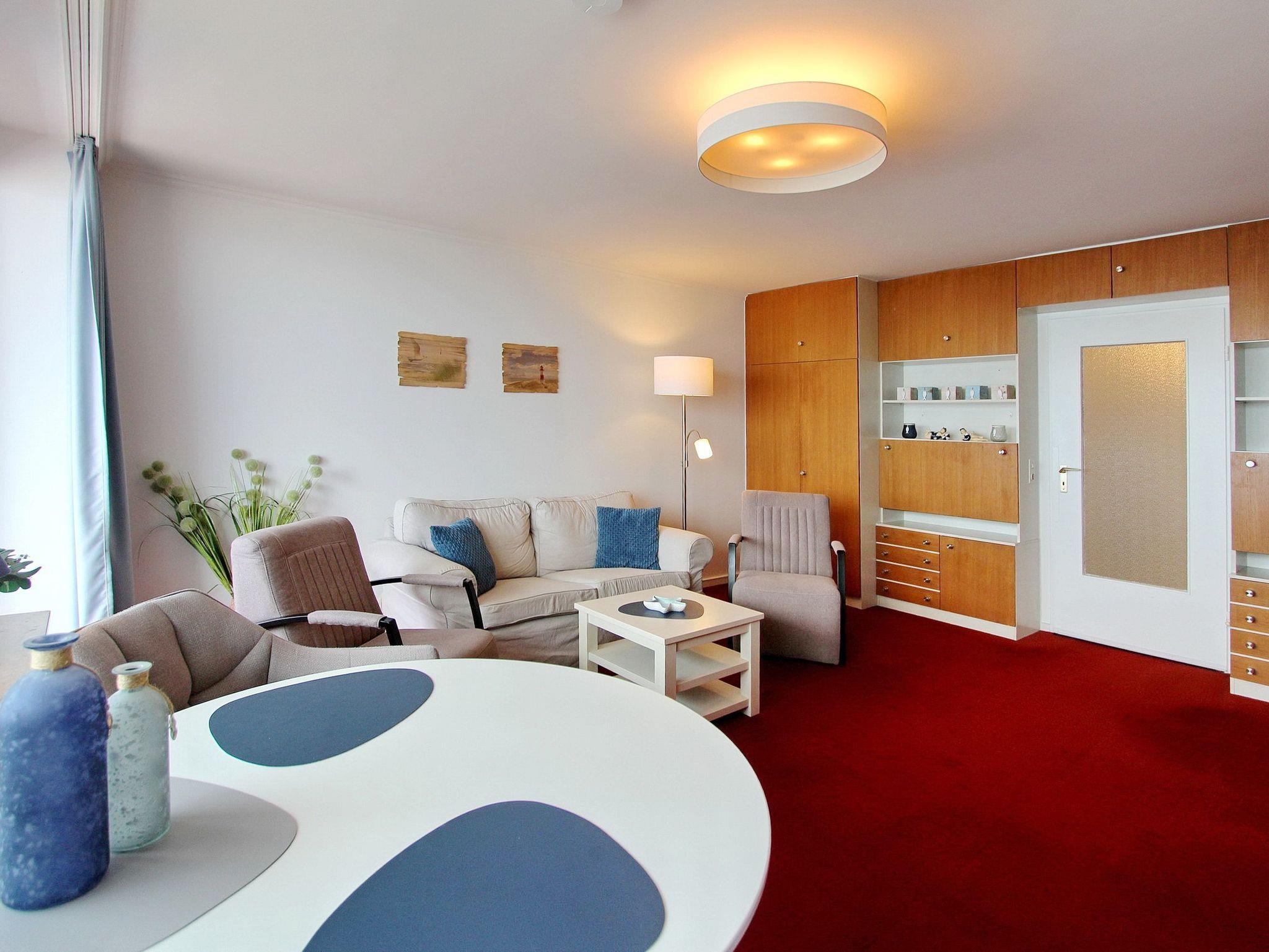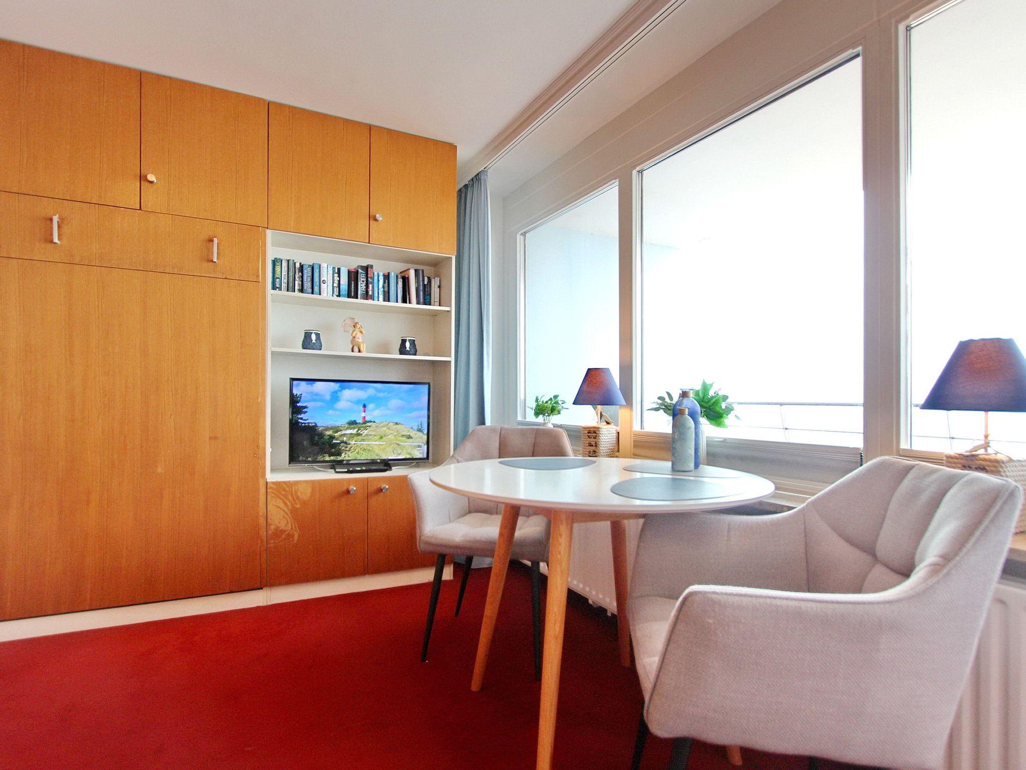 Einzimmerwohnung in der 11. Etagen im Haus Metropol mit einem herrlichen Blick über den Strand und die Nordsee. Der Wohn-/Schlafraum hat einen vorgelagerten Westbalkon mit Balkonmöbeln, zwei Einzelschrankbetten (mit Lücke zwischen den einzelnen Betten), einen Essplatz mit 2 Stühlen am Fenster und ein Sofa für 2 Personen. Zwei Sessel sind ebenfalls vorhanden. Der Mix aus alten und neuen Einrichtungselementen verleiht der Wohnung einen speziellen Look. Das Badezimmer hat eine Dusche (mit niedrigem Einstieg), einen Hocker, sowie einen Fön. In der separaten Küche mit Mikrowelle können Sie sich selbst verpflegen. Zur technischen Ausstattung gehört: ein 32 Zoll Flachbildfernseher von Panansonic und ein Radio mit CD Player. Ein freies WLAN Netzwerk (WEG Haus Metropol - Passwortfrei - ohne Gewähr) steht ihnen kostenfrei zur Verfügung. Wohnungsgröße: ca. 42 m².